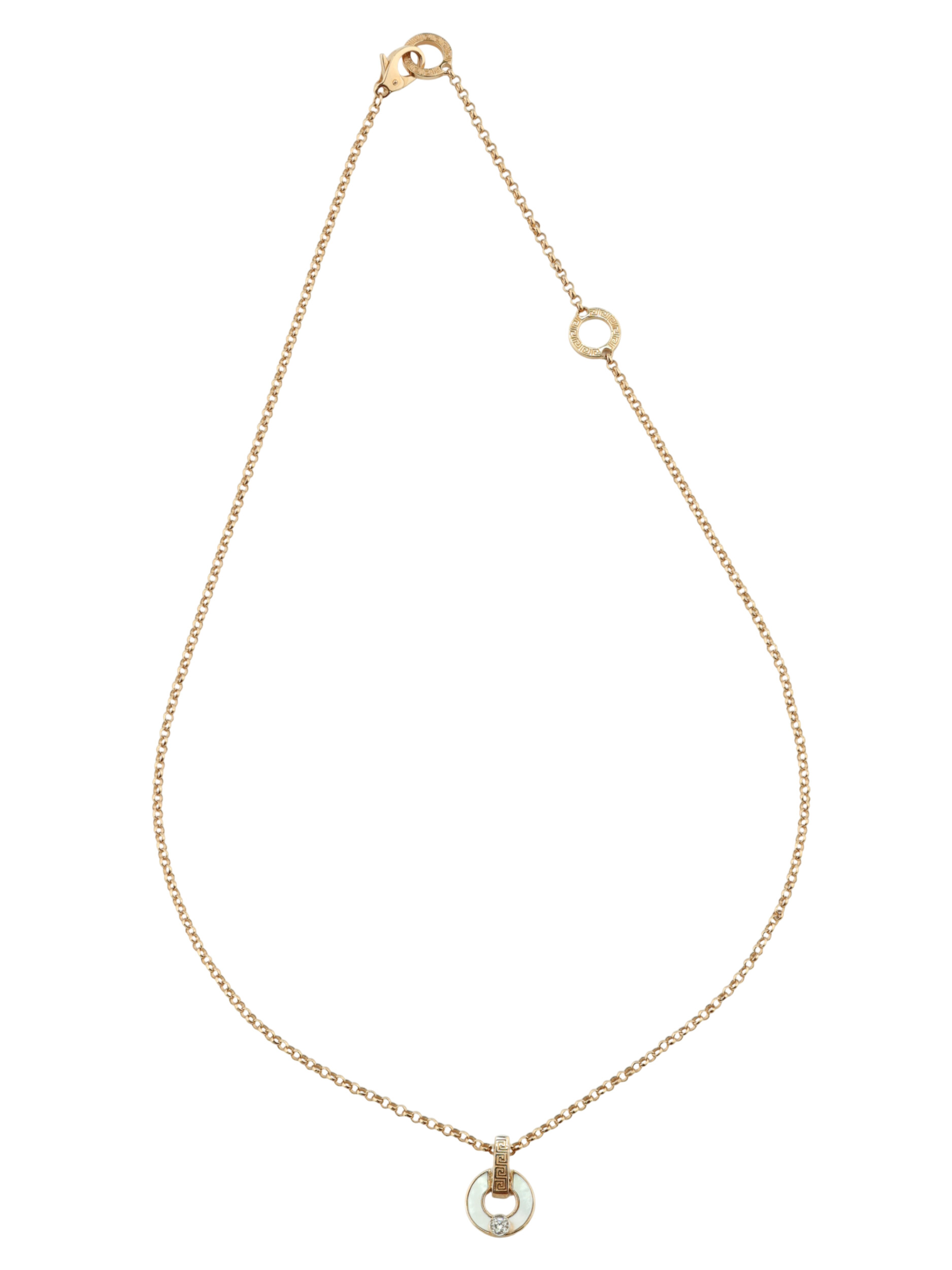 В центре композиции расположен сверкающий бриллиант круглой формы, который притягивает взгляд своей чистотой и блеском, контрастируя с нежным перламутром. Вставка из перламутра выполнена в форме полукольца, придавая изделию мягкое сияние и визуальную глубину. Белый цвет вставок идеально сочетается с красным оттенком металла, подчеркивая премиальный характер украшения.