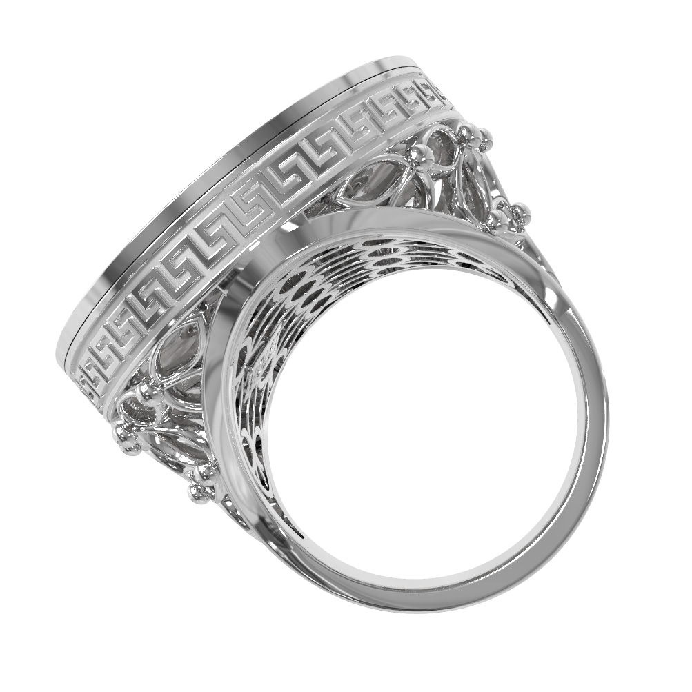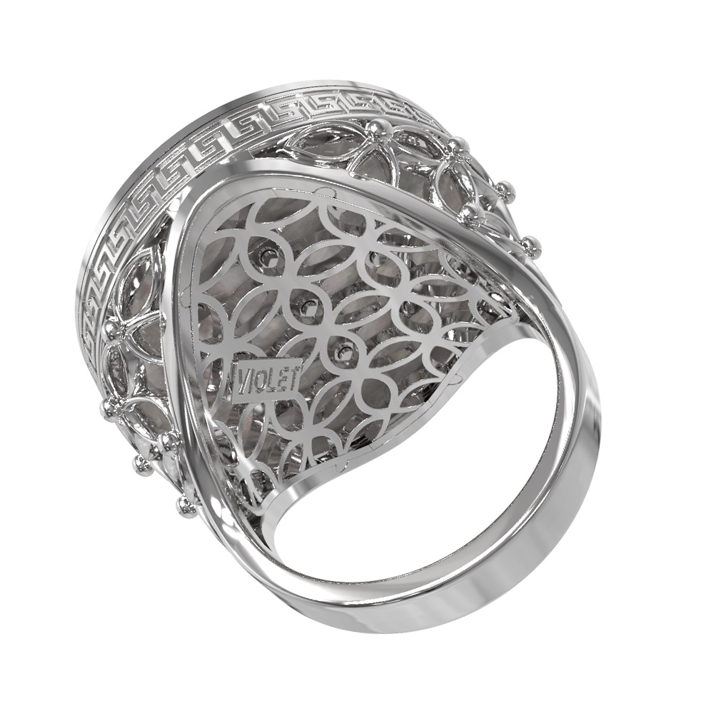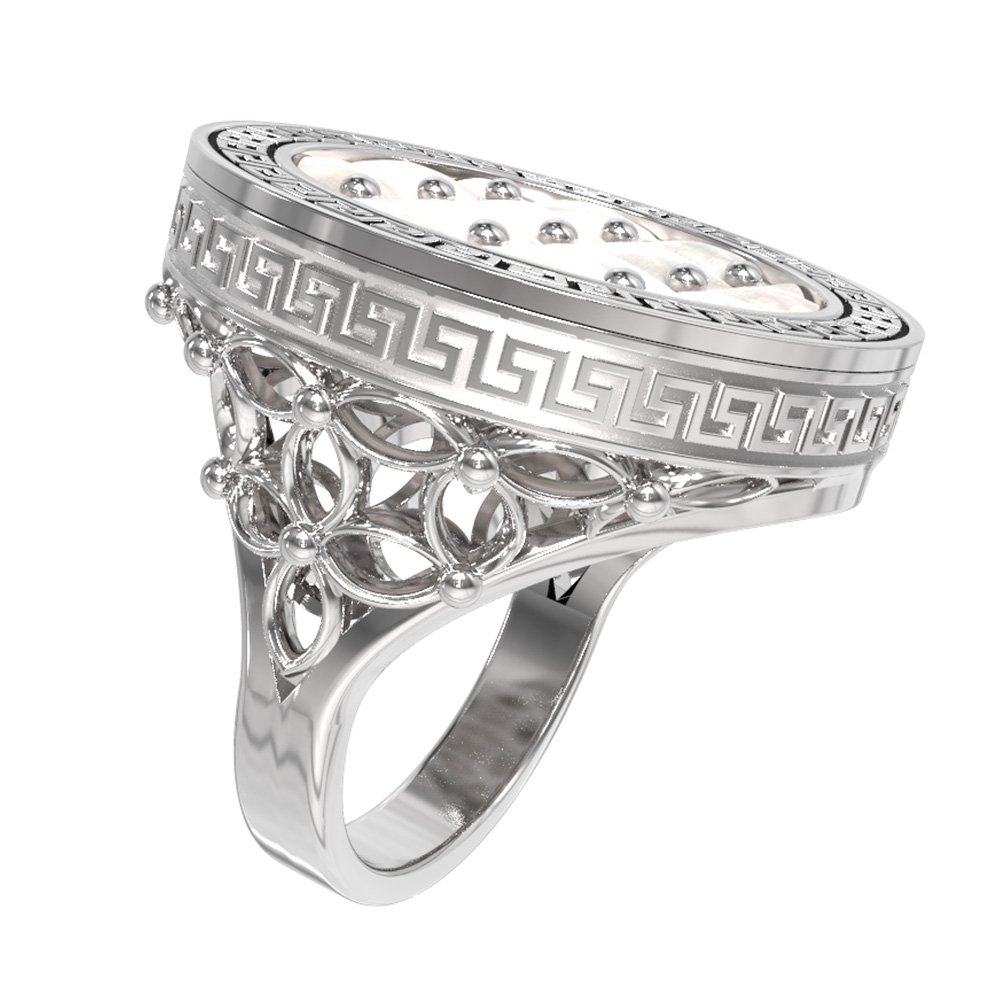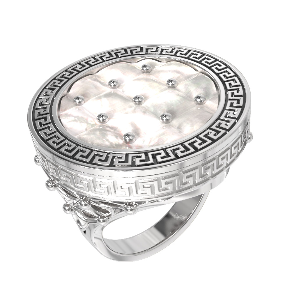 Геометрический узор в греческом стиле по периметру изделия подчеркивает его благородный характер и статусность. Благодаря сочетанию классических материалов, кольцо из белого золота с эмалью и перламутром станет центральным акцентом вашего образа. Лаконичная и при этом выразительная форма аксессуара позволяет носить его как женщинам, так и мужчинам, предпочитающим украшения с характером. Вы можете дополнить этот аксессуар другими изделиями, так как он идеально подходит для создания гармоничных комплектов.