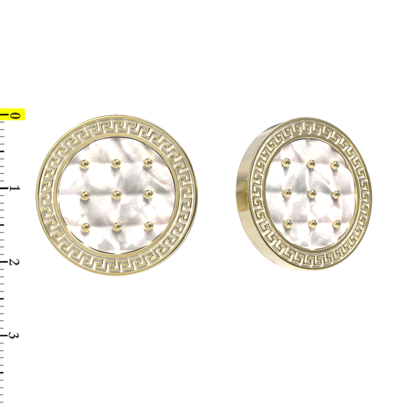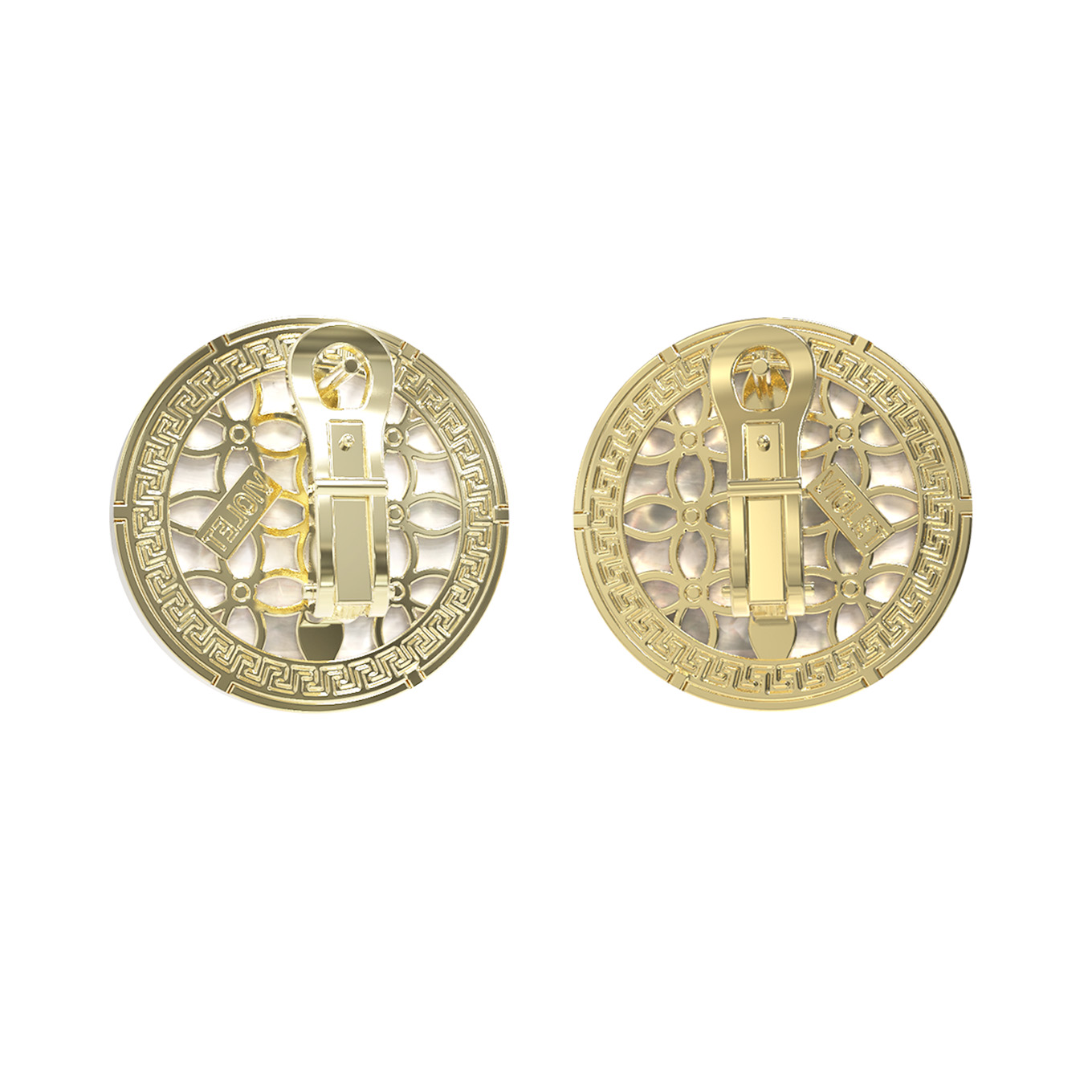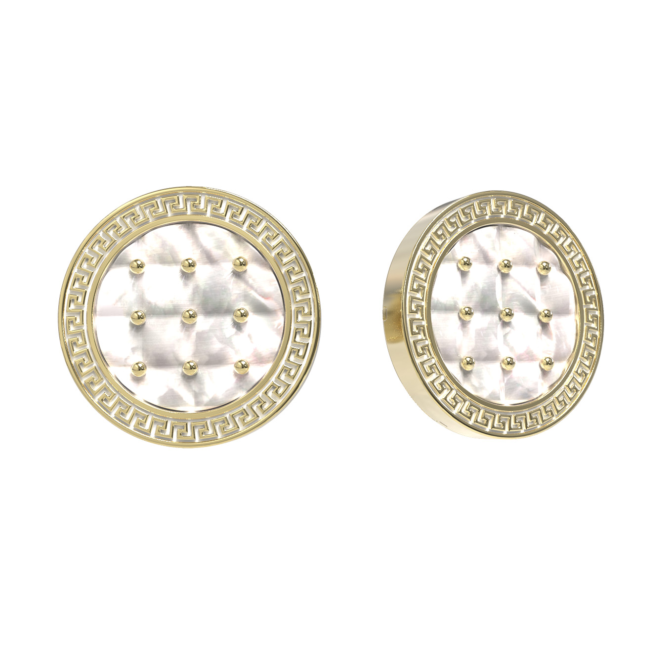 Центральную часть украшения занимает перламутр с его чарующим естественным сиянием, дополненный акцентами из качественной эмали. Сочетание лимонного золота, нежного перламутра белого цвета и эмалевого покрытия создает эффектный контраст, который привлекает внимание к лицу. Дизайн этих серег универсален — они подходят как для женщин, так и для мужчин, предпочитающих стильные и значимые аксессуары.