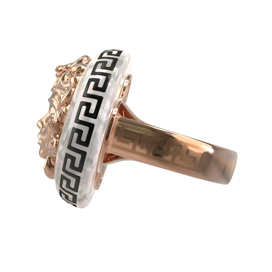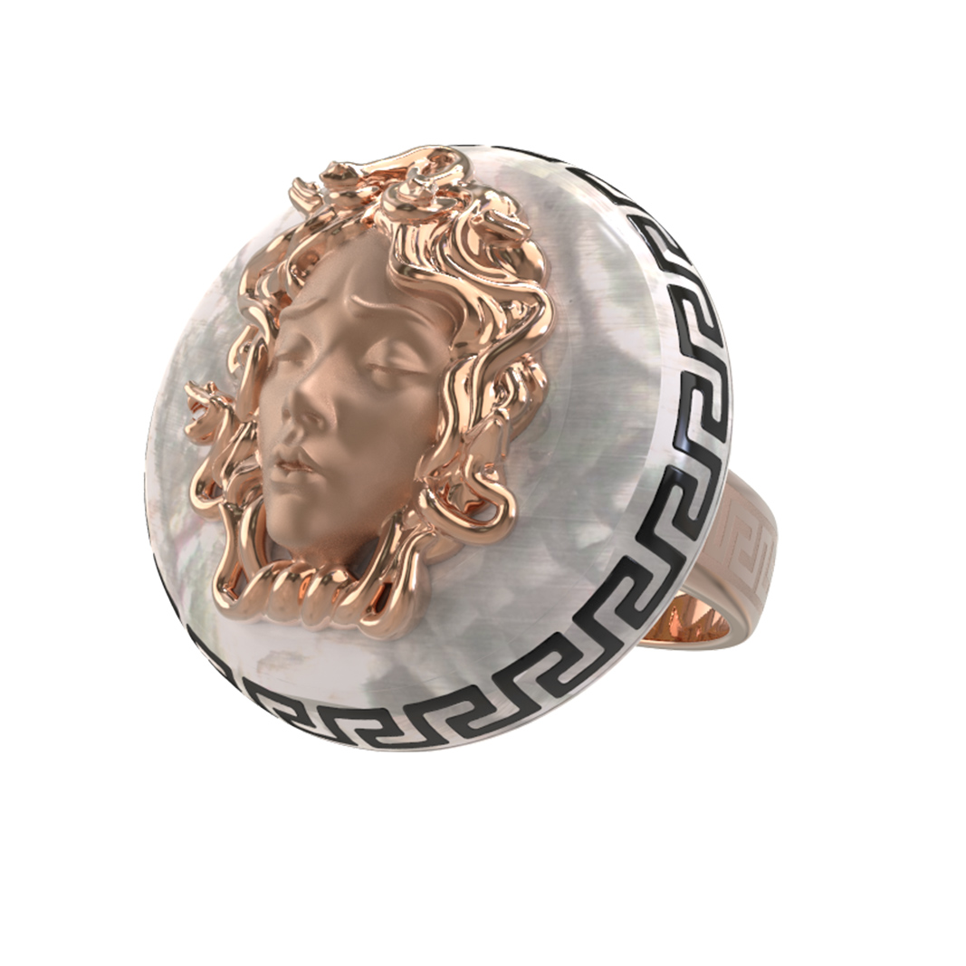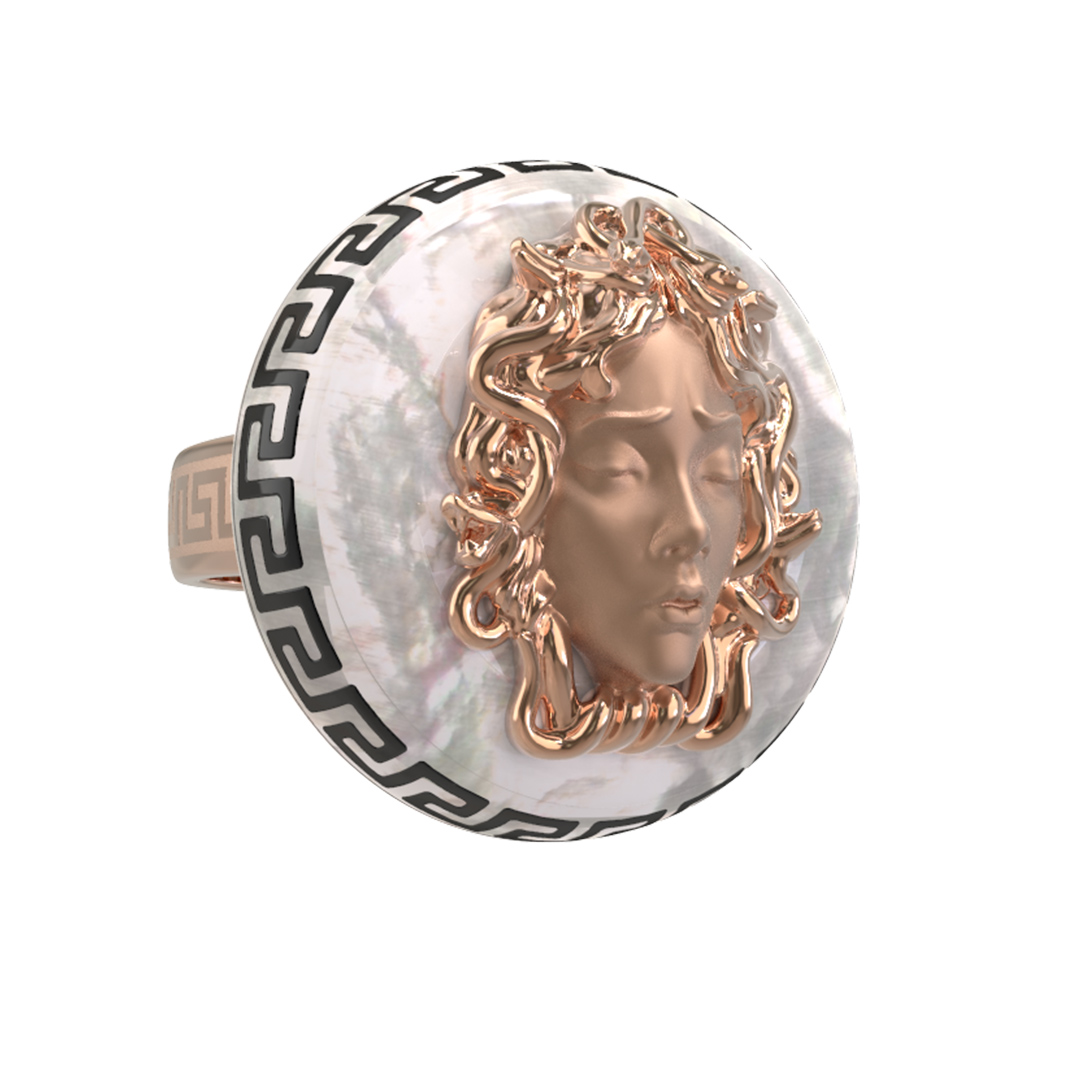 Откройте для себя воплощение мифологического искусства в этом изысканном кольце из коллекции De Luxe — Медуза. Данное изделие выполнено из красного золота 585 пробы и представляет собой настоящее произведение ювелирного мастерства. Центральным элементом дизайна, вдохновленного античными мифами, является детализированное изображение лика, обрамленное в круглую форму. Контрастное сочетание теплого оттенка красного золота, нежного перламутра и акцентной черной эмали создает гармоничную и притягательную композицию, которая сразу обращает на себя внимание.
