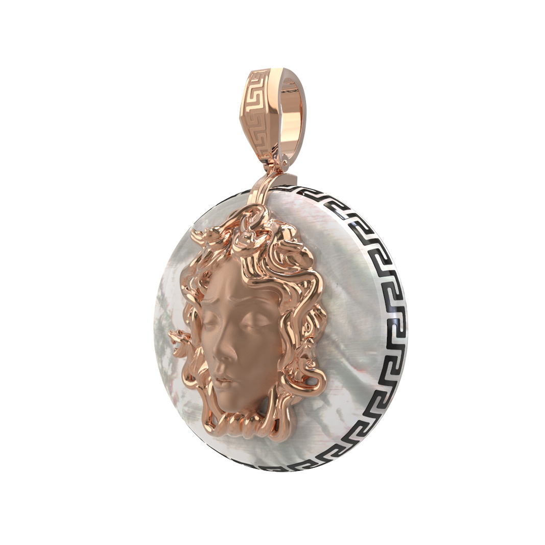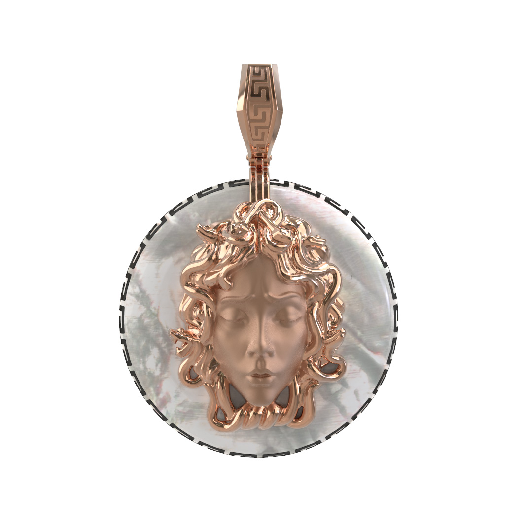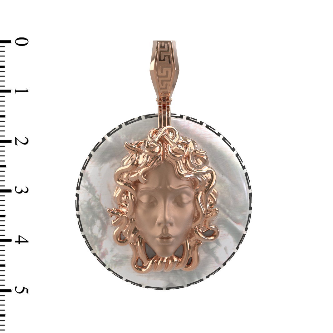 Подвеска из коллекции De Luxe — Медуза — это воплощение мифологической эстетики в современном ювелирном исполнении. Центральным элементом украшения является изысканный образ Медузы, выполненный из красного золота 585 пробы. Детально проработанные черты лица и сложные переплетения в дизайне подчеркивают мастерство исполнения и придают изделию особую глубину. Фон из благородного перламутра круглой формы создает мягкое сияние, контрастируя с выразительной золотой фигурой.