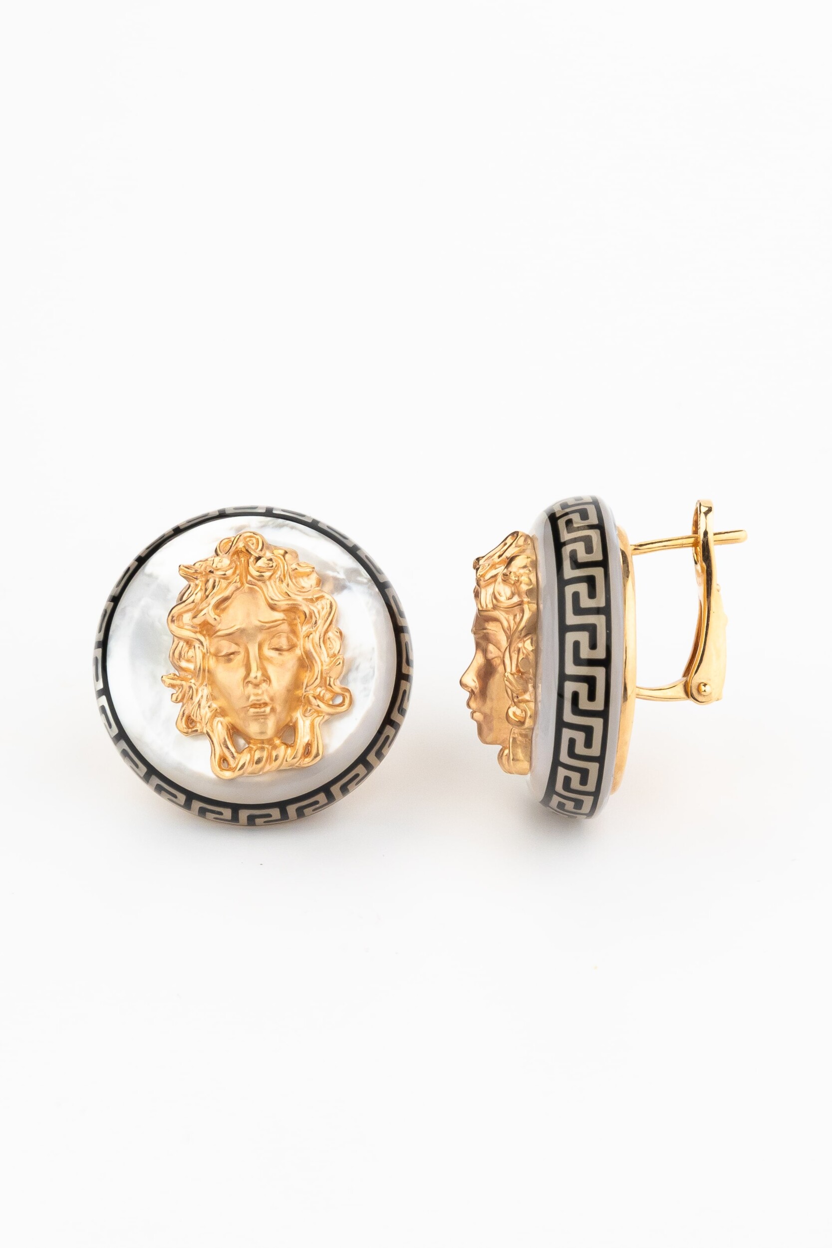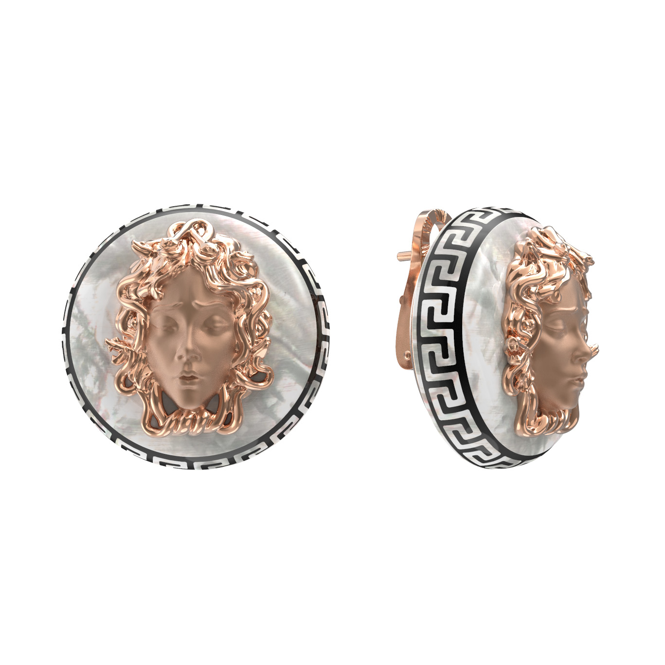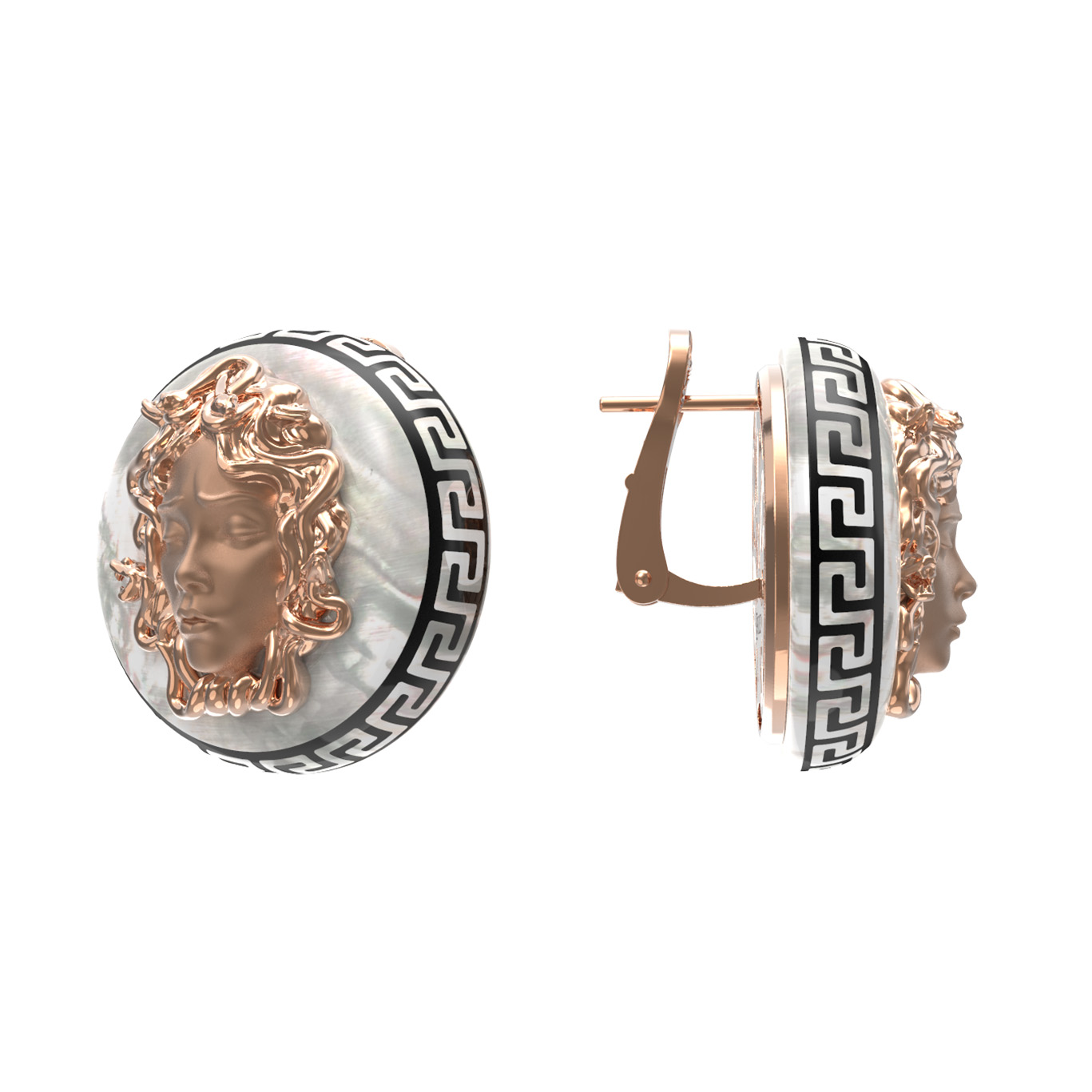 Погрузитесь в атмосферу древних мифов и высокого ювелирного искусства с серьгами из коллекции De Luxe — Медуза. Это украшение создано для тех, кто ценит символизм и безупречное мастерство исполнения. Центральным элементом дизайна выступает изящный барельеф, вдохновленный античной мифологией, выполненный из красного золота 585 пробы. Мягкий блеск металла контрастирует с глубиной черной эмали, которой украшен геометрический орнамент по ободу изделия, создавая эффектный акцент.