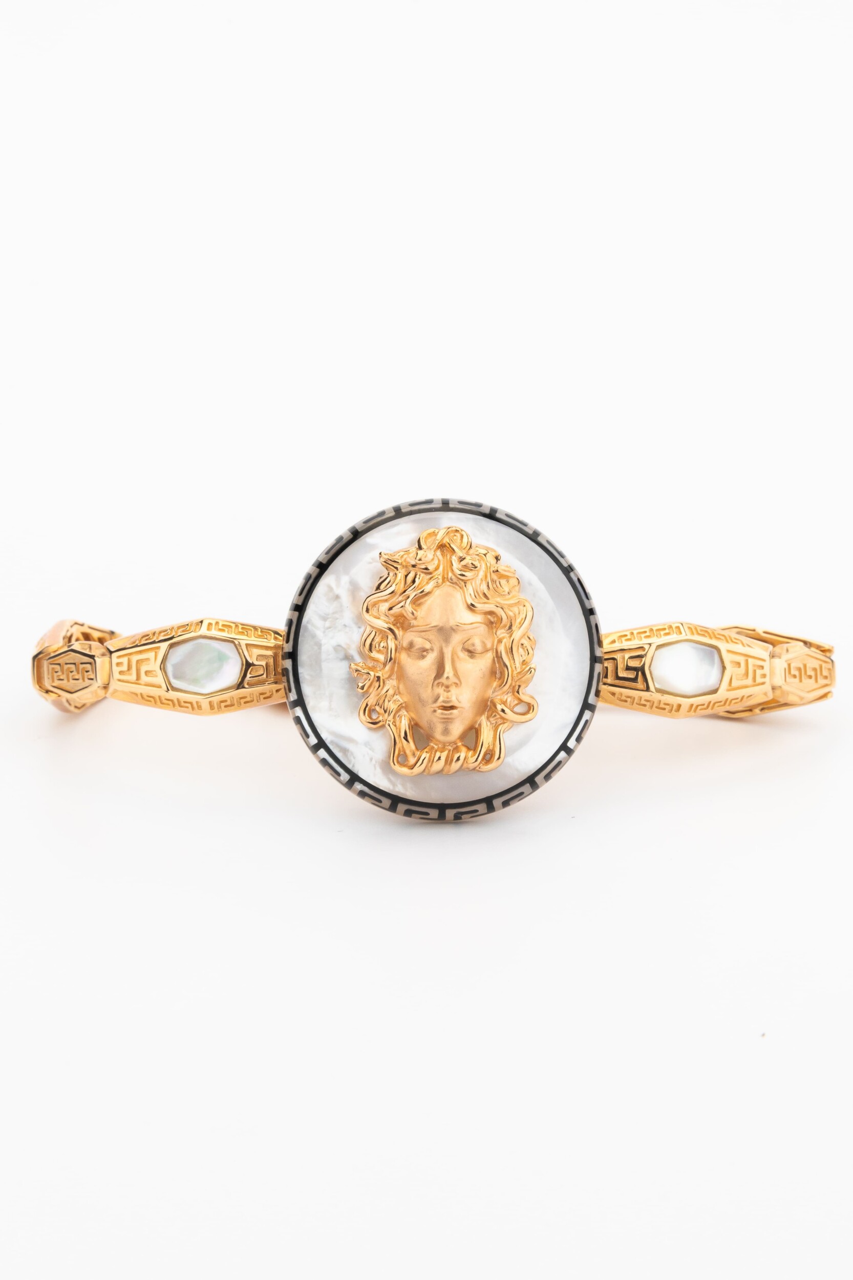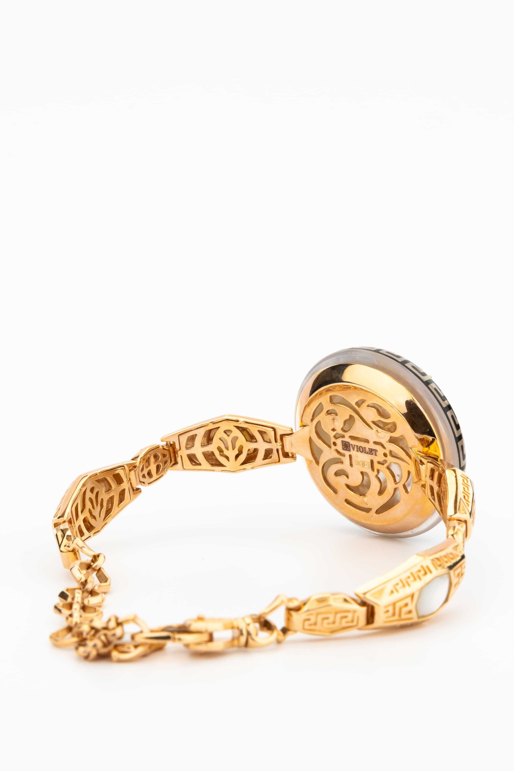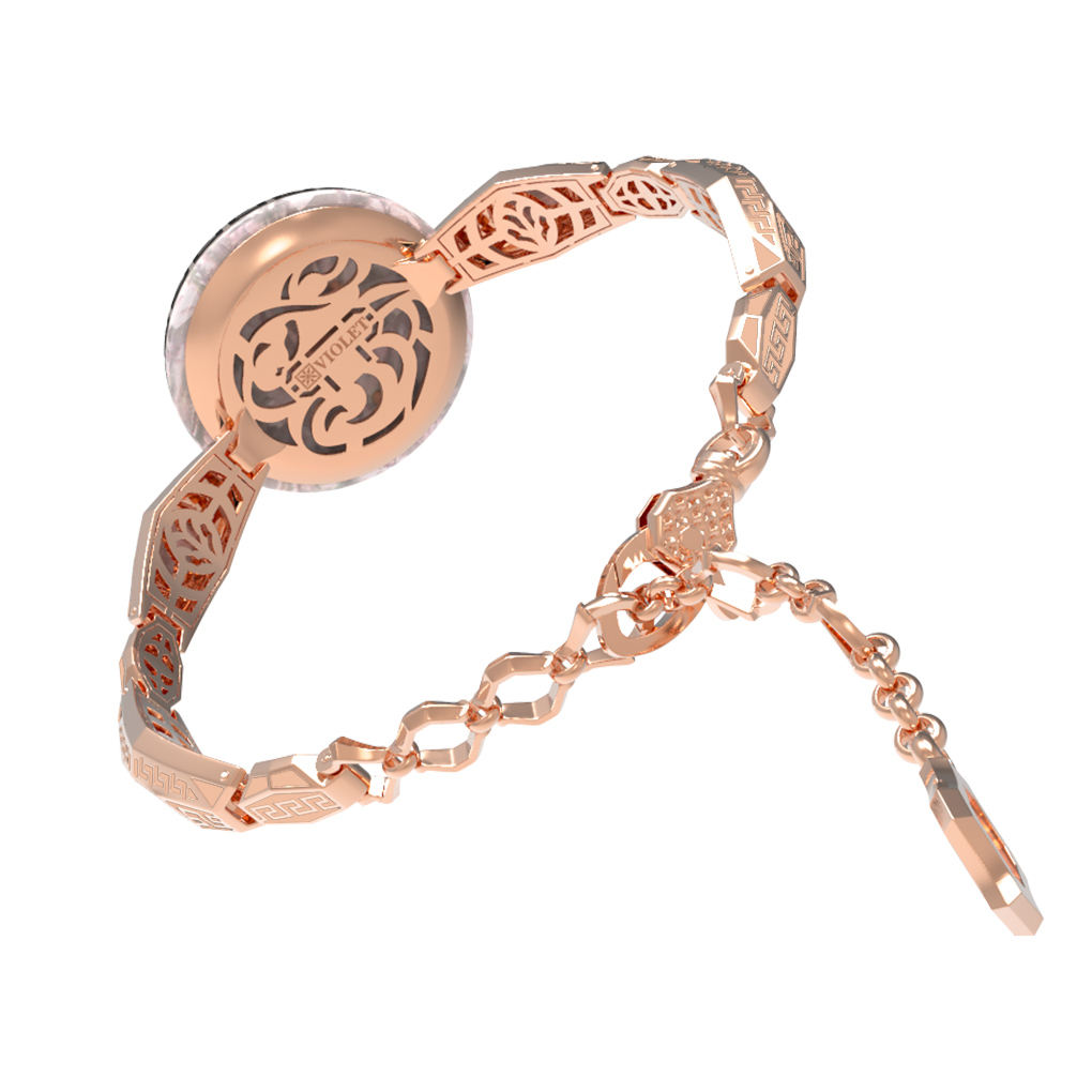 Центральным элементом композиции является выразительный декор, сочетающий классическую эстетику и современные ювелирные техники. Вставки из натурального перламутра придают украшению мягкое, переливающееся свечение, а черная эмаль добавляет графичности и глубины. Дизайн изделия объединяет формы круга и шестигранника, создавая сложный геометрический рисунок, который выглядит притягательно и современно. Искусная работа с материалами превращает этот аксессуар в настоящее произведение искусства.
