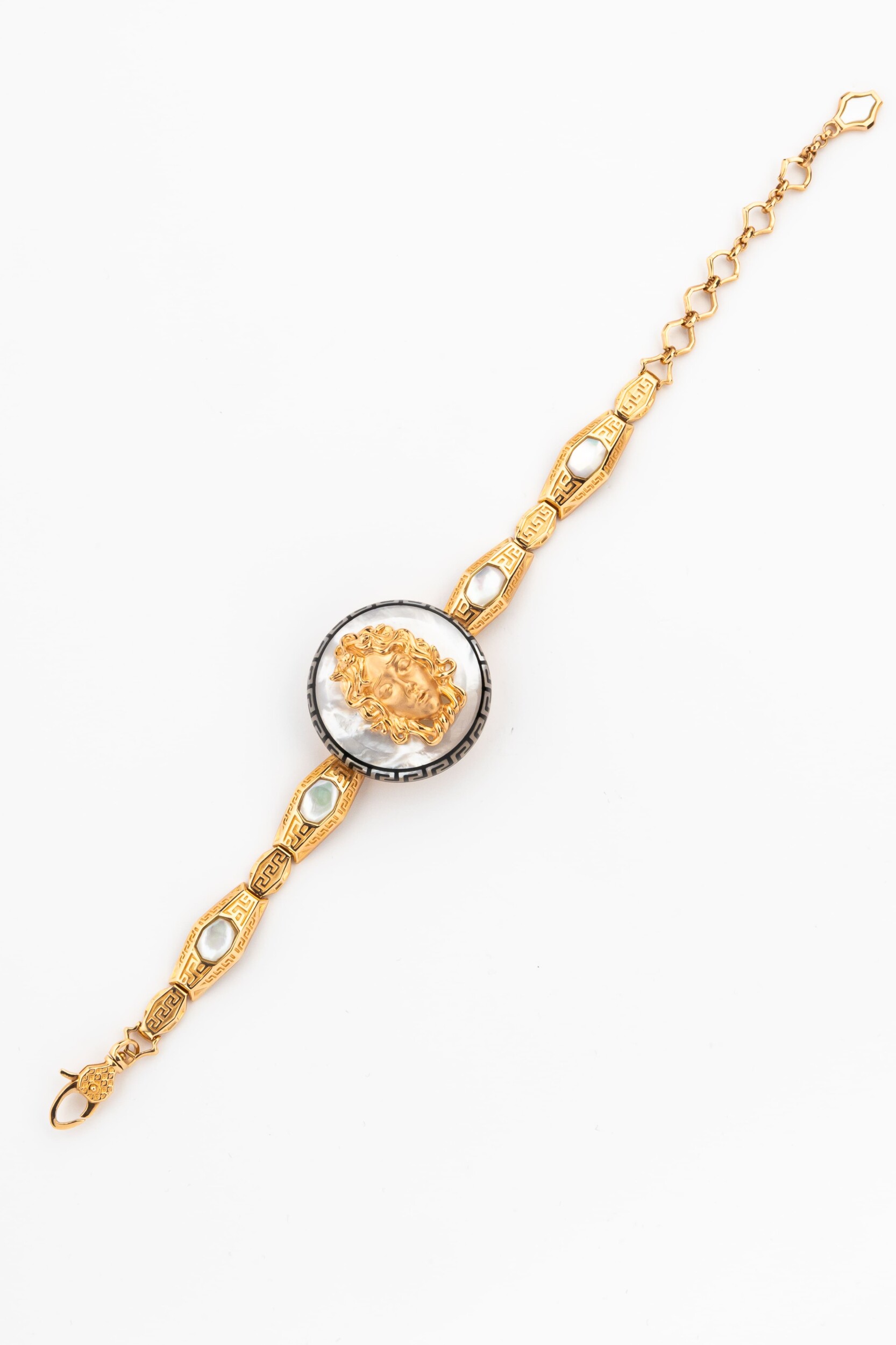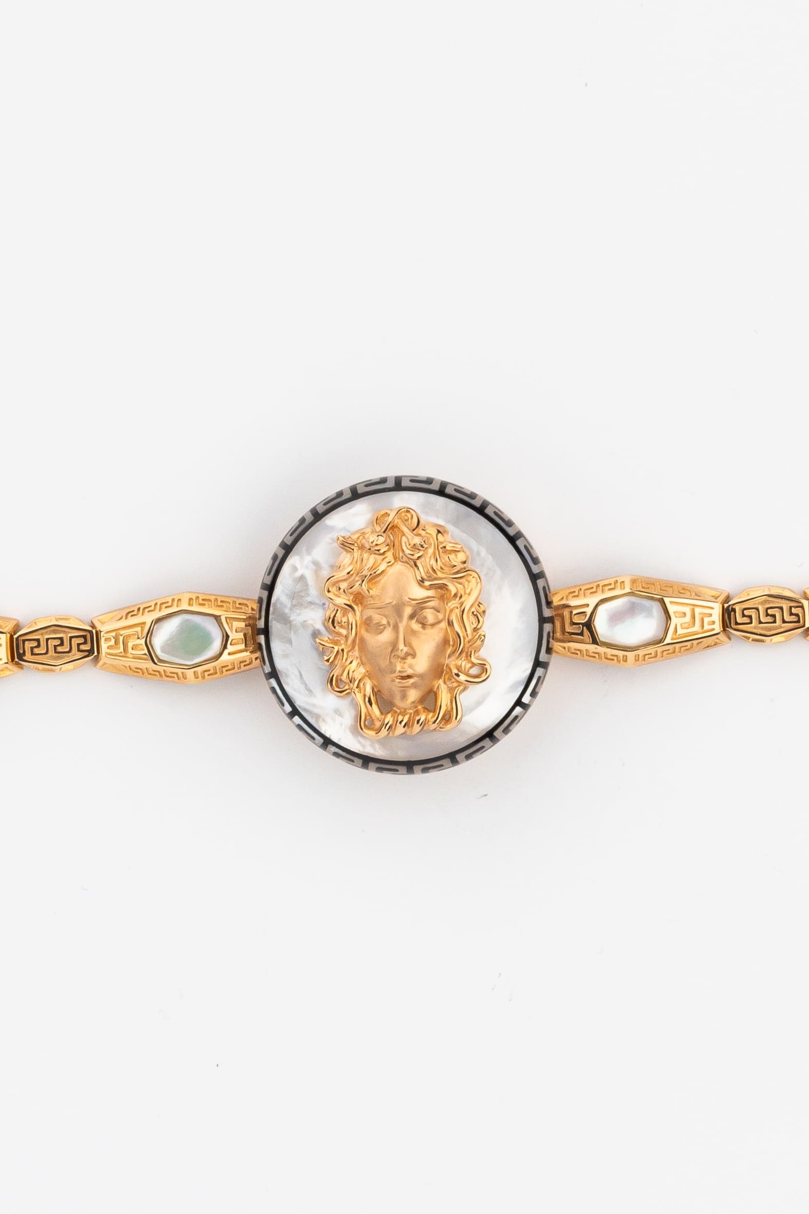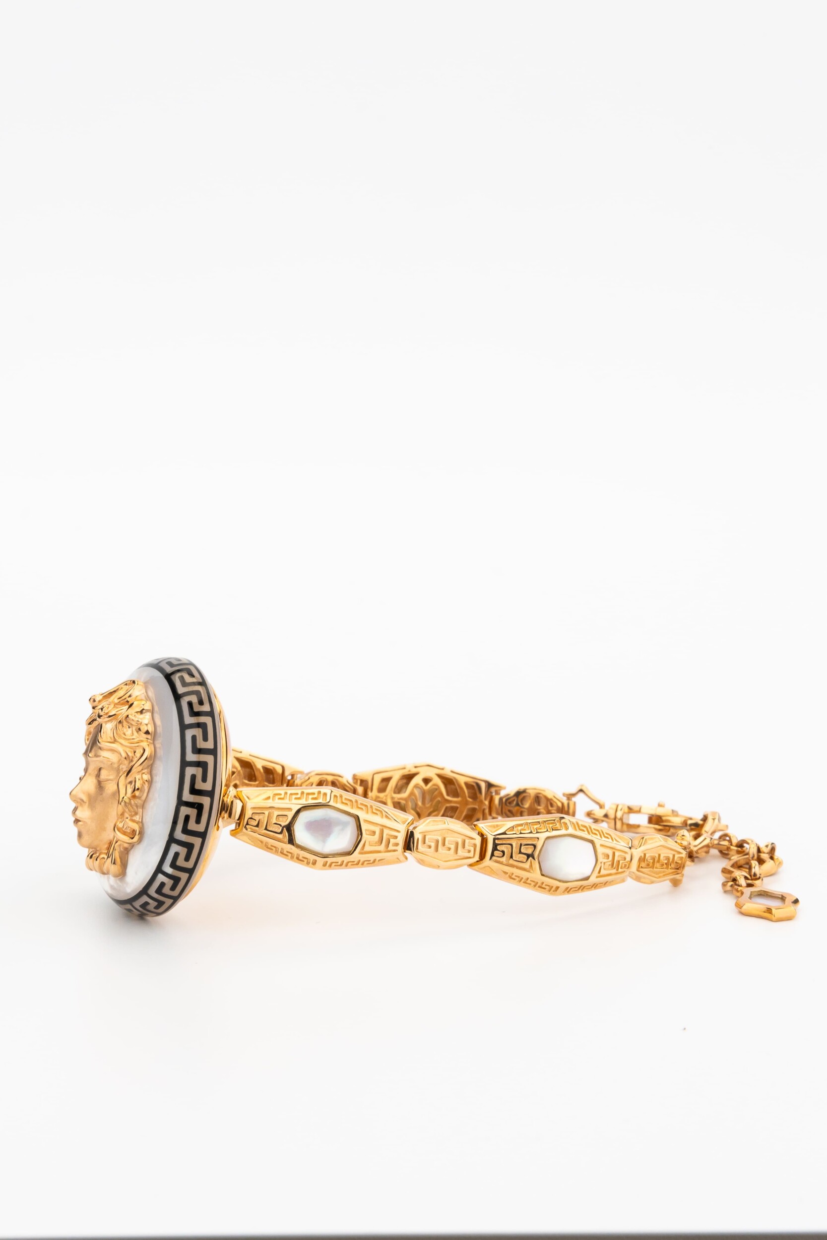 Центральным элементом композиции является выразительный декор, сочетающий классическую эстетику и современные ювелирные техники. Вставки из натурального перламутра придают украшению мягкое, переливающееся свечение, а черная эмаль добавляет графичности и глубины. Дизайн изделия объединяет формы круга и шестигранника, создавая сложный геометрический рисунок, который выглядит притягательно и современно. Искусная работа с материалами превращает этот аксессуар в настоящее произведение искусства.