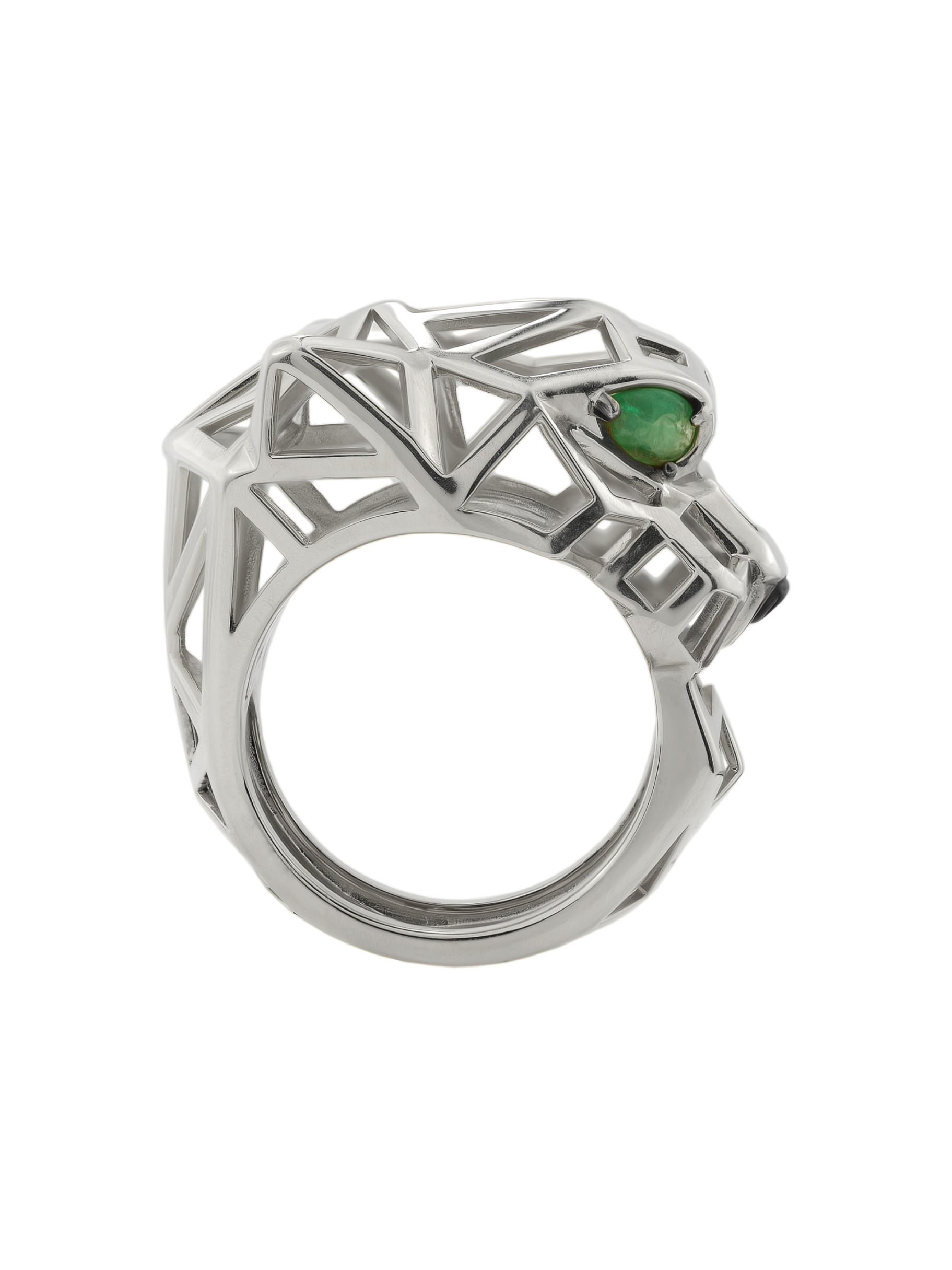 В дизайне гармонично сочетаются благородный белый металл и драгоценные вставки. Взгляд хищника притягивает глубокий зеленый цвет двух изумрудов огранки груша. Деталь носа выполнена из контрастного черного оникса треугольной формы. Всего в изделии использовано 3 вставки, которые добавляют акценты и делают образ выразительным. Благодаря унисекс-дизайну в стилистике пантеры и пумы, кольцо подойдет как женщинам, так и мужчинам, желающим подчеркнуть свою индивидуальность.