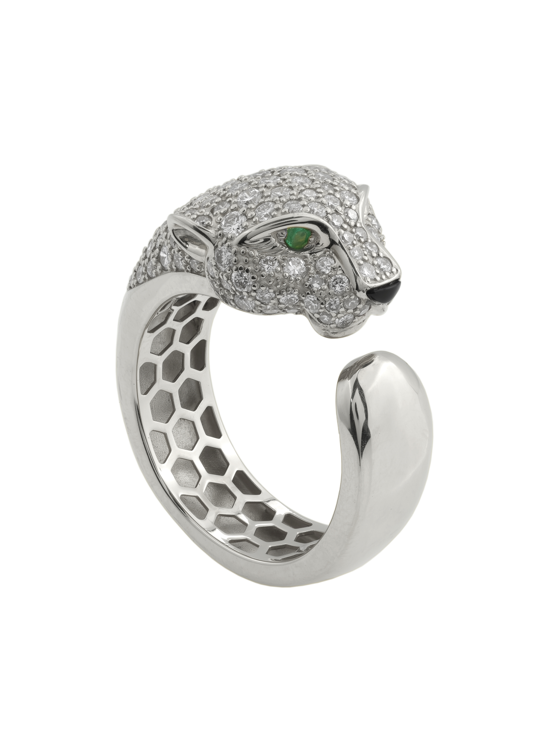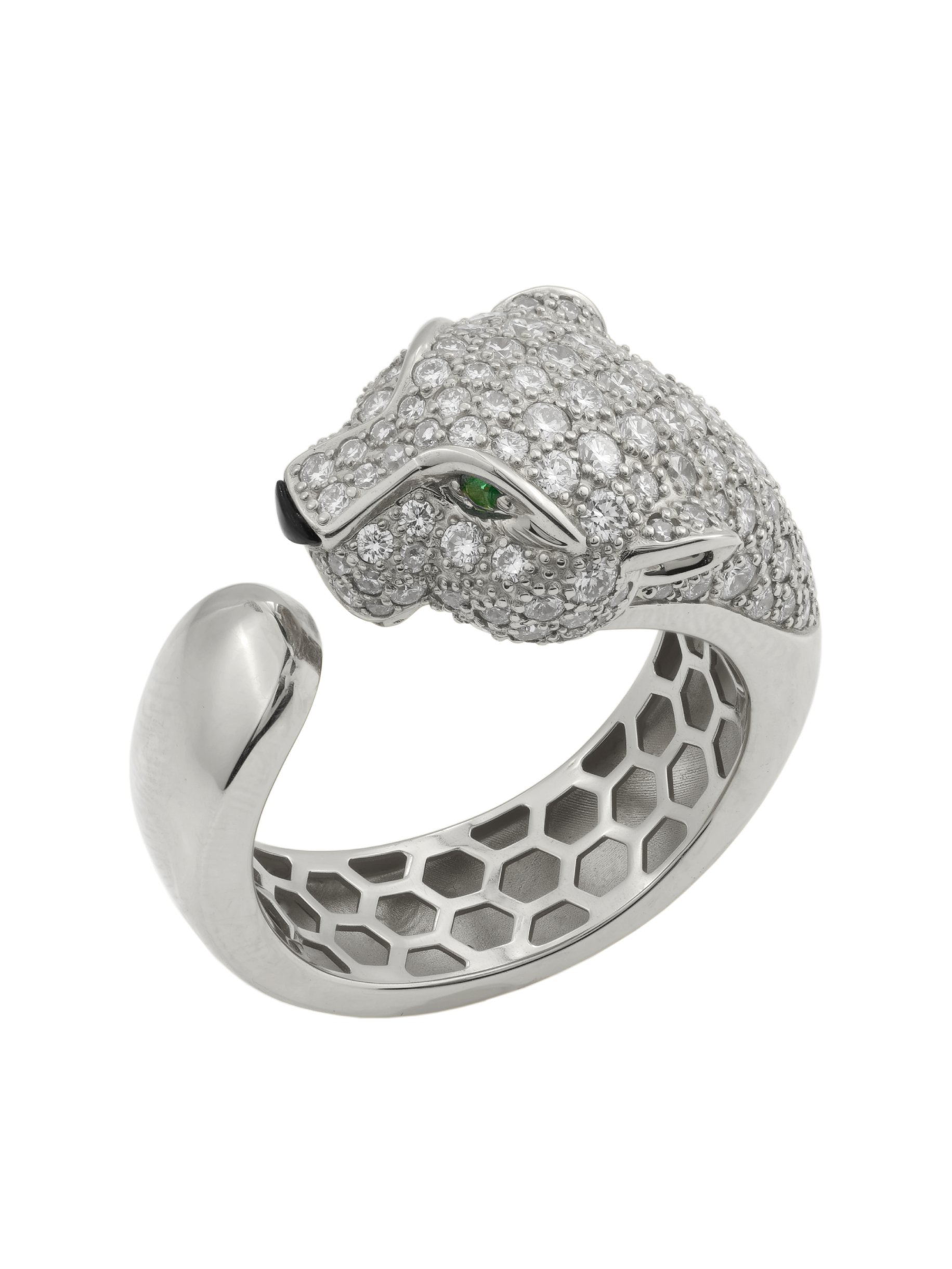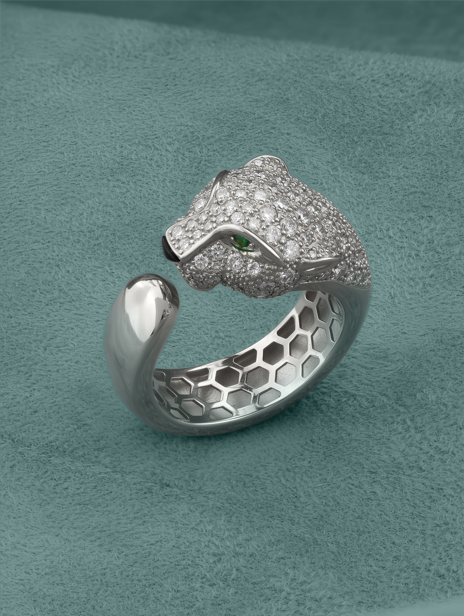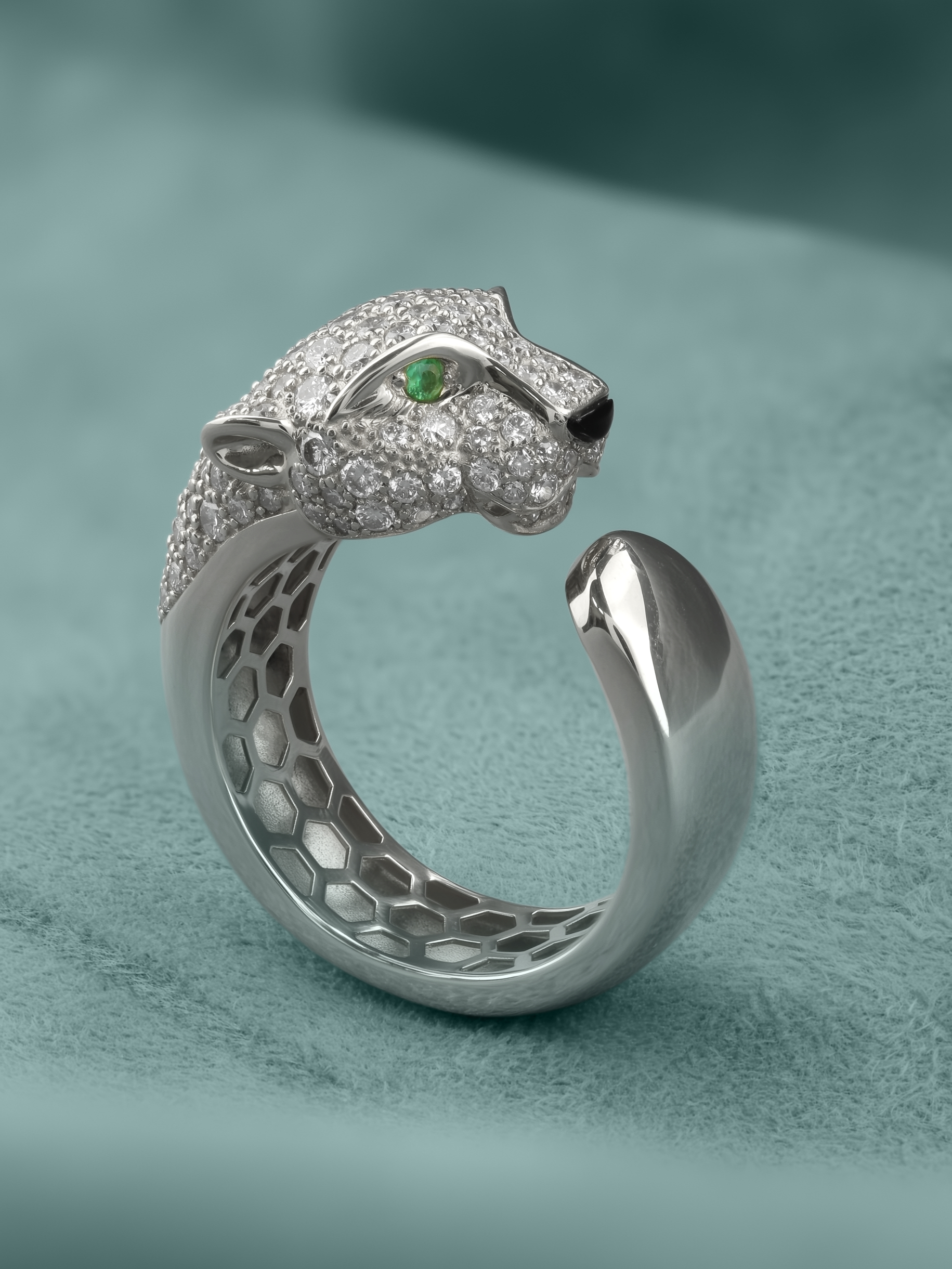 В центре композиции находится массивная голова хищника, щедро инкрустированная 129 вставками, среди которых сияющие бриллианты, загадочный оникс и насыщенный изумруд. Контрастное сочетание белого цвета золота с белыми, зелёными и чёрными камнями придает украшению особую глубину и выразительность. Круглые и треугольные формы камней подчеркивают детализацию изделия.
