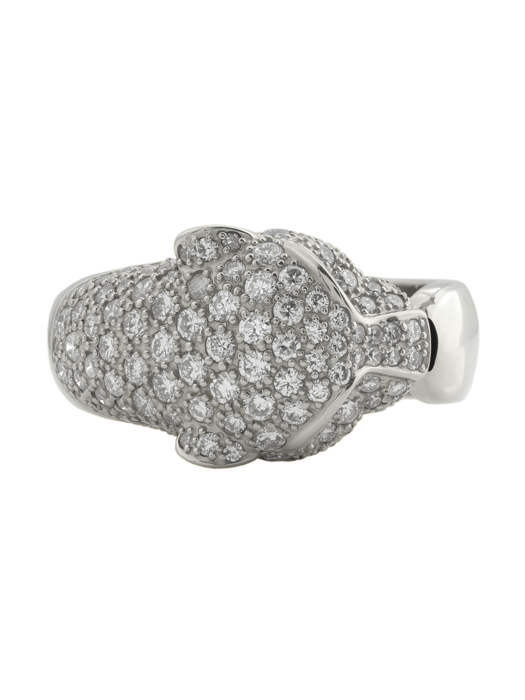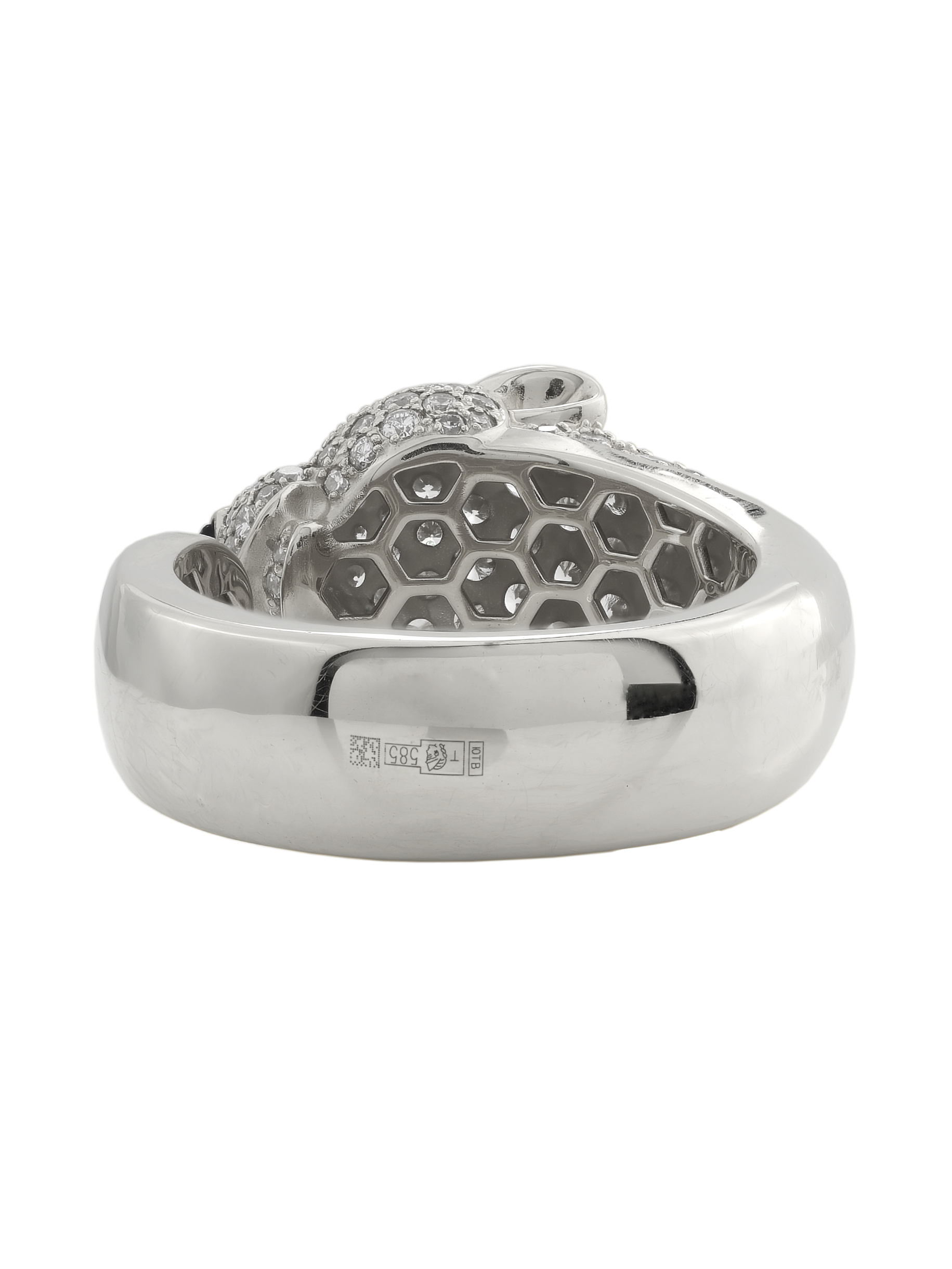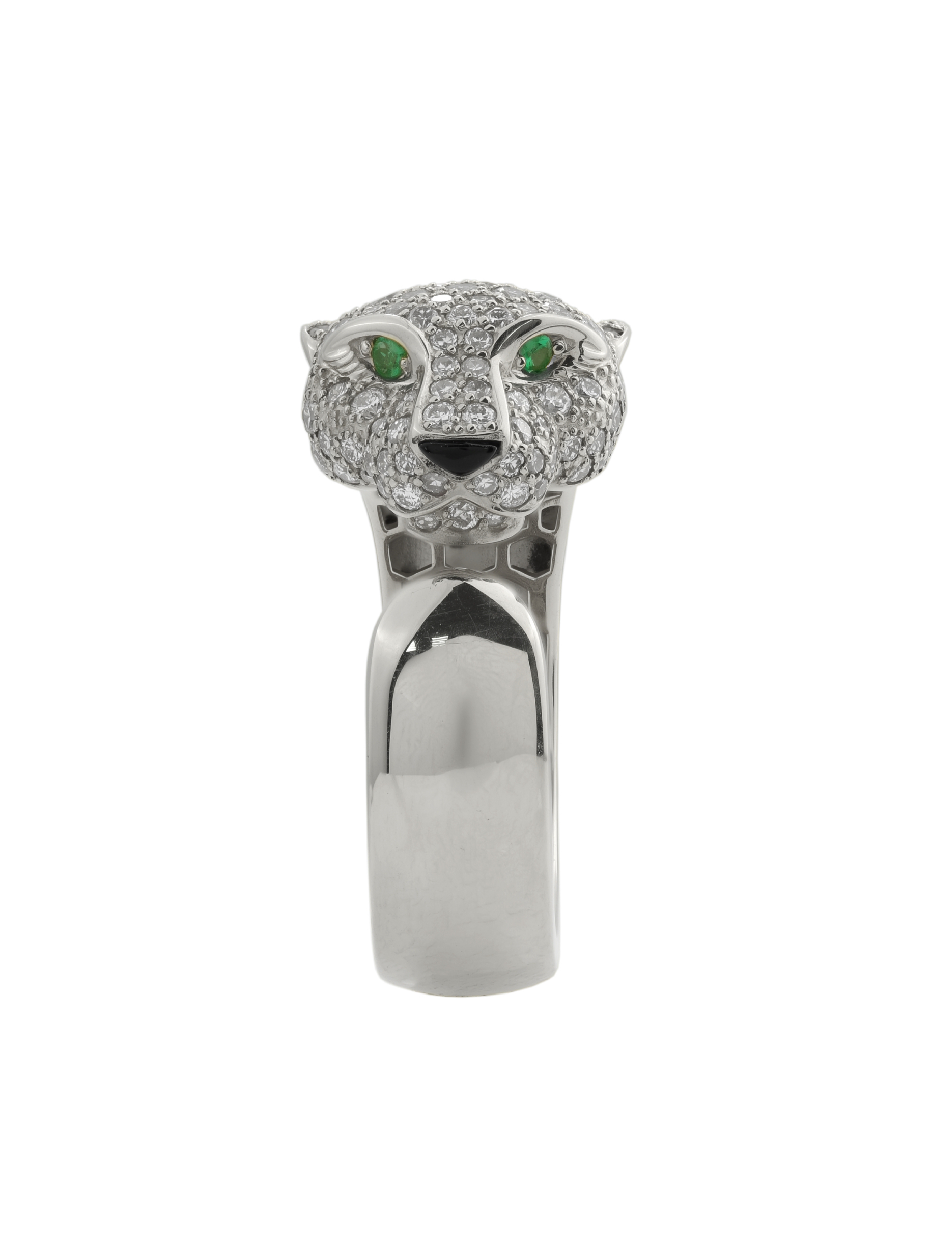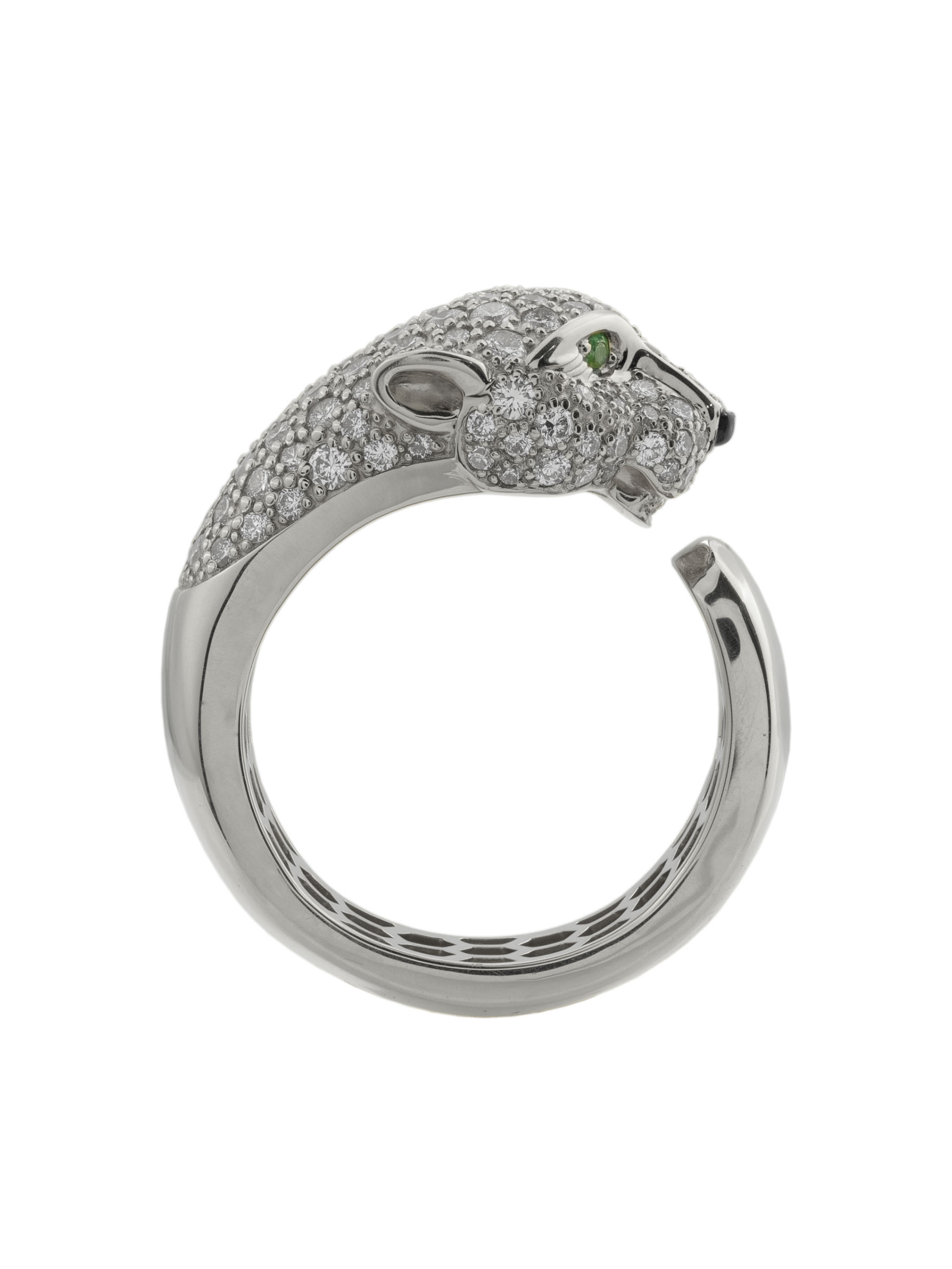 В центре композиции находится массивная голова хищника, щедро инкрустированная 129 вставками, среди которых сияющие бриллианты, загадочный оникс и насыщенный изумруд. Контрастное сочетание белого цвета золота с белыми, зелёными и чёрными камнями придает украшению особую глубину и выразительность. Круглые и треугольные формы камней подчеркивают детализацию изделия.