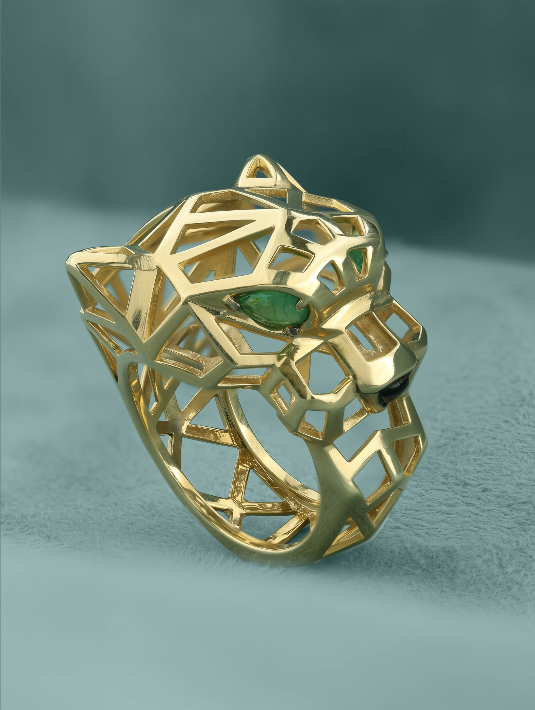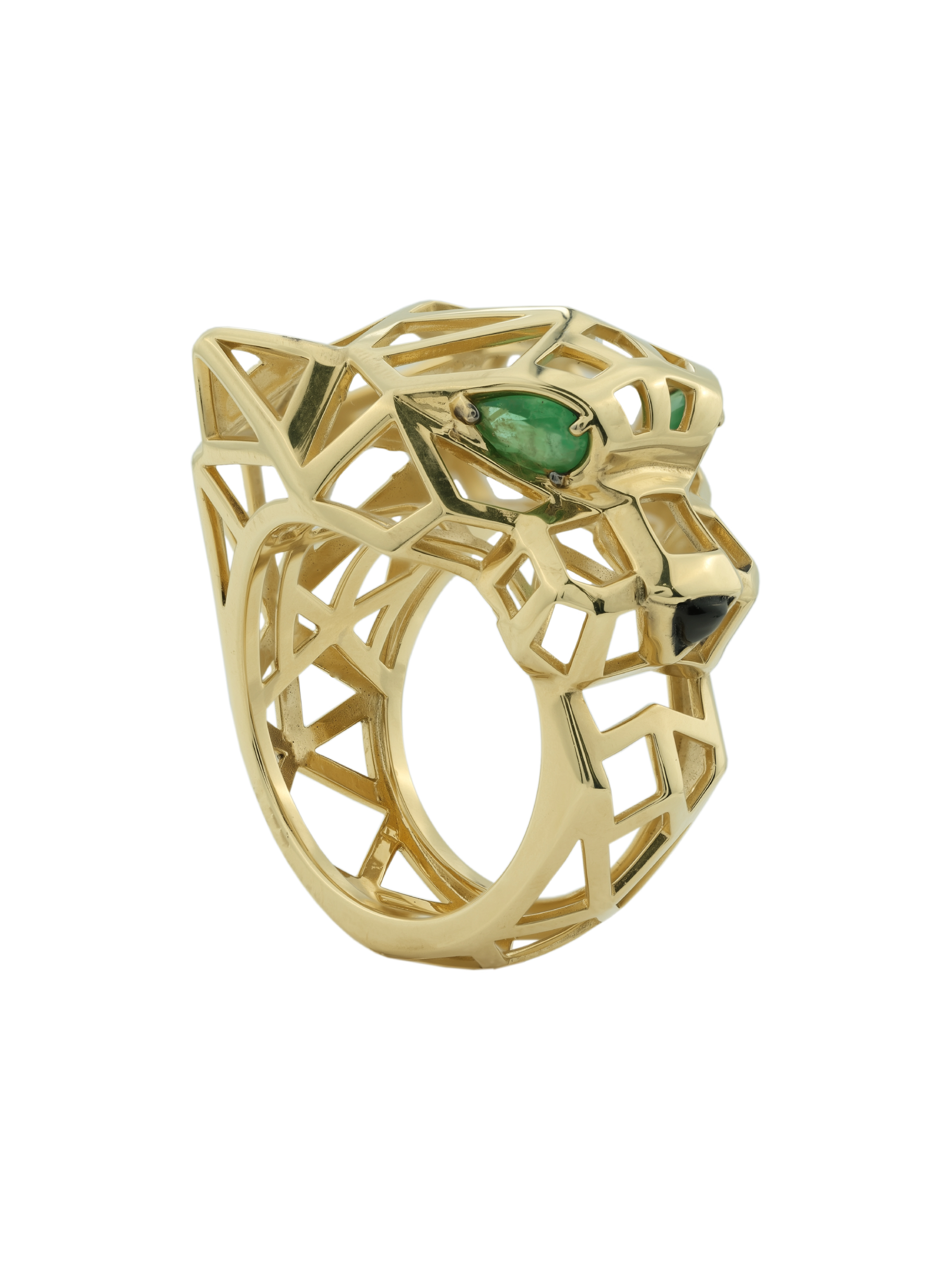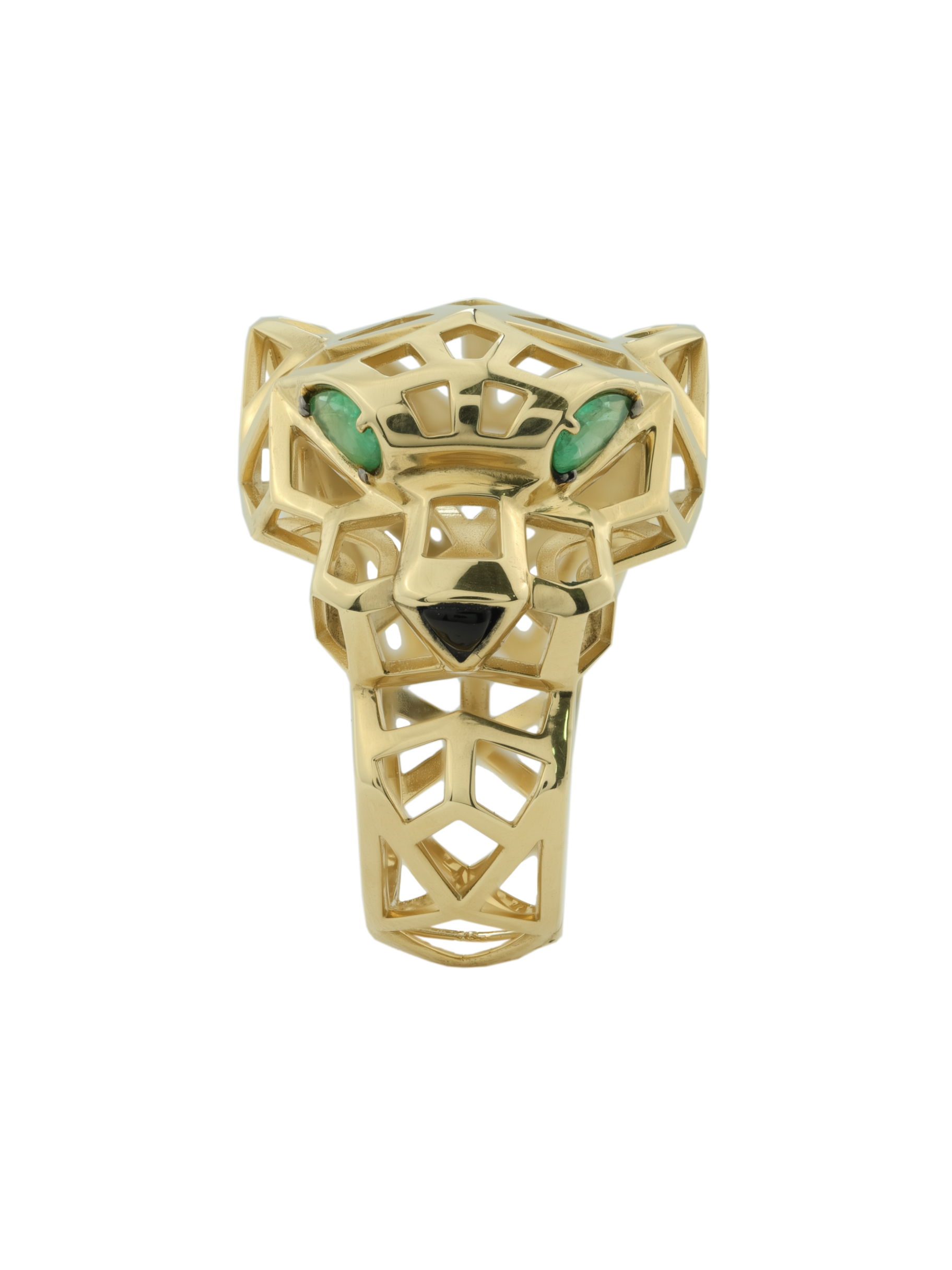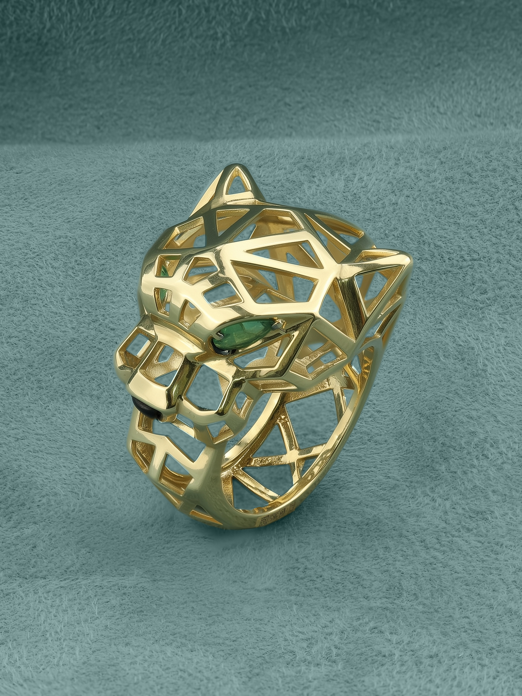 Взгляд хищника притягивает внимание благодаря двум выразительным изумрудам формы груша насыщенного зелёного цвета. Лаконичным акцентом служит вставка из чёрного оникса треугольной формы, гармонично завершающая образ. Всего в изделии использовано 3 драгоценные вставки, создающие контрастное сочетание тёплого металла и глубоких оттенков камней.