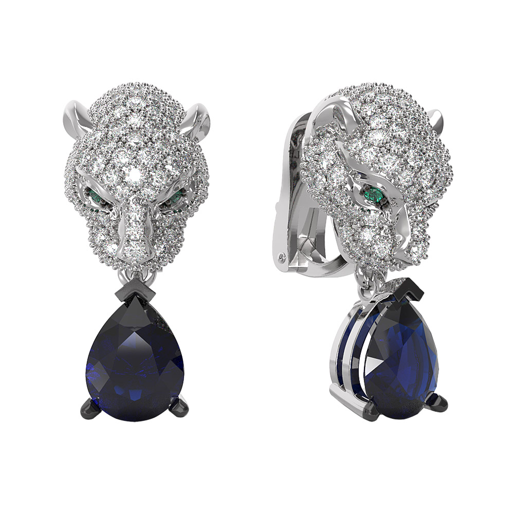 Центральный акцент изделия — великолепная вставка формы груша глубокого синего цвета, представленная сапфиром. Глаза хищника акцентированы изумрудом, создающим контрастное сочетание с основным цветом. Всего в украшении использовано 188 вставок круглой и грушевидной огранки, включая сверкающие бриллианты белого цвета, которые придают изделию ослепительное сияние. Белый цвет благородного металла идеально гармонирует с блеском камней.