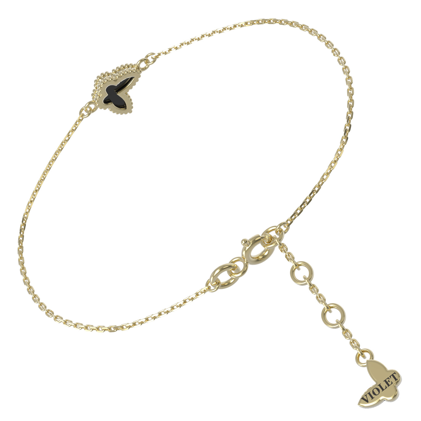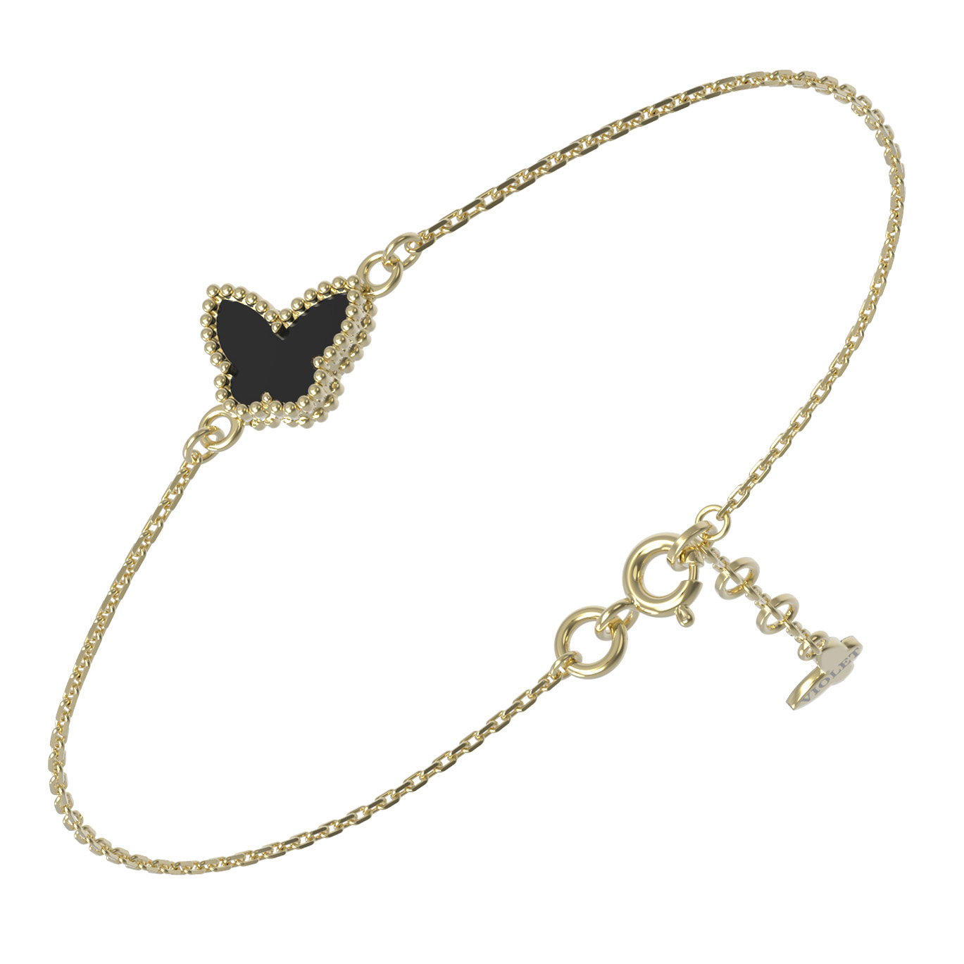 Изысканный браслет из лимонного золота 585 пробы станет ярким акцентом в вашем повседневном или вечернем образе. Лаконичный дизайн украшения, вдохновленный нежной эстетикой природы, подчеркивает утонченность линий и статусность изделия. Центральным элементом композиции является декоративный мотив в форме бабочки, который придает аксессуару особую выразительность и легкость. В качестве вставки использован благородный оникс насыщенного черного цвета, создающий эффектный контраст с теплым оттенком лимонного золота.