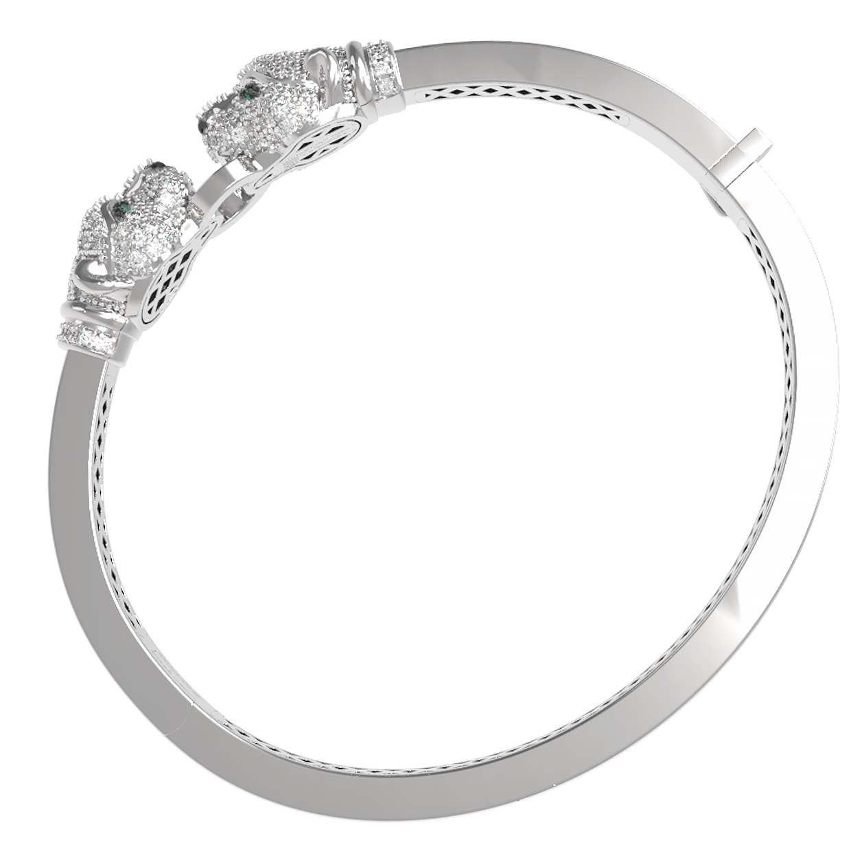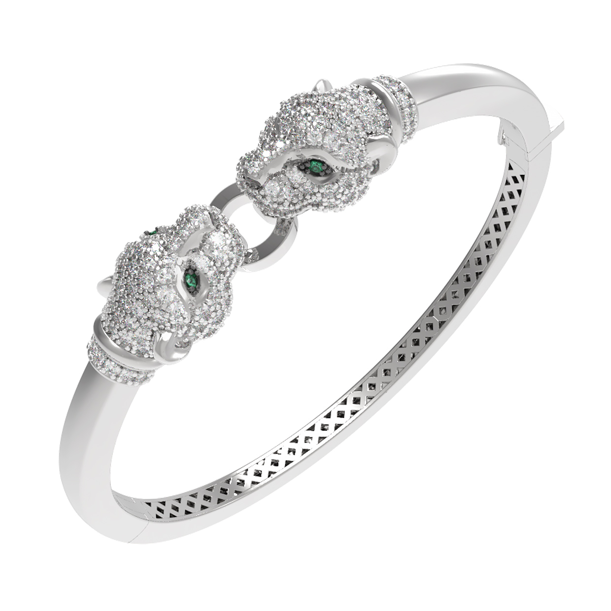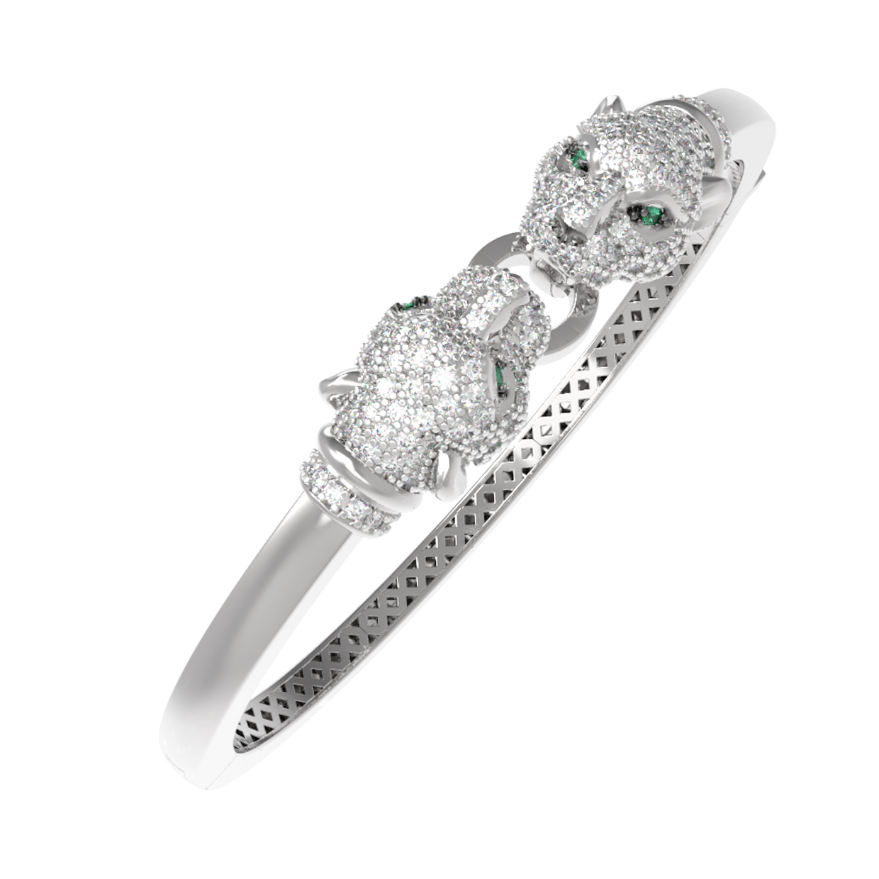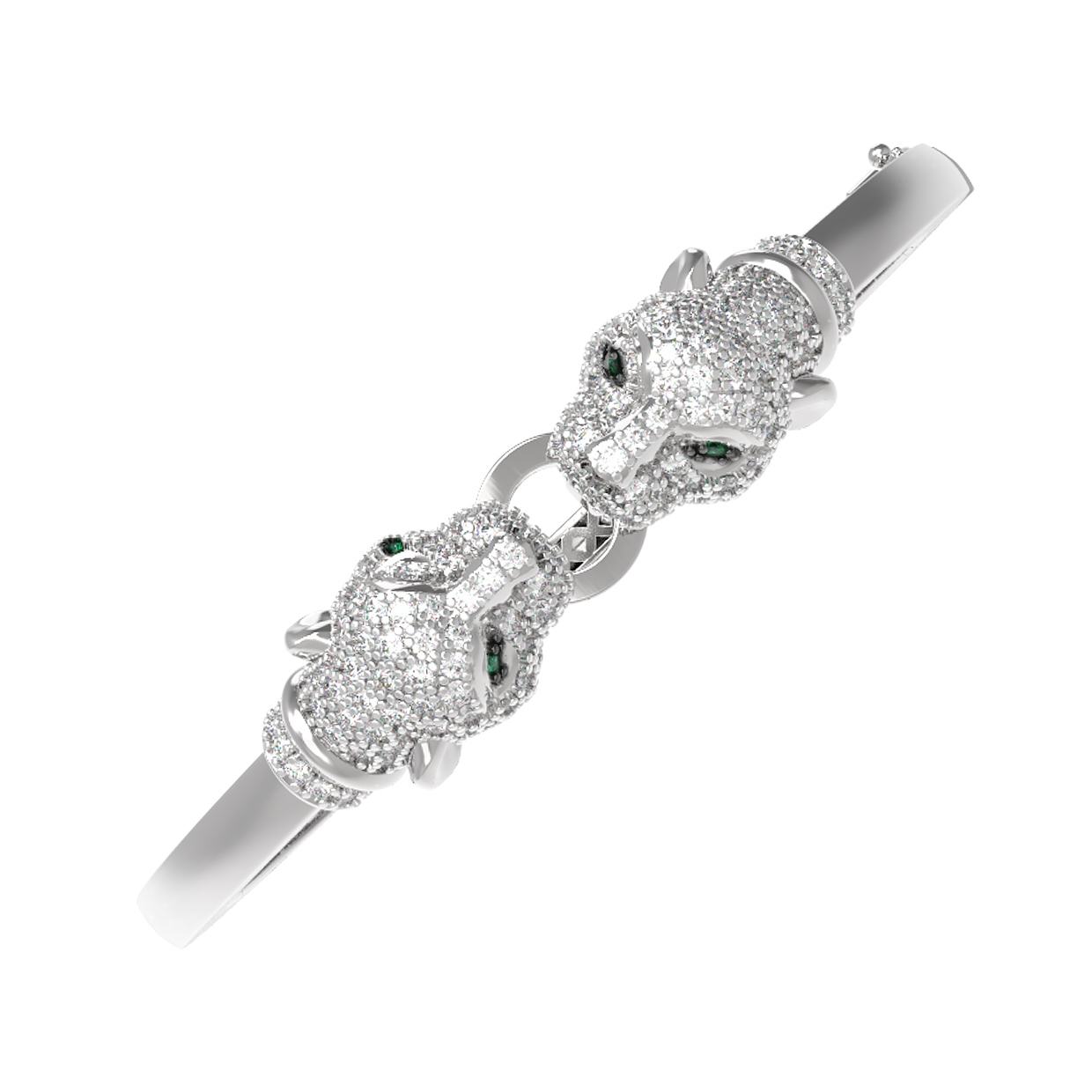 Роскошь и внимание к деталям подчеркивают 1360 бриллиантов круглой формы, которые полностью покрывают головы грациозных хищников, создавая невероятную игру света. Глаза пантер инкрустированы яркими зелеными изумрудами круглой формы, добавляя композиции выразительности и глубины. Сочетание классического белого золота с зелеными вставками делает этот браслет универсальным украшением, которое подходит как для женщин, так и для мужчин.