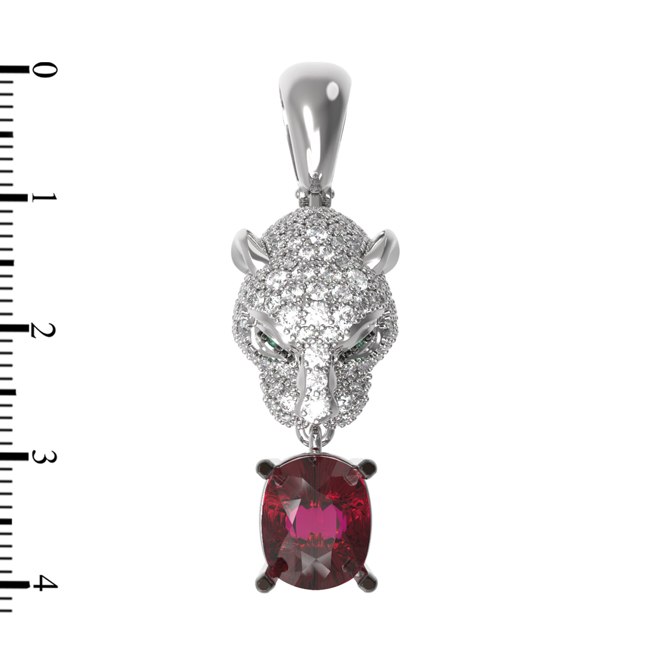 Глаза пантеры, акцентированные насыщенным зелёным изумрудом, придают украшению живой и глубокий взгляд. В нижней части изделия расположена крупная вставка — рубин овальной формы, который контрастирует с холодным блеском металла и белыми бриллиантами круглой огранки. Сочетание белого золота, яркого красного рубина и благородного изумруда делает это украшение по-настоящему статусным и заметным.