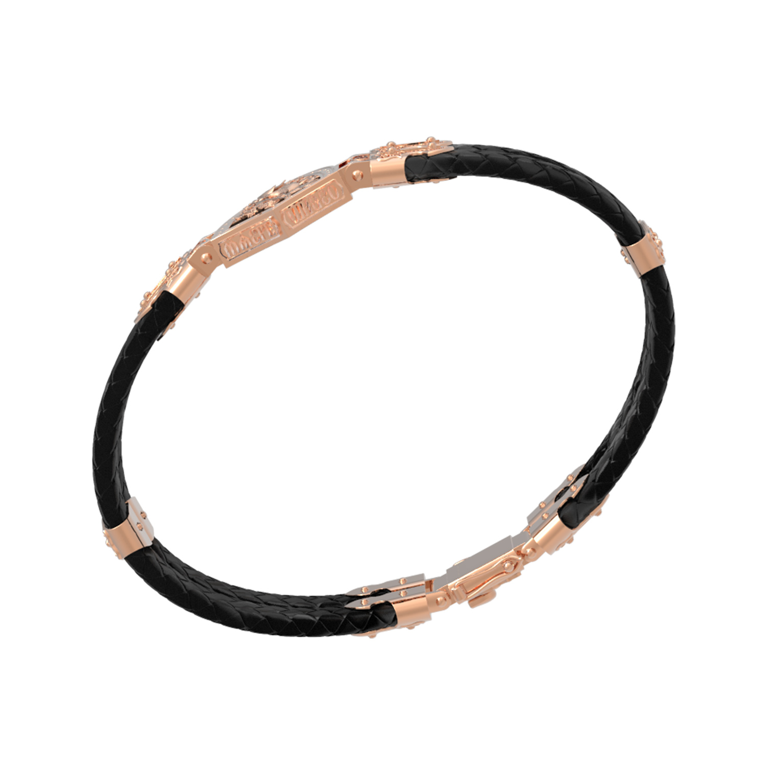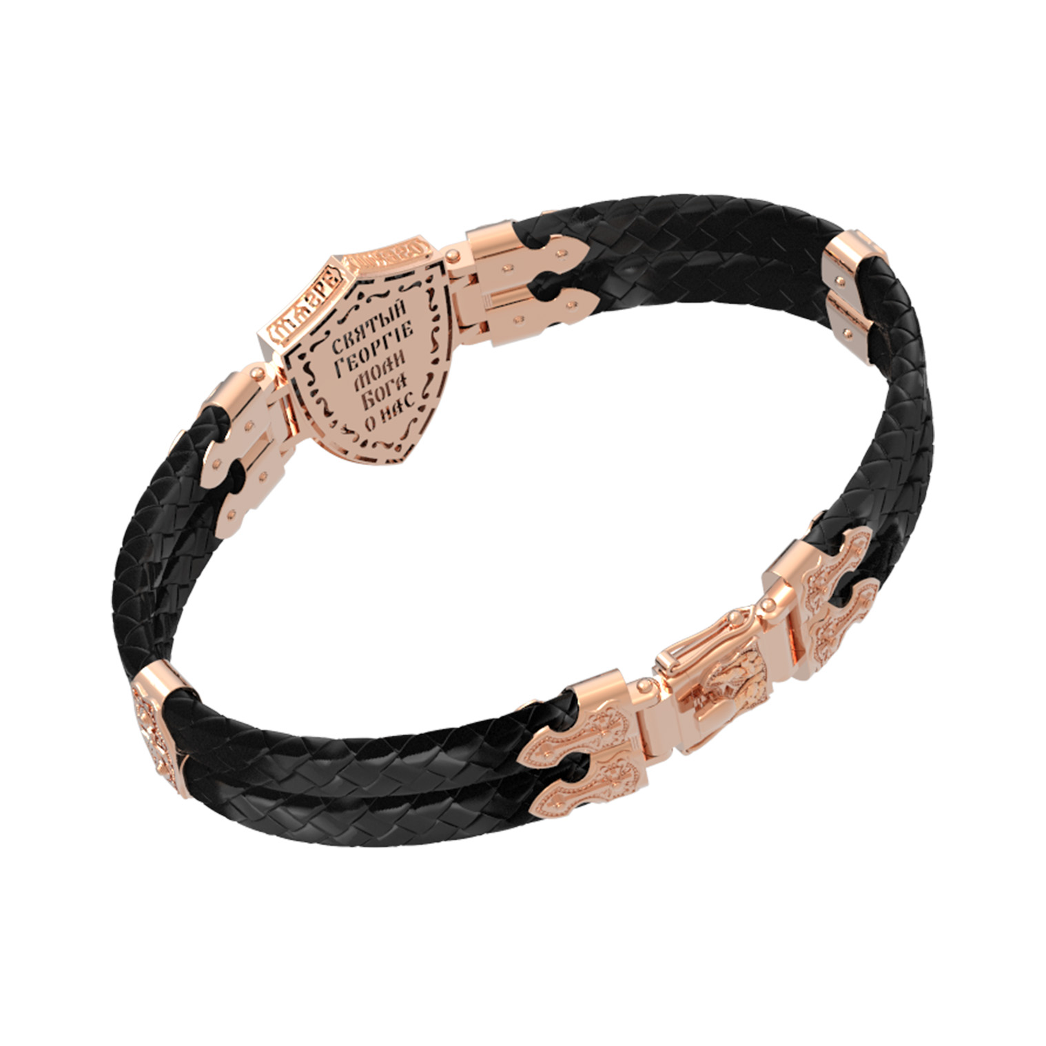 Основой композиции лицевой стороны браслета является изображение Святого Великомученика Георгия Победоносца — одного из самых почитаемых и удивительных святых. Георгий родился в Каппадокии (Малая Азия) в семье богатых и знатных горожан. Юношей поступил на службу к римскому императору Диоклетиану, за отличное знание военного дела и проявленную в боях и походах храбрость был приближен к императору и удостоен высокого воинского звания. Во время начавшихся гонений на христиан, перешел на сторону гонимых и, отвергнув человеческий страх, стал ярым проповедником учения Христа. Мучители подвергли опального воеводу жесточайшим восьмидневным пыткам и казнили его (обезглавили) в возрасте около тридцати лет в 303 году. На Руси он известен как Юрий или Егорий, заступник для верующих, чья жизнь имеет какое-либо отношение к военным делам, помощник в крестьянском труде. Браслет сделан в виде воинского щита. На нем Георгий изображен как воитель, сидящий на вздыбленном коне и поражающий копьем огнедышащего змея. Над образом изображена благословляющая Божия десница. Змей символизирует собою сатанинские силы. Молитвами вознесенными к Всевышнему и своей непреклонной верой он смог одолеть чудовище. Святой убил змея, спас царскую дочь, принесенную в жертву, и жителей города, их души от влияния дьявола, породив в них надежду и веру в Господа, призывая людей принять христианскую веру. На торце изделия помещена молитва: «Господи, помилуй мя грешного».