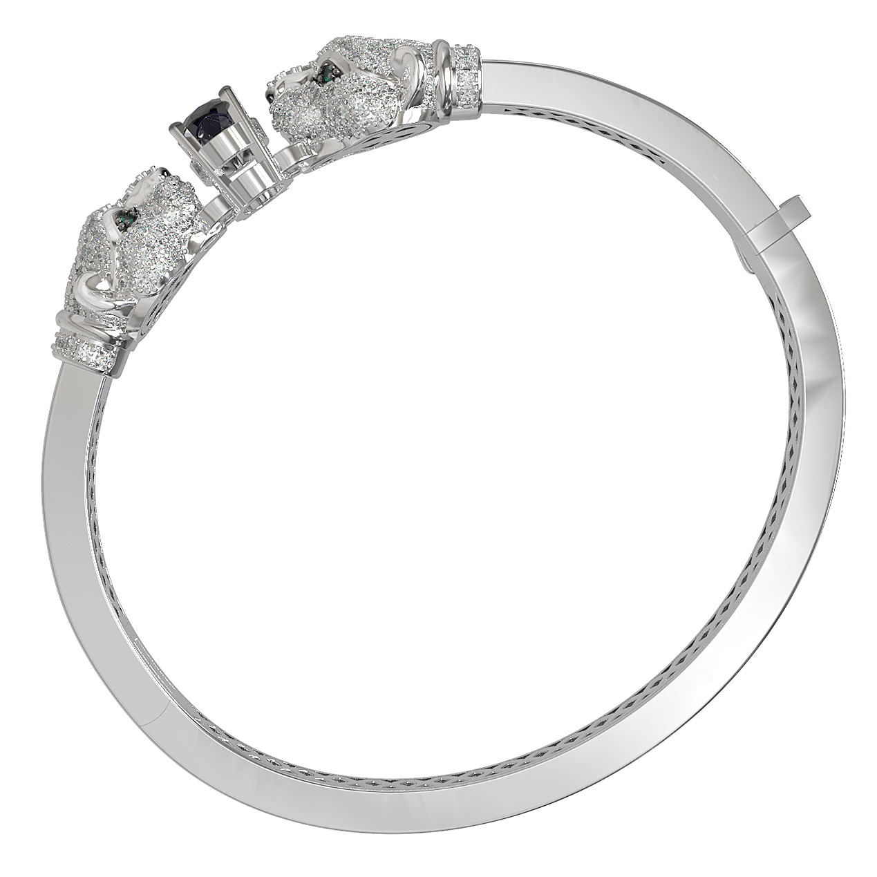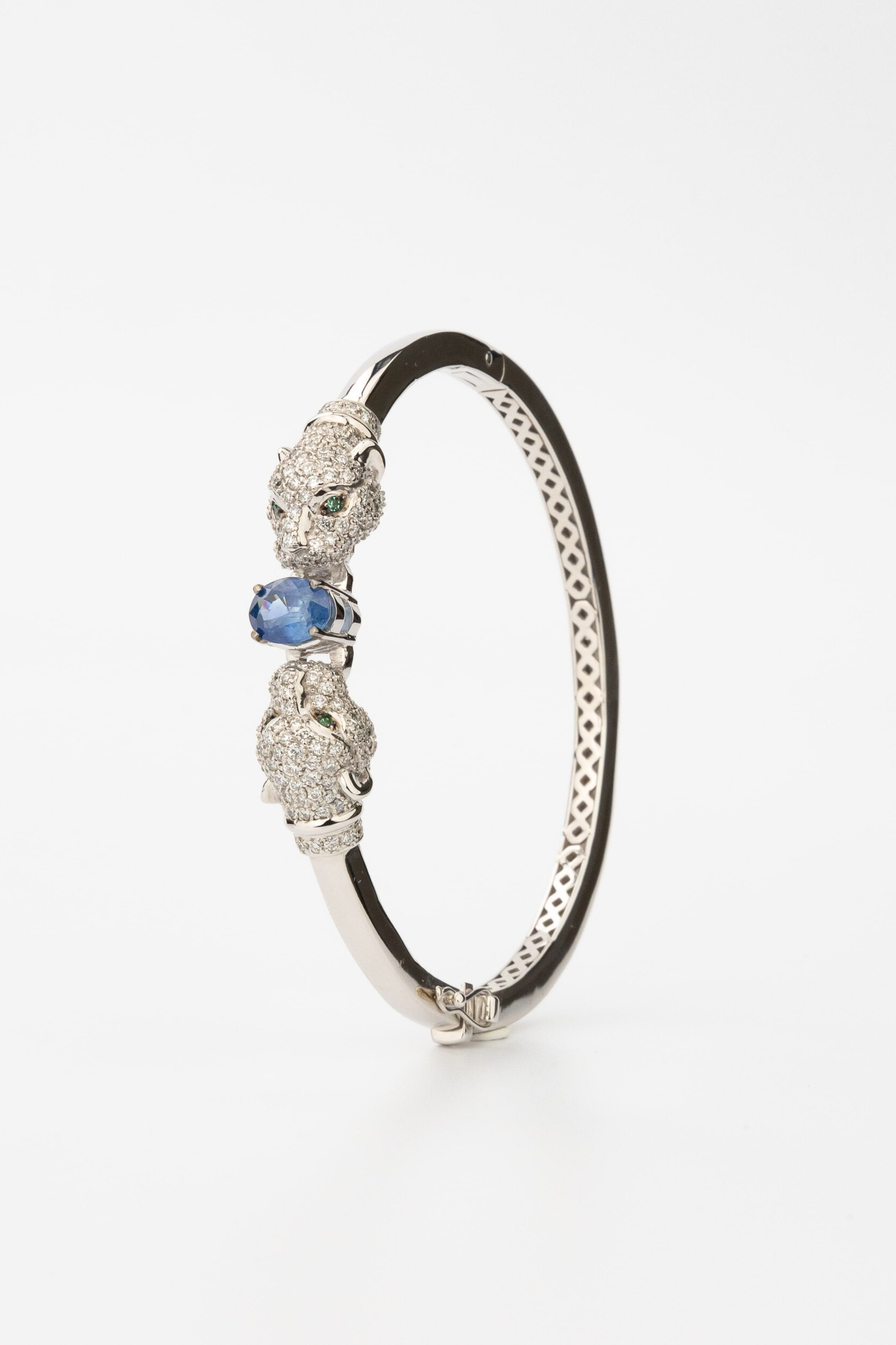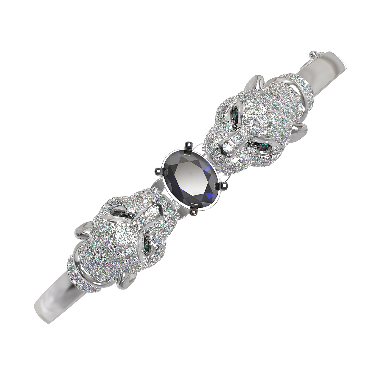 Центральным элементом композиции выступает выразительный сапфир овальной формы глубокого синего цвета, который притягивает взгляд и задает тон всему украшению. В качестве вставок также использованы 513 драгоценных камней: сверкающие бриллианты круглой формы подчеркивают блеск металла, а акцентные изумруды зеленого цвета в глазах пантер придают взгляду хищника особую глубину. Сочетание благородного белого золота и драгоценных камней разных оттенков создает неповторимую игру света на запястье.