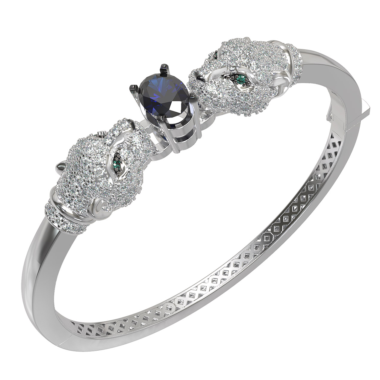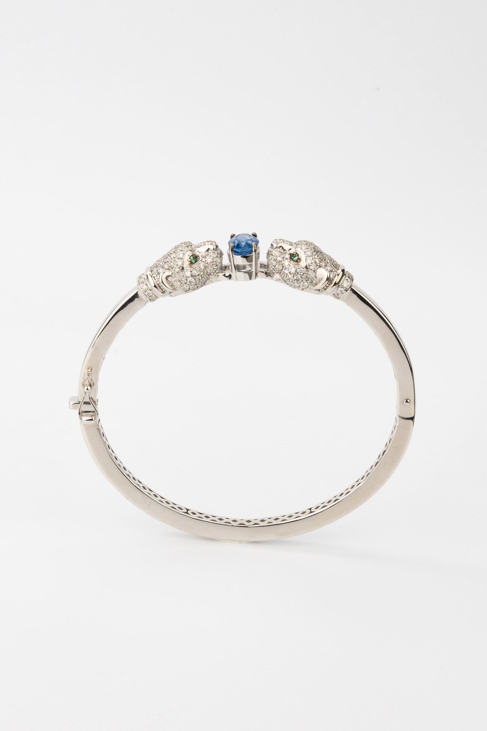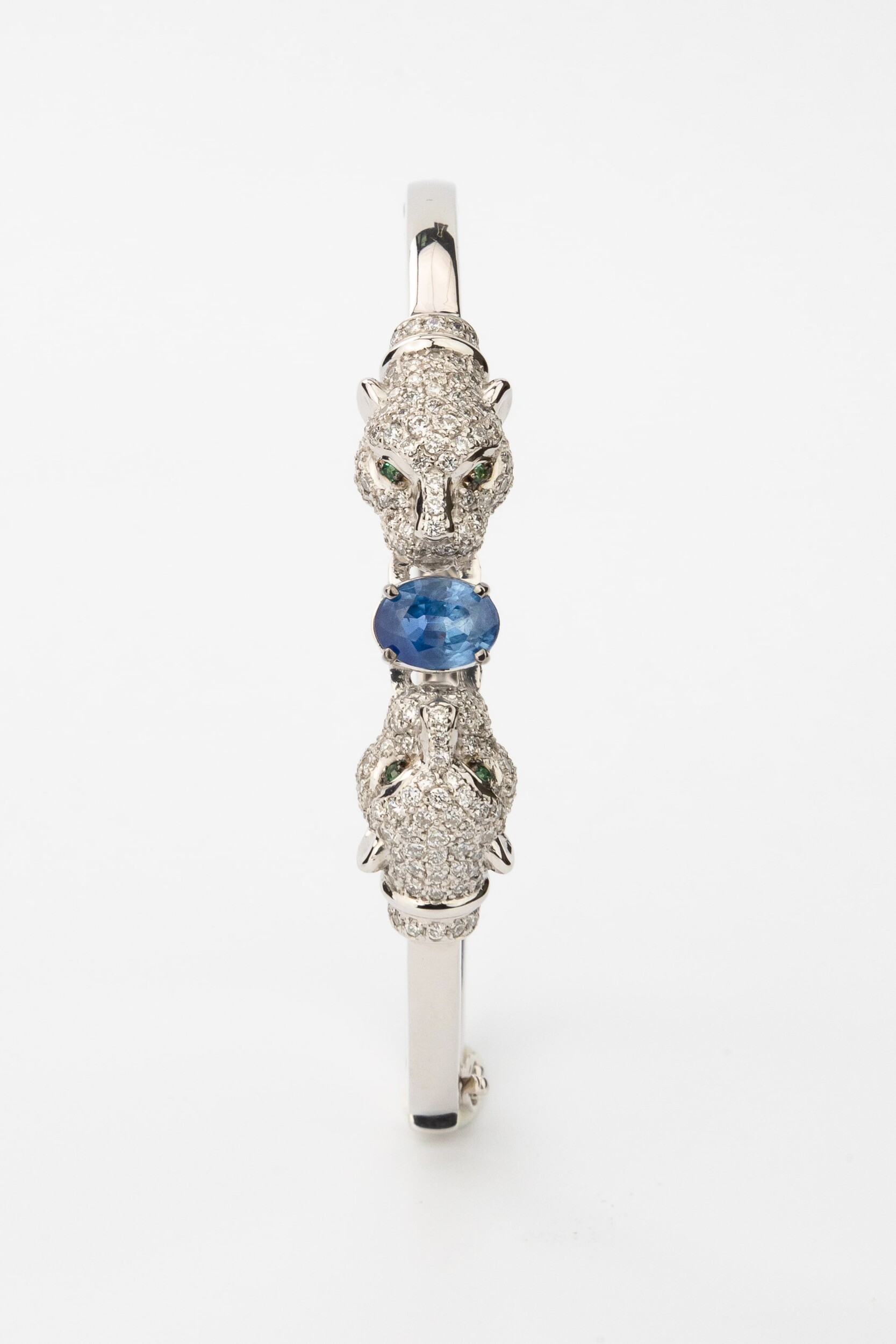 Центральным элементом композиции выступает выразительный сапфир овальной формы глубокого синего цвета, который притягивает взгляд и задает тон всему украшению. В качестве вставок также использованы 513 драгоценных камней: сверкающие бриллианты круглой формы подчеркивают блеск металла, а акцентные изумруды зеленого цвета в глазах пантер придают взгляду хищника особую глубину. Сочетание благородного белого золота и драгоценных камней разных оттенков создает неповторимую игру света на запястье.
