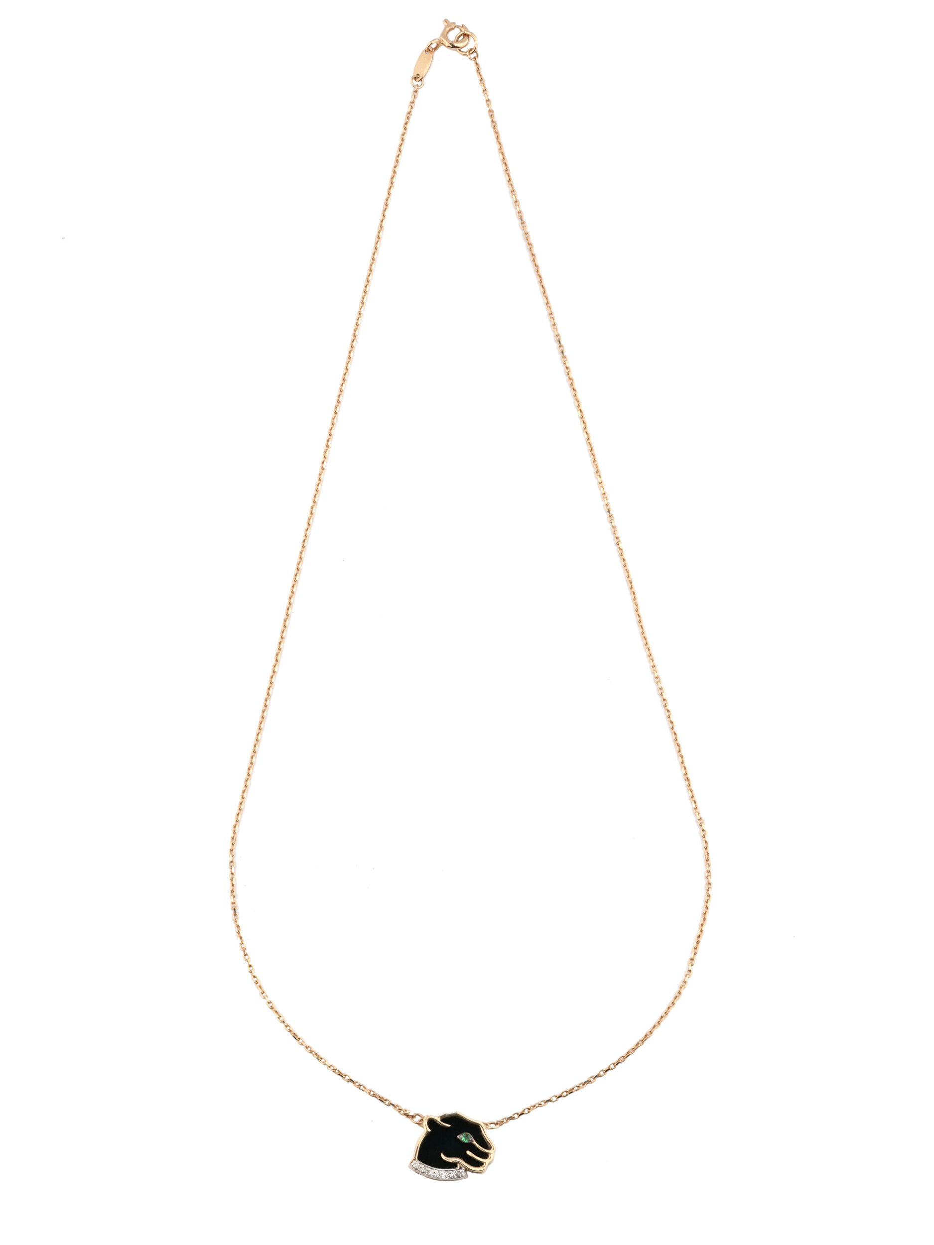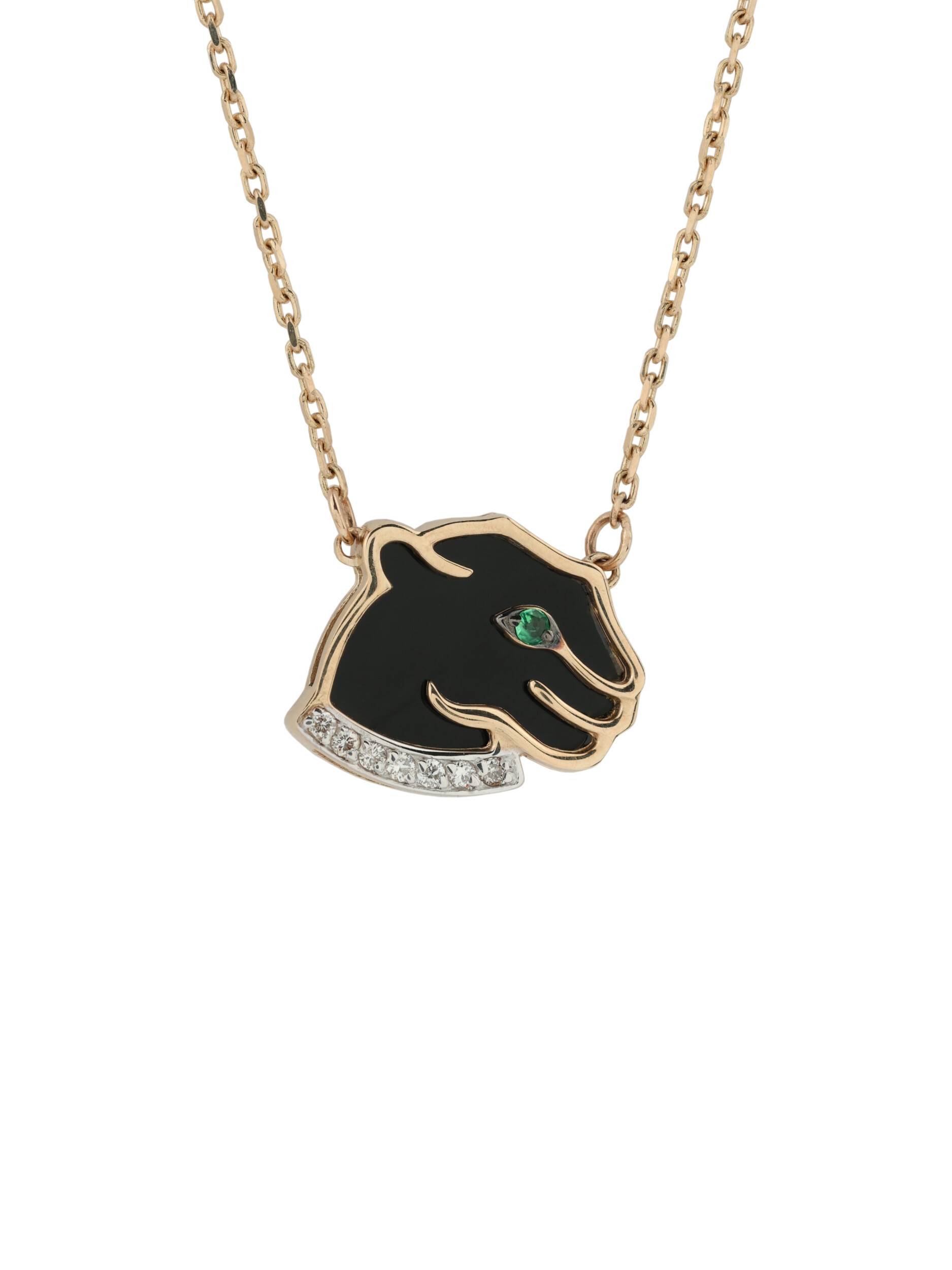 Колье из красного золота 585 пробы из коллекции De Luxe — Пума — Бриллианты станет воплощением вашего безупречного стиля. В центре изысканной композиции находится подвеска с выразительным дизайном в виде пантеры, выполненная с ювелирной точностью. Глубокий, насыщенный черный оникс гармонично сочетается с теплым блеском красного золота, подчеркивая хищную грацию животного.