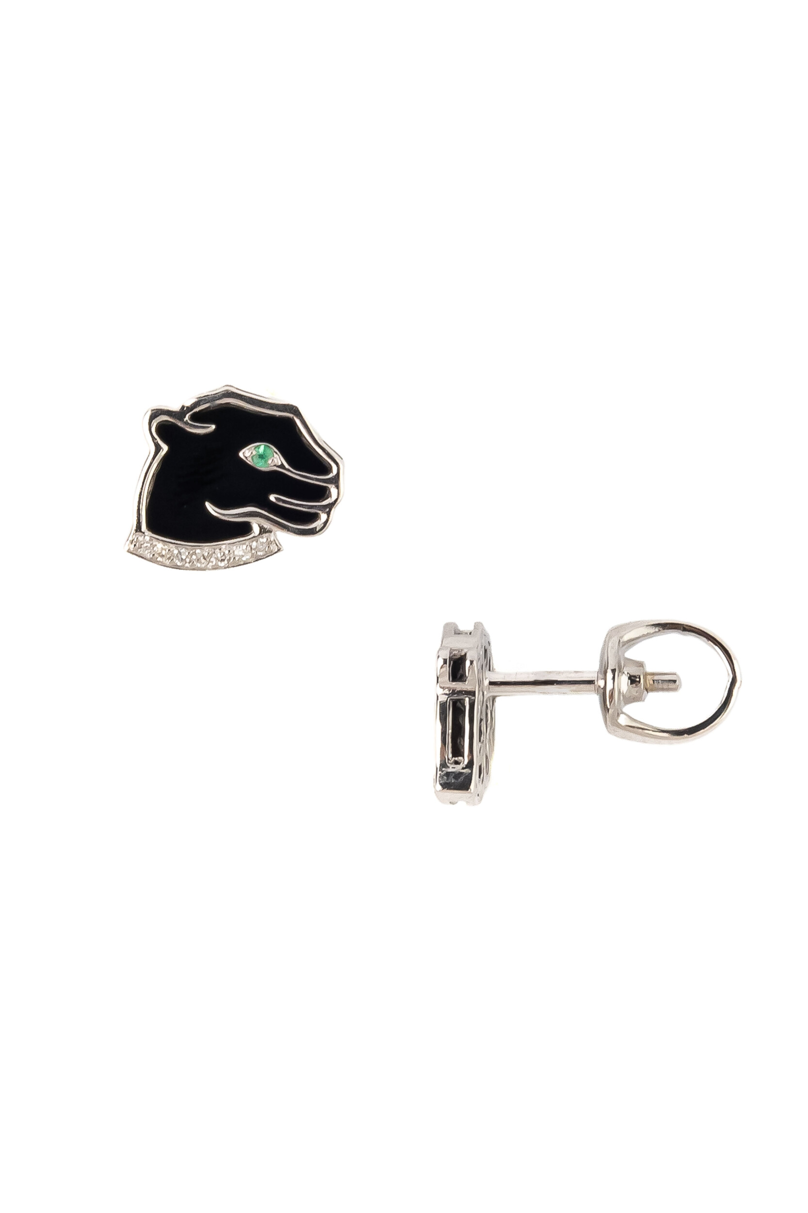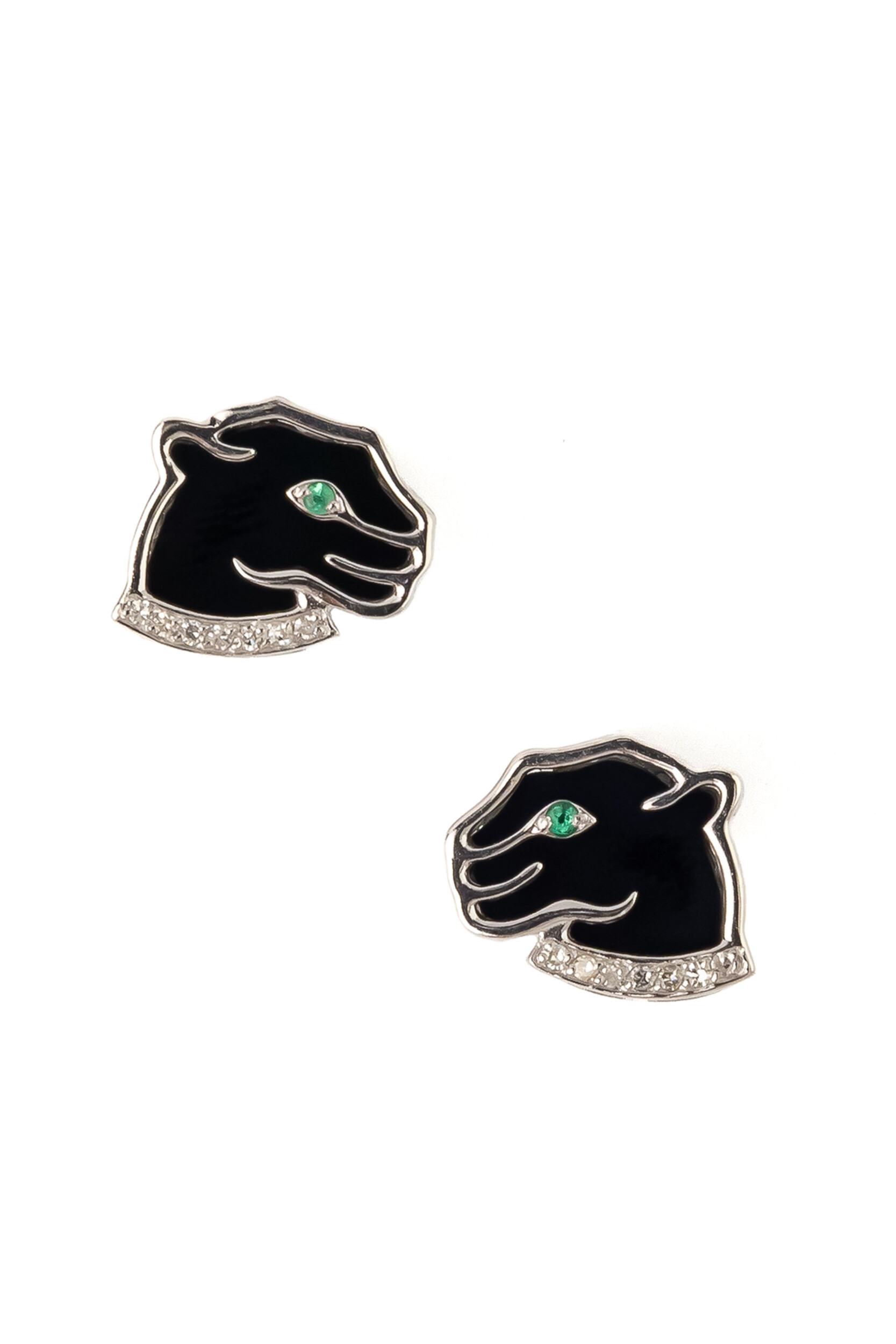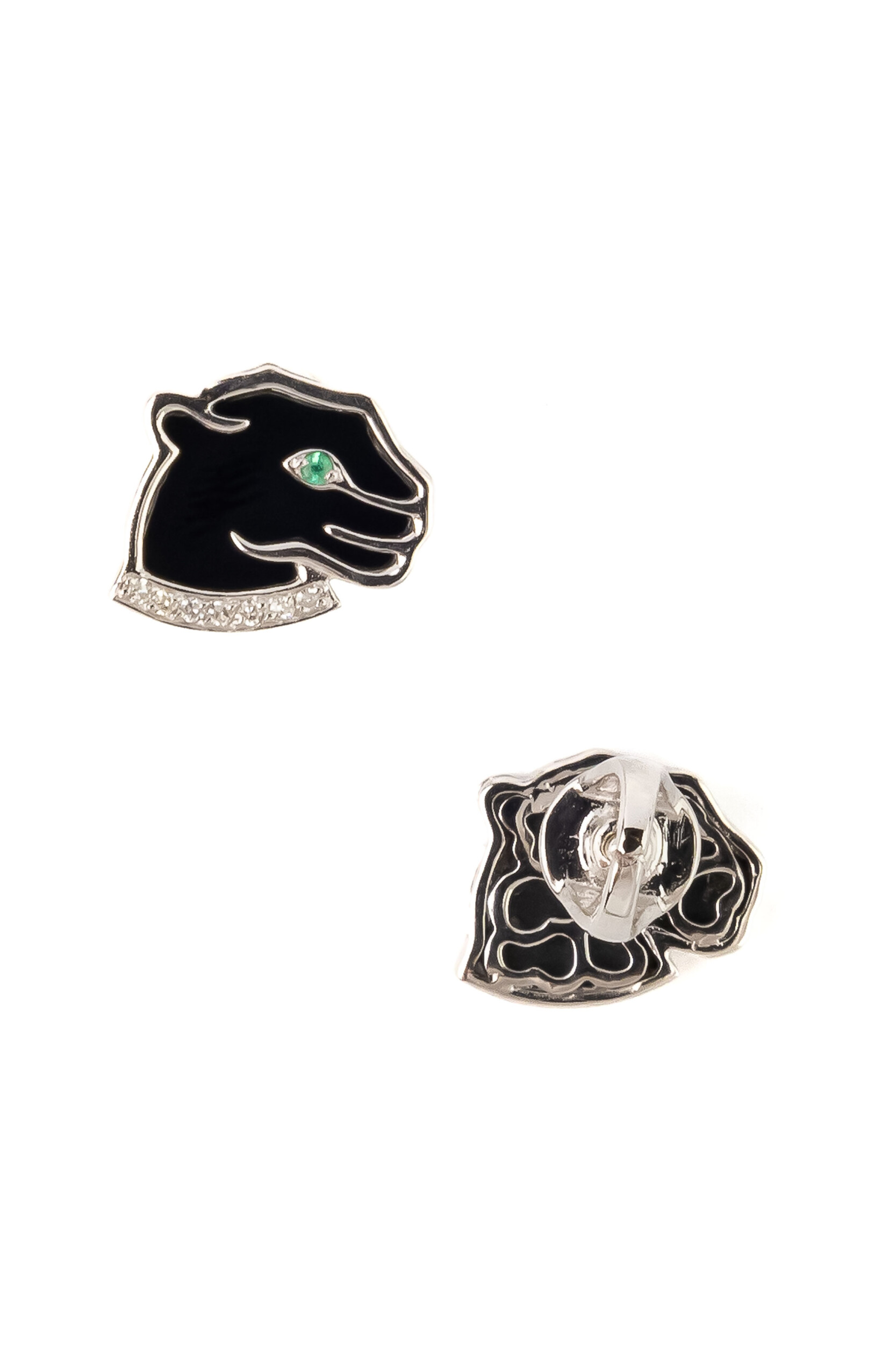 Взгляд пантеры приковывает внимание пронзительной яркостью — глаза животного украшены натуральными изумрудами, придающими изделию особую глубину и выразительность. Дополнительную элегантность и статусность серьгам придает инкрустация бриллиантами, которые мягко мерцают в ожерелье, украшающем шею грациозной кошки. Такое сочетание материалов — оникса, изумрудов и бриллиантов — превращает серьги в настоящее произведение ювелирного искусства.