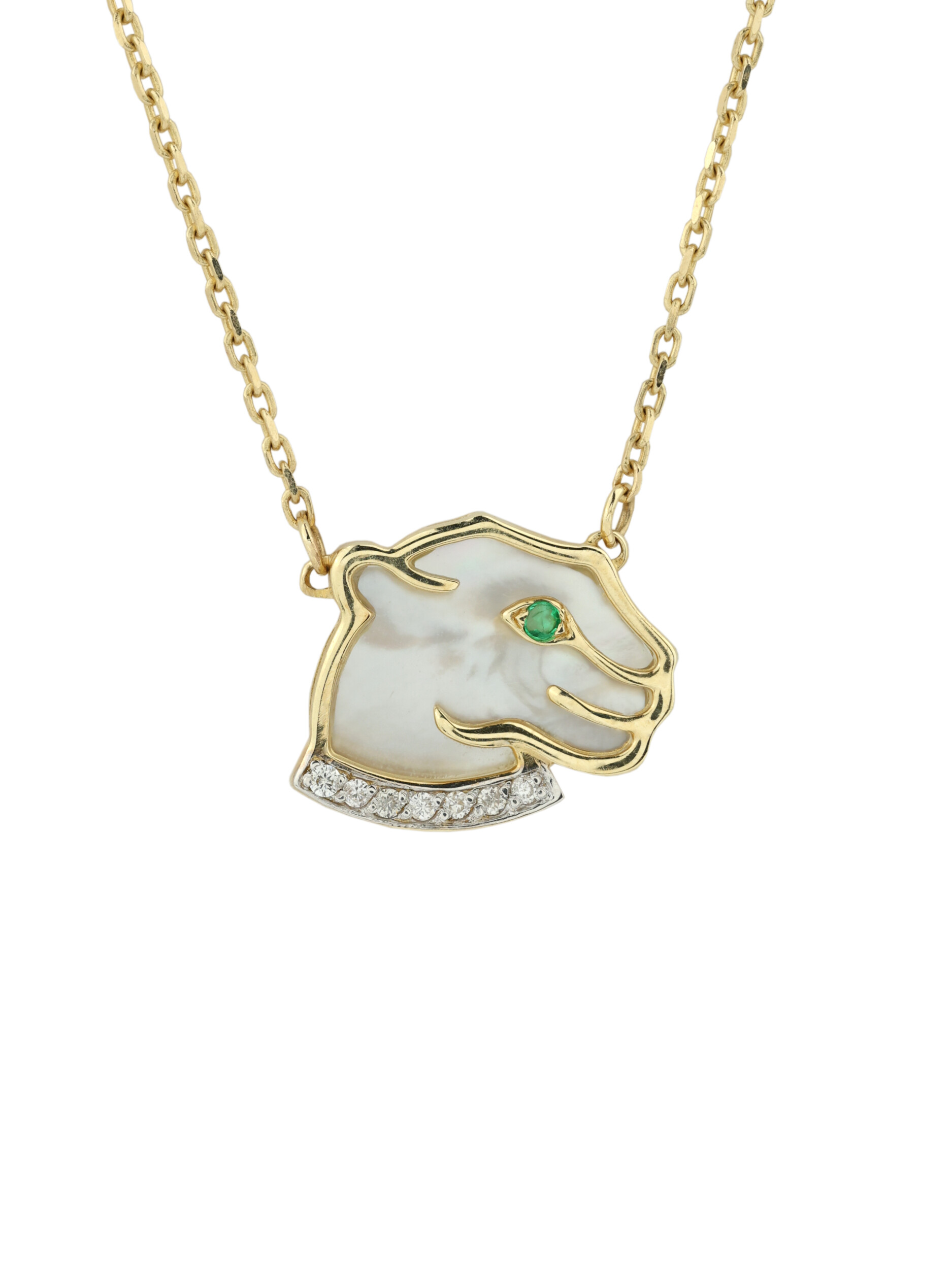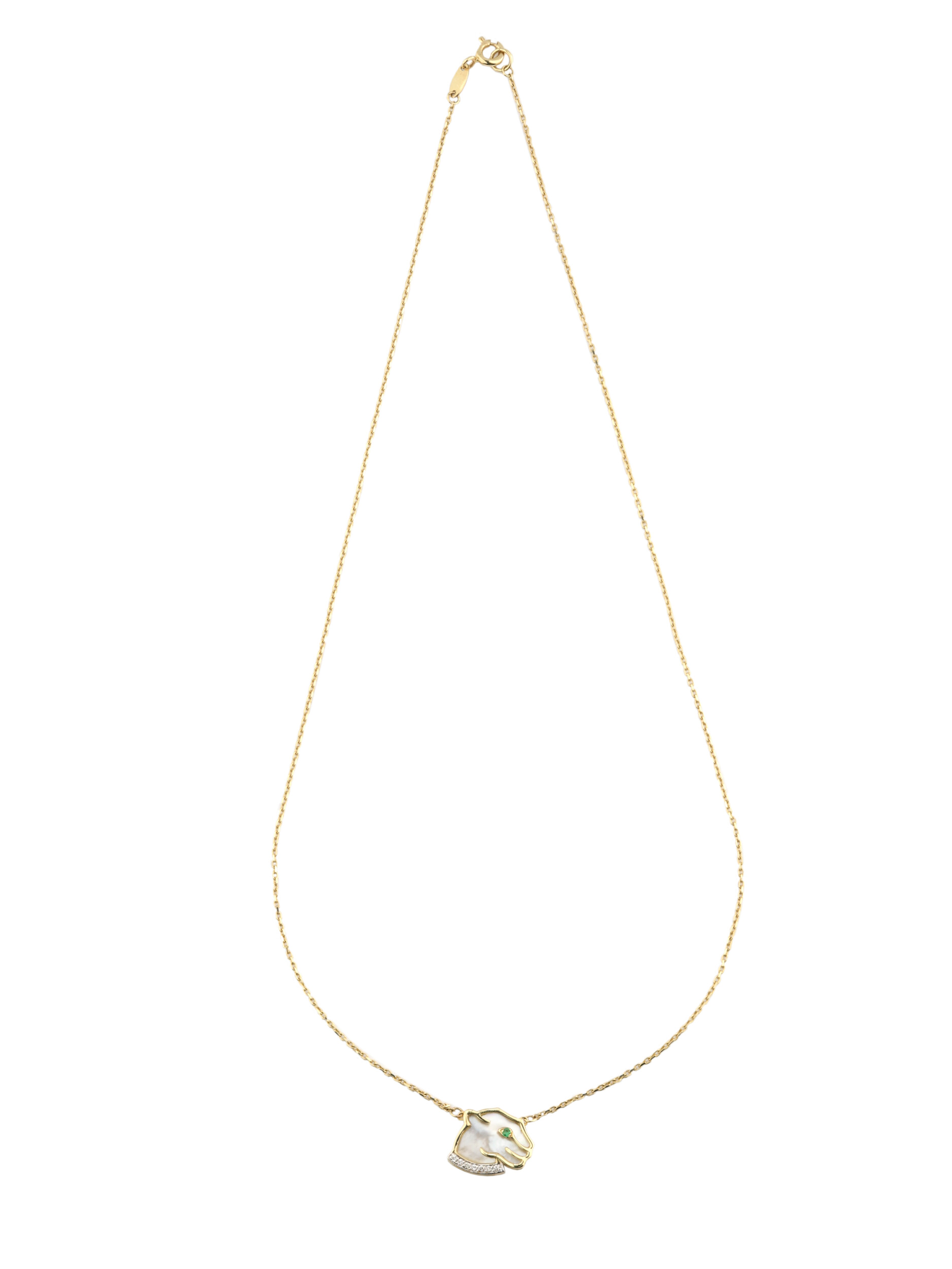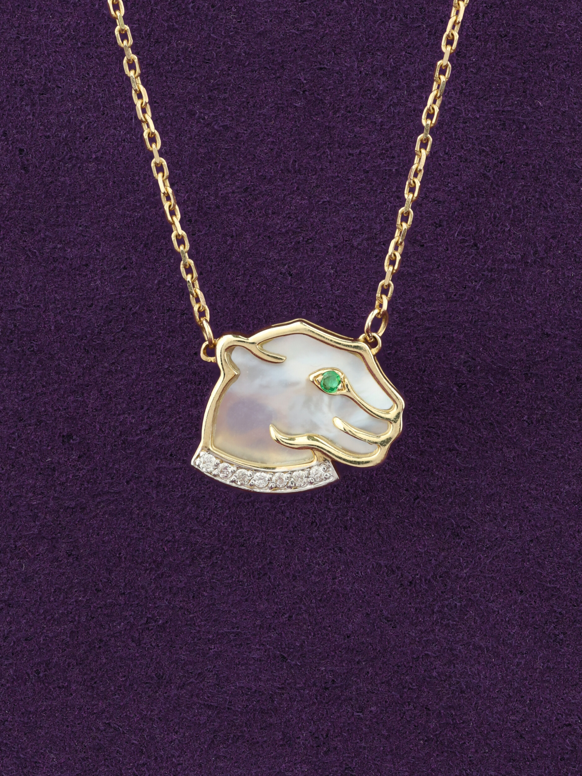 В ювелирной композиции сочетаются три драгоценных материала: сияющий перламутр, который создает нежное переливчатое свечение, глубокий зеленый изумруд в глазе хищника и искрящиеся белые бриллианты. Всего в колье использовано 16 вставок круглой формы, каждая из которых надежно закреплена и призвана приковывать восхищенные взгляды. Лаконичный силуэт пантеры делает это украшение гармоничным дополнением как для женского, так и для мужского образа, подчеркивая статус и индивидуальность владельца.