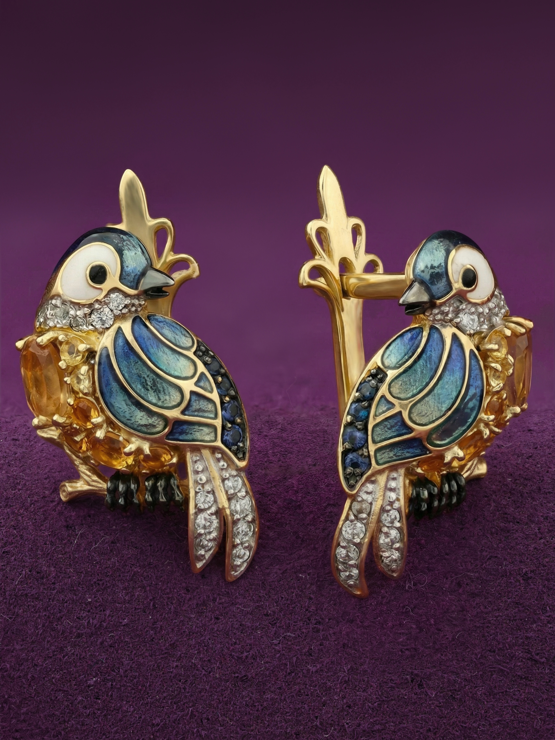 Роскошная композиция дополнена россыпью из 46 вставок, среди которых благородный сапфир синего цвета, сияющий фианит и теплый цитрин. Такое сочетание материалов создает игру света и цвета: желтые оттенки цитрина гармонично контрастируют с глубокими синими тонами сапфиров и эмали. Форма вставок круг и овал гармонично вписана в общую структуру изделия, создавая целостную и завершенную ювелирную композицию.