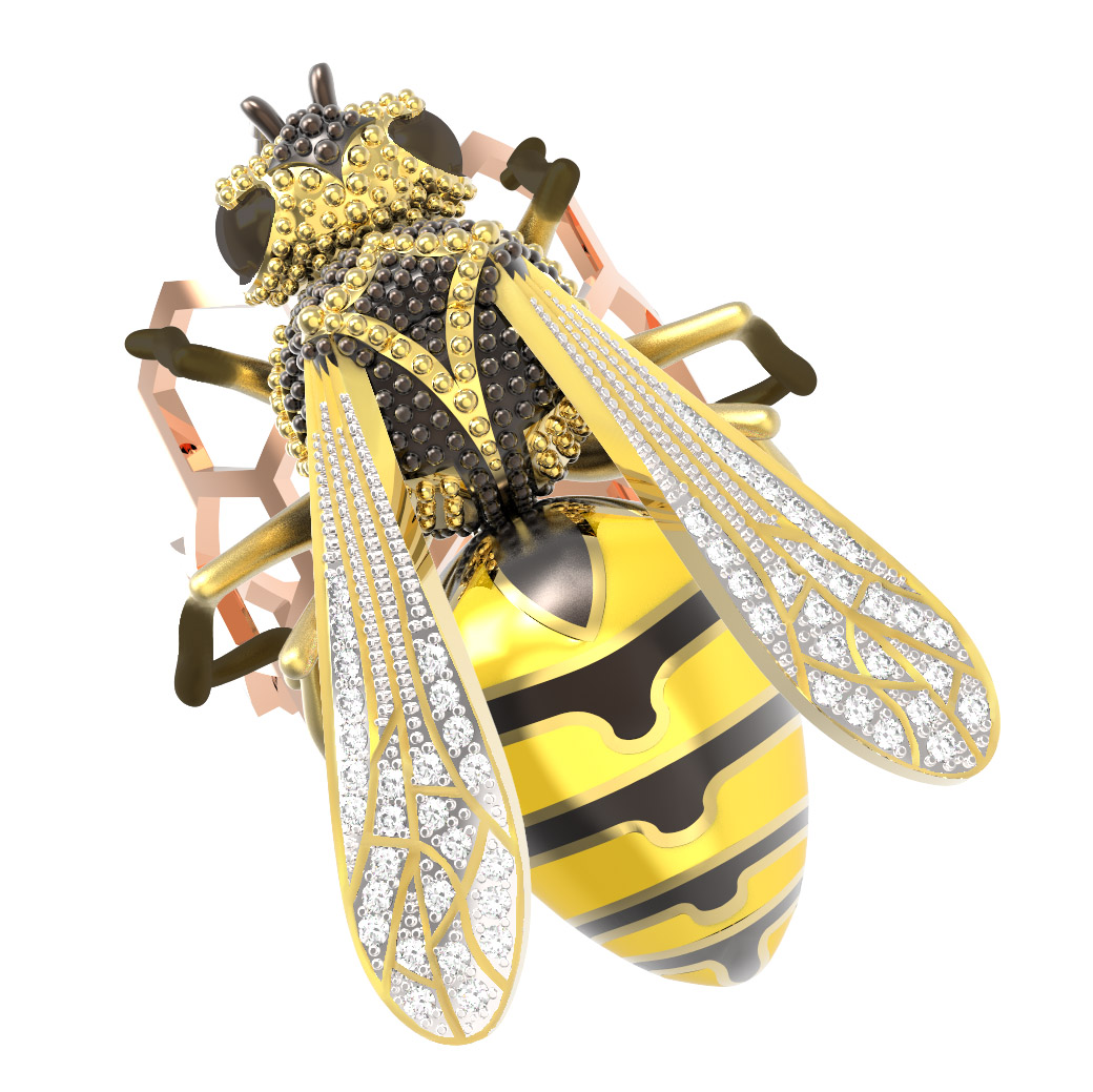 Основа кольца выполнена из качественного красного золота 585 пробы, что обеспечивает прочность и долговечность. Художественное исполнение подчеркивается использованием яркой эмали желтого цвета, создающей естественный узор насекомого. Особую роскошь изделию придают 54 бриллианта круглой формы — их прозрачный белый блеск гармонично дополняет эмалевую вставку, создавая завораживающую игру света на крыльях осы.
