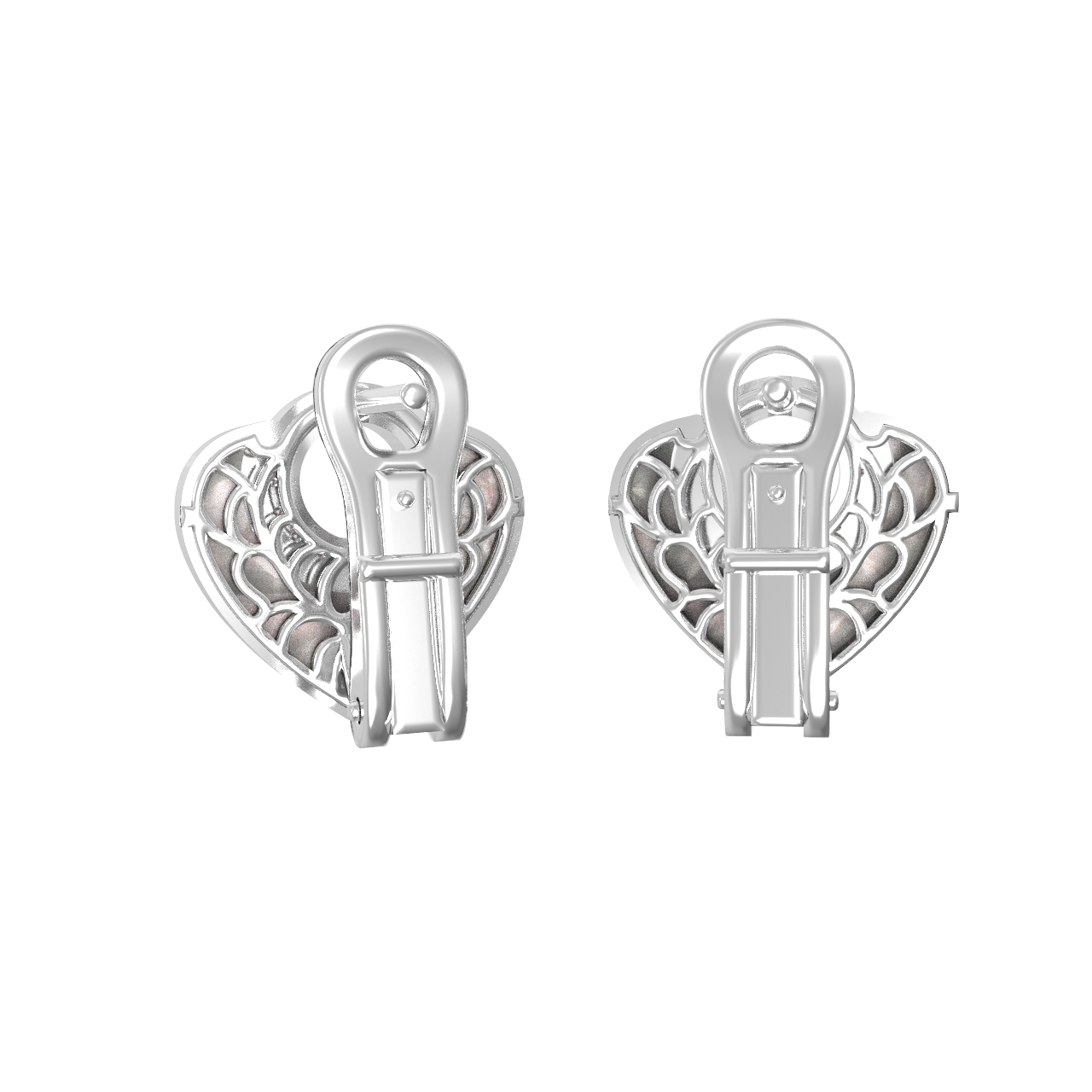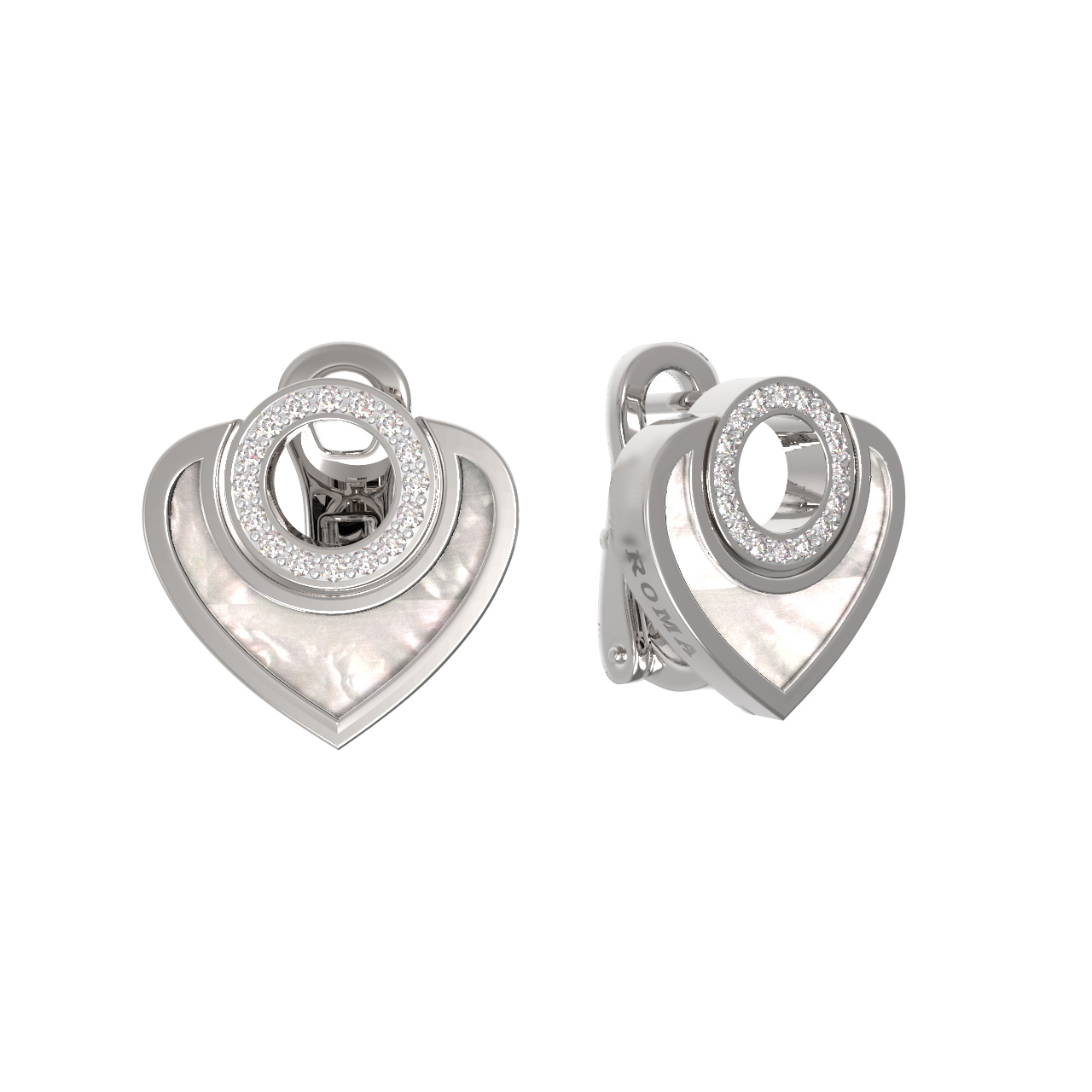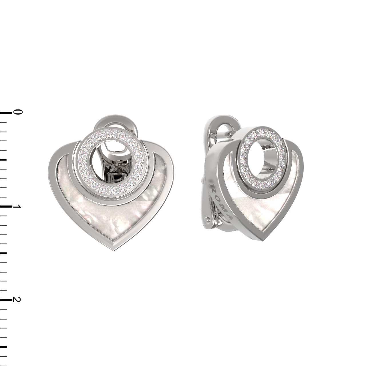 Композиция украшения построена на гармоничном сочетании материалов. Центр декоративной части инкрустирован 32 вставками: сияющими бриллиантами круглой огранки и переливающимся перламутром. Белый цвет вставок создает целостный и выразительный образ, который притягивает взгляд своей чистотой и элегантностью. Сочетание классической формы сердца и современного исполнения делает эти серьги универсальным дополнением к любому образу.