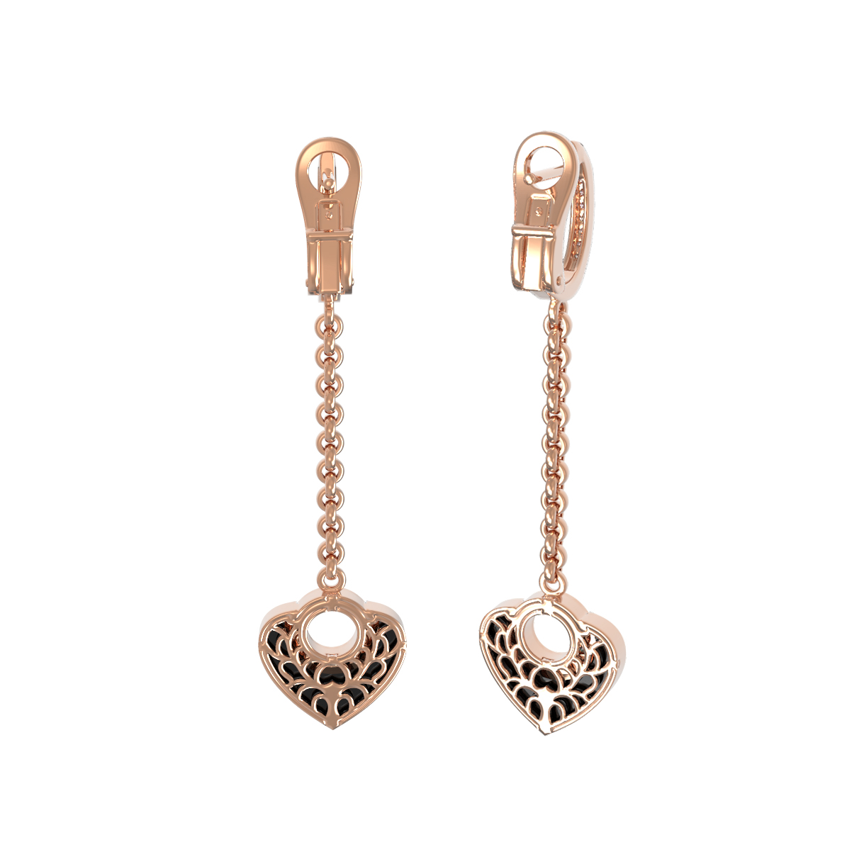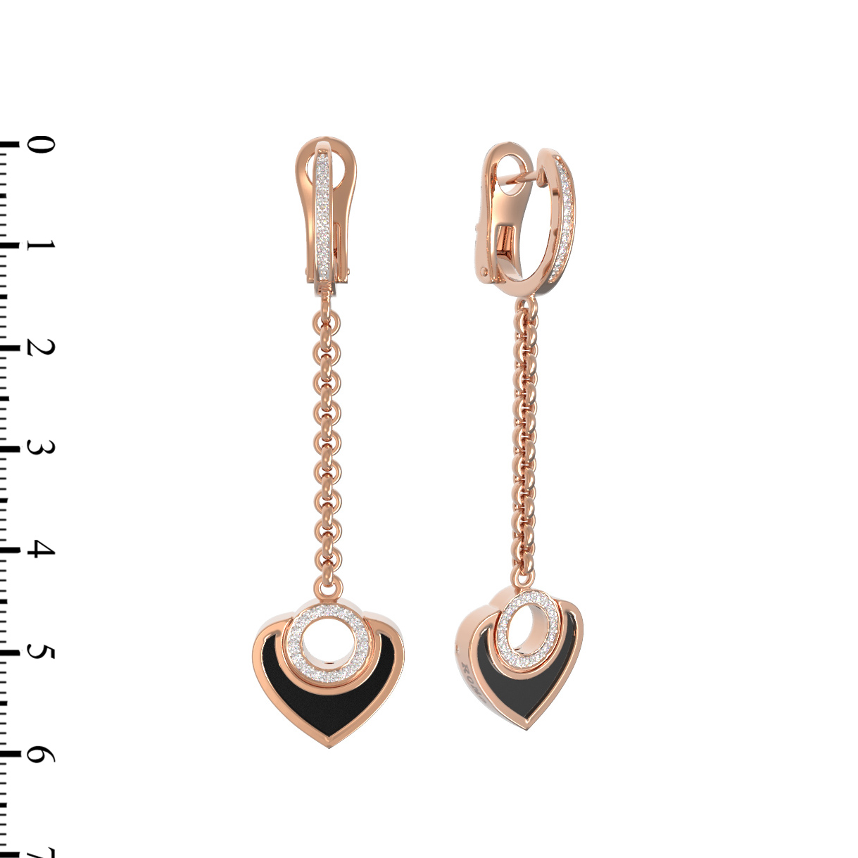 Роскошный блеск красного золота дополнен контрастной игрой вставок: глубокий черный оникс в форме сердца изысканно сочетается с сияющими белыми бриллиантами круглой огранки. Всего в изделии использовано 50 драгоценных камней, которые создают эффектное мерцание при каждом движении. Длинные цепочки добавляют динамики, визуально удлиняя линию шеи и привлекая внимание к лицу.