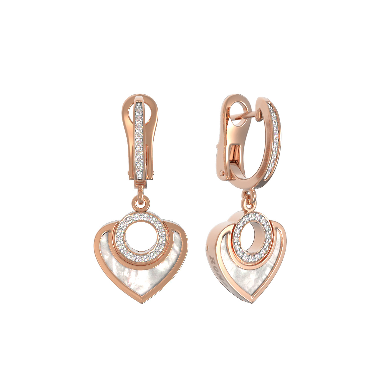 Композиция украшена 48 вставками: сияющими бриллиантами белого цвета круглой огранки и перламутром, обладающим неповторимым мягким свечением. Сочетание теплого оттенка красного золота и прохладного сияния перламутра создает гармоничный контраст, притягивающий восхищенные взгляды. Эти серьги созданы для тех, кто ценит эстетику и качество в каждой детали.