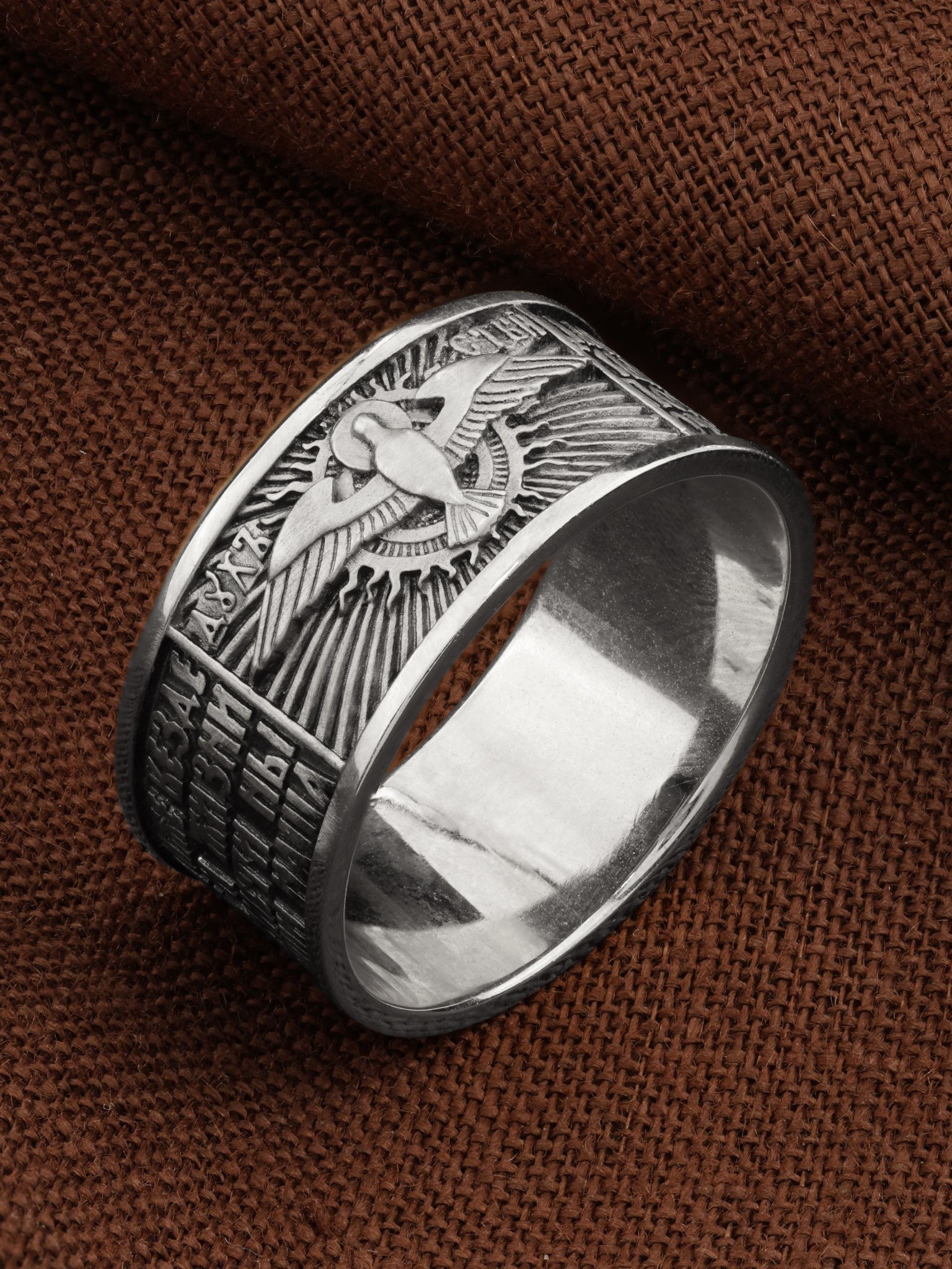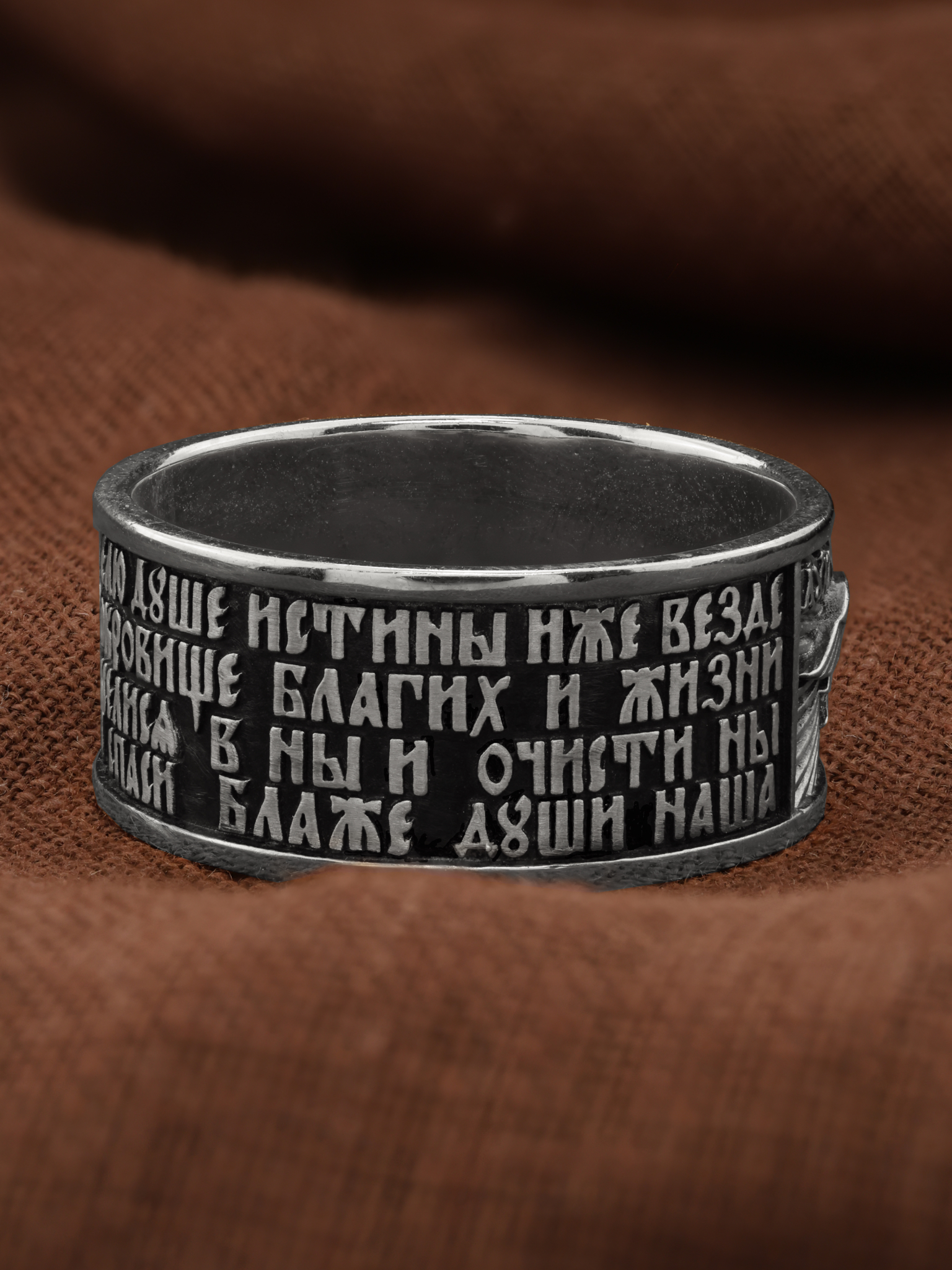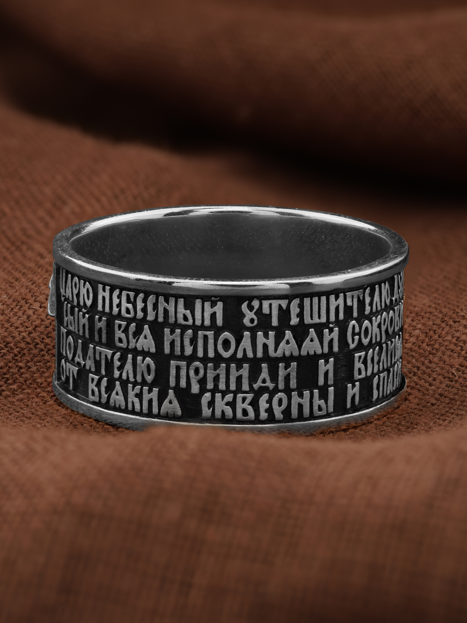 На лицевой стороне кольца изображен Святой Дух в виде голубя и помещена молитва Святому Духу: «Царю Небесный, Утешителю, Душе истины, Иже везде сый и вся исполняяй, Сокровище благих и жизни Подателю, прииди и вселися в ны, и очисти ны от всякия скверны, и спаси, Блаже, души наша».