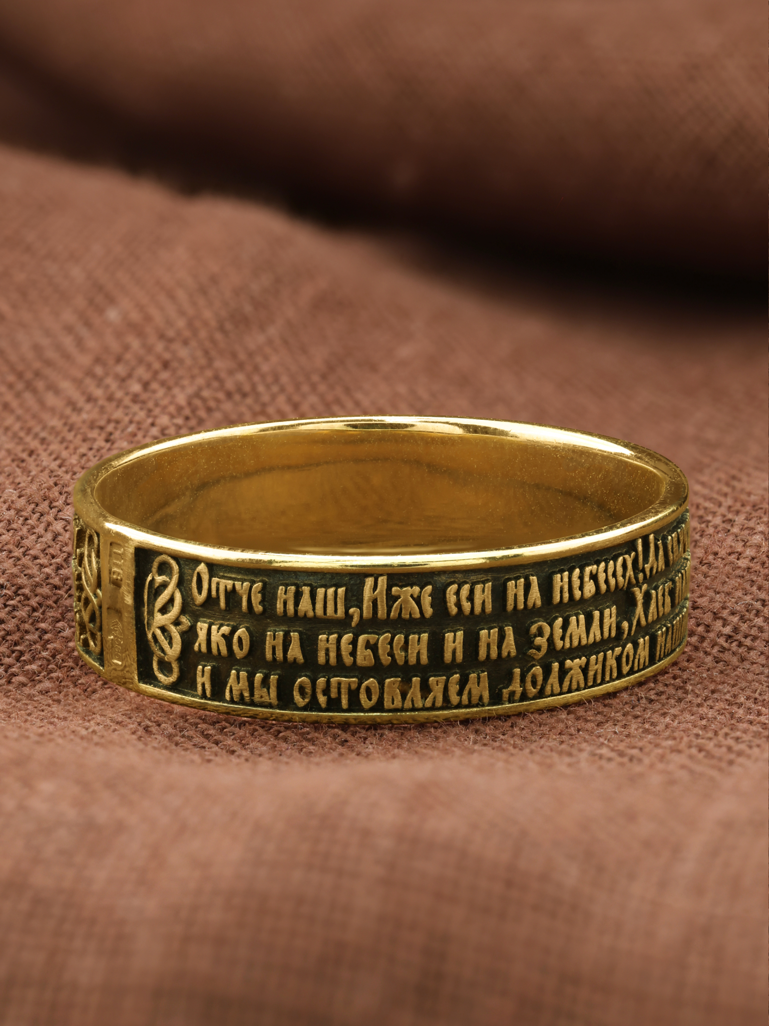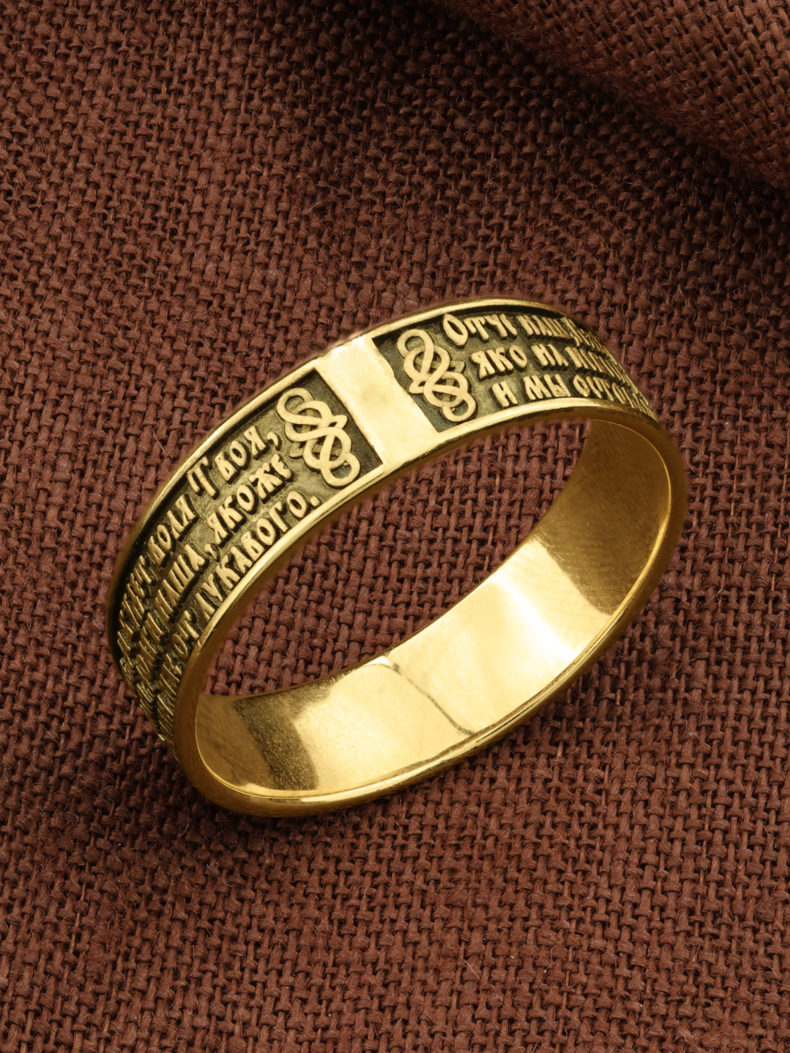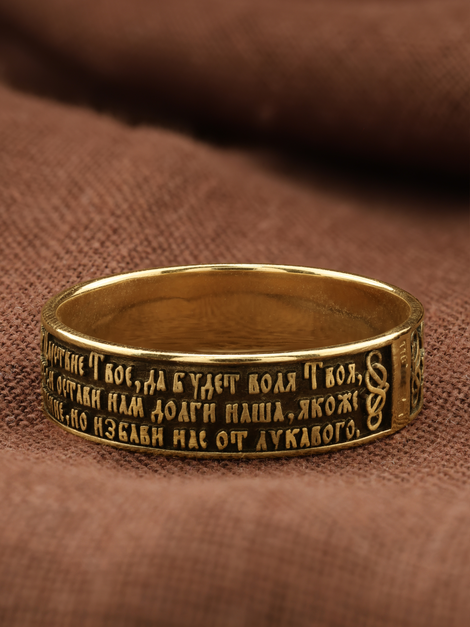 На лицевой стороне кольца отображена Божественная молитва к Богу Отцу, которую, Господь Иисус Христос дал своим ученикам. Молитва Господня приводится в Евангелиях в двух вариантах, более пространном в Евангелии от Матфея и кратком — в Евангелии от Луки. Различны и обстоятельства при которых Христос произносит текст молитвы. В Евангелии от Матфея «Отче наш» входит в состав Нагорной проповеди. Евангелист Лука пишет, что апостолы обратились к Спасителю: «Господи! Научи нас молиться, как и Иоанн научил учеников своих » (Лк. 11, 1). «Отче наш, Иже еси на небесе? х! Да святится имя Твое, да прии? дет Царствие Твое, да будет воля Твоя, яко на небеси? и на земли?. Хлеб наш насущный да? ждь нам дне? сь; и оста? ви нам до? лги наша, якоже и мы оставляем должнико? м нашим; и не введи нас во искушение, но изба? ви нас от лукаваго.»