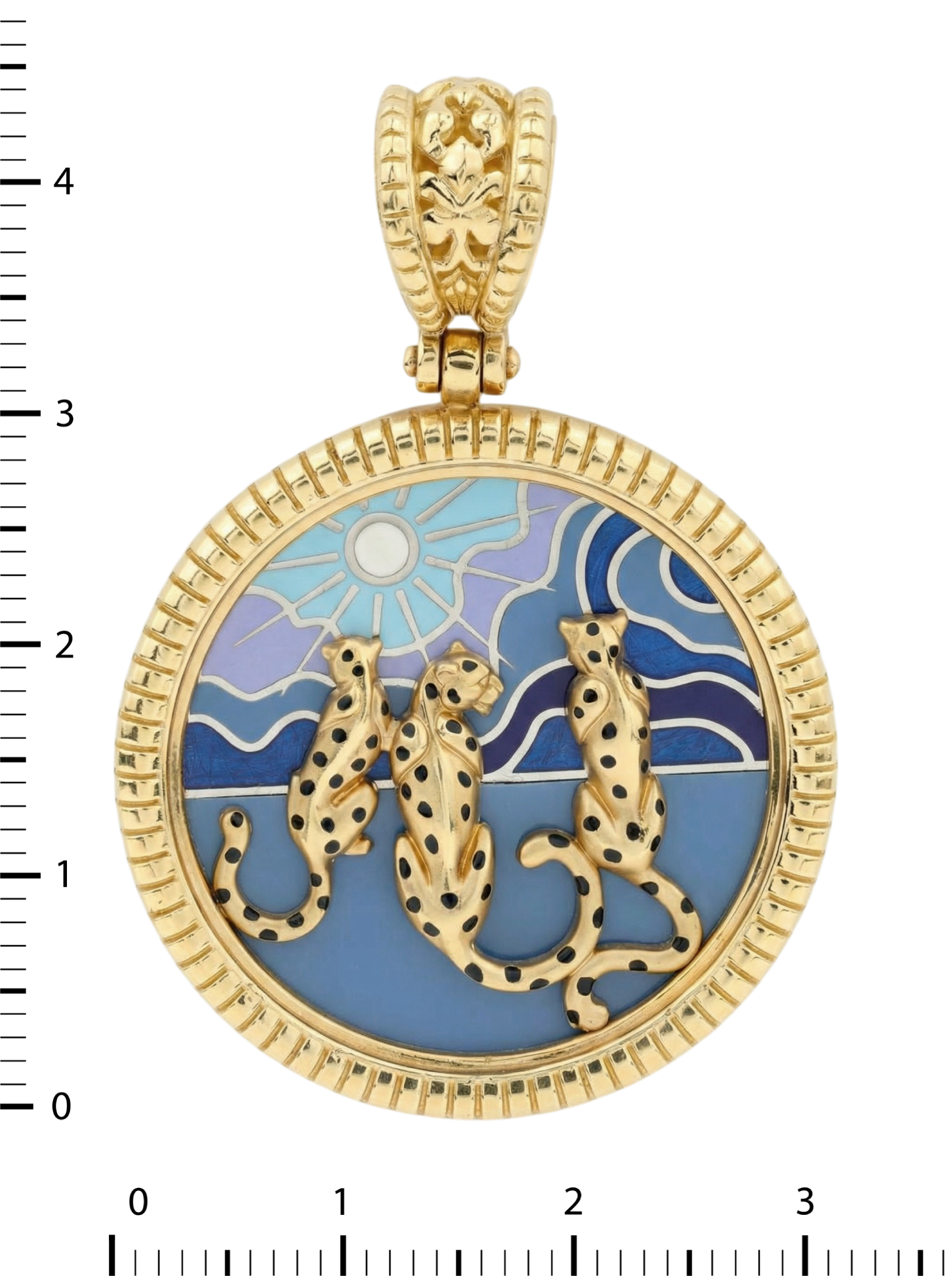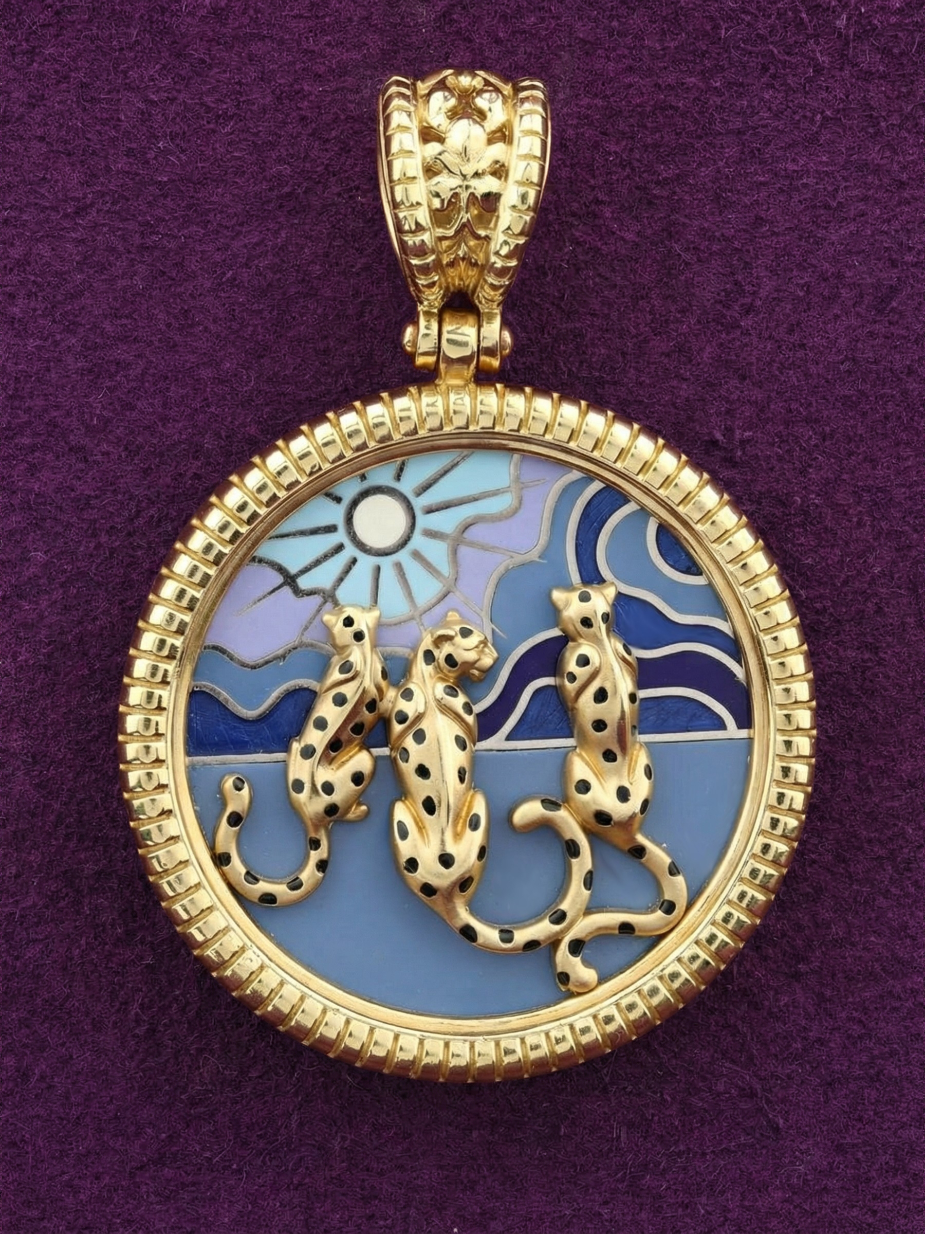 Подвеска из лимонного золота с эмалью — это выразительное украшение, которое станет ярким акцентом вашего образа. Изделие выполнено из качественного лимонного золота 585 пробы, обладающего благородным, солнечным оттенком. Дизайнерское решение в виде грациозных леопардов превращает украшение в миниатюрное произведение искусства. На круглой основе запечатлен живописный сюжет с хищниками на фоне стилизованного пейзажа, где небо и горизонт переданы через глубокую палитру разноцветной эмали.