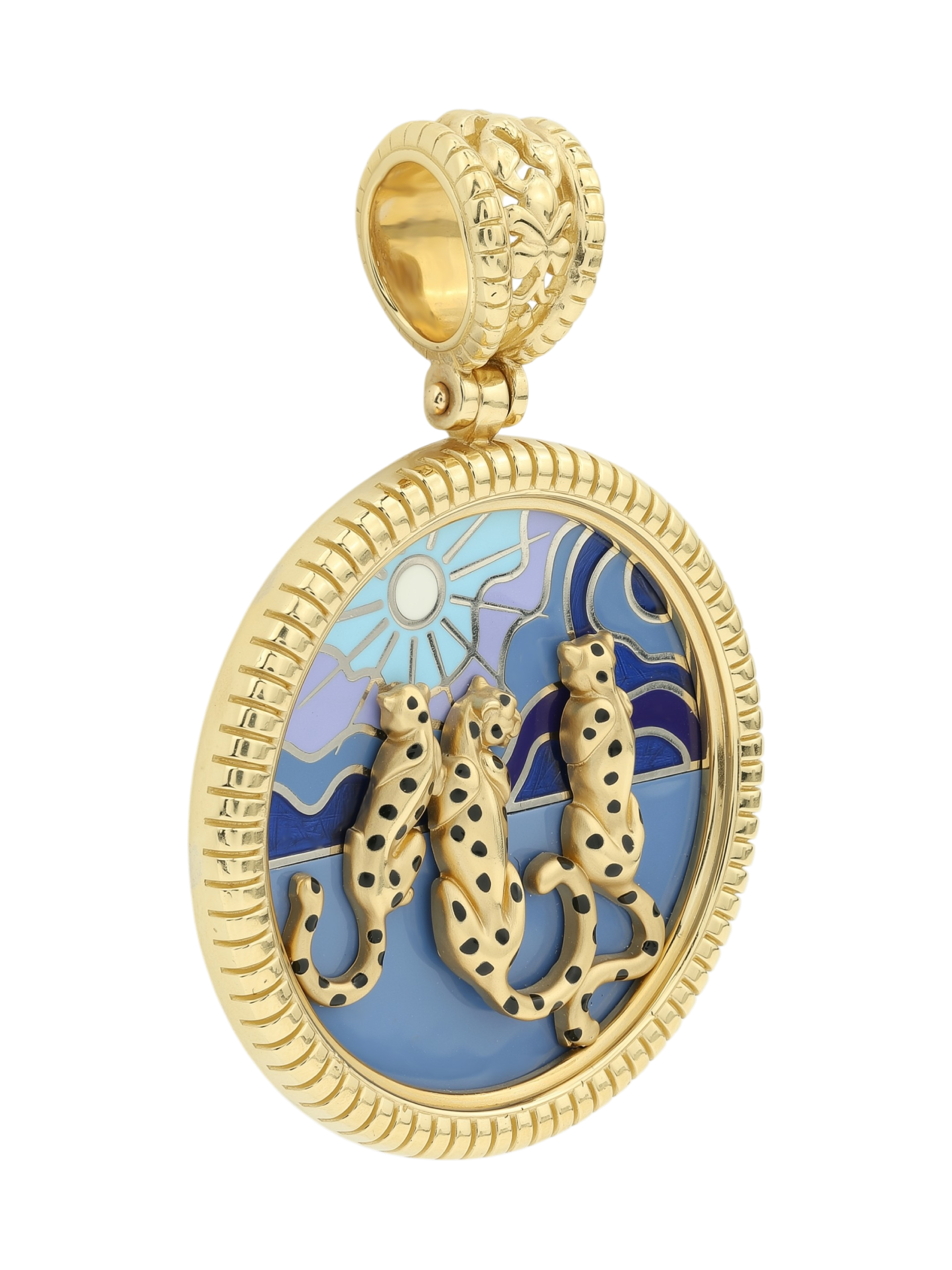 Данная подвеска относится к линейке De luxe Premium — Леопарды — рассвет и закат и привлекает внимание своей детальной проработкой каждого элемента — от пятнистого окраса леопардов до текстурного ободка изделия. Это стильный аксессуар, который одинаково гармонично дополнит как женский, так и мужской образ, добавляя нотку экзотики и статусности. Ювелирное изделие обладает универсальностью и может использоваться как самостоятельное украшение, так и стать частью гармоничного комплекта.