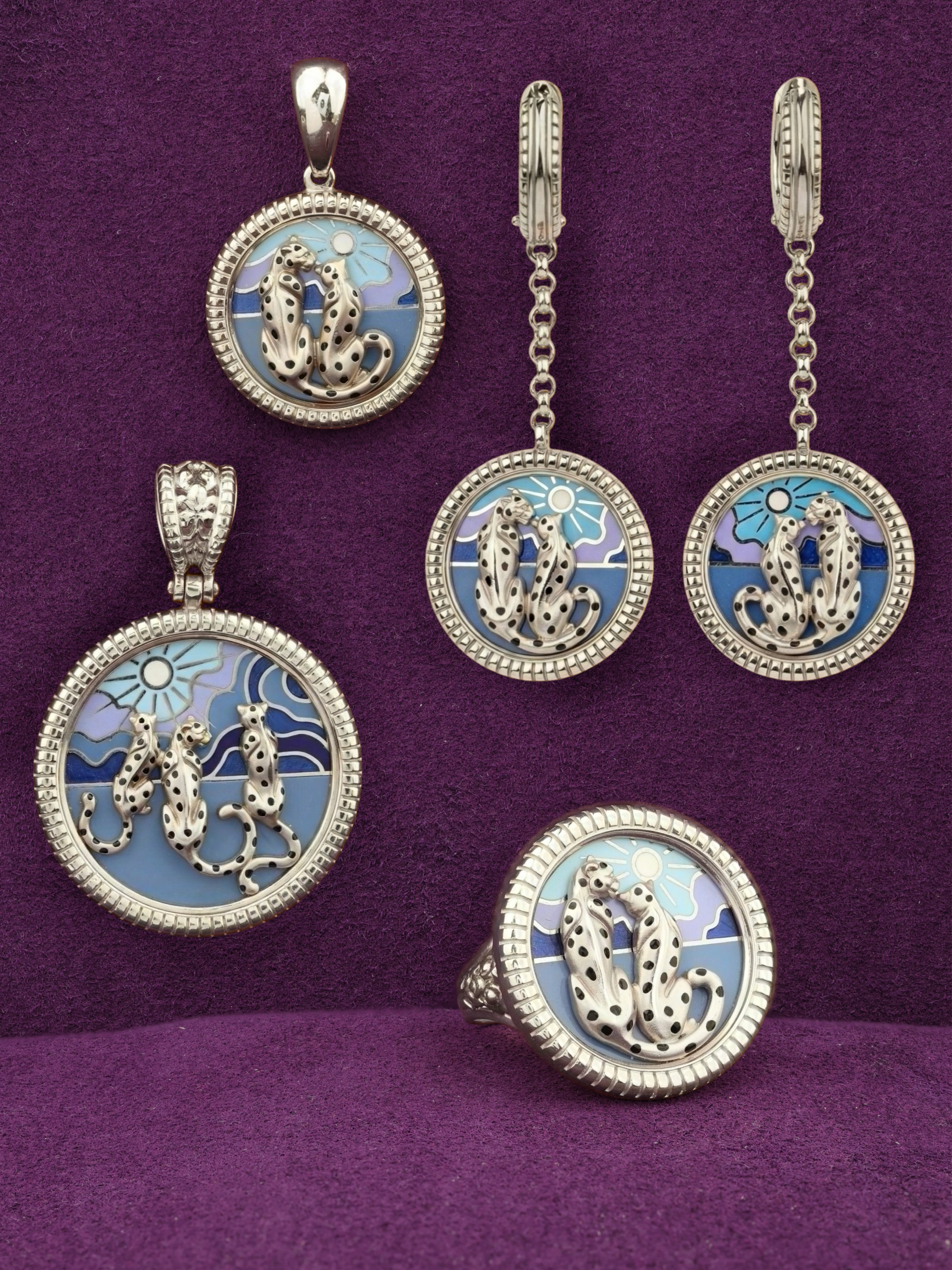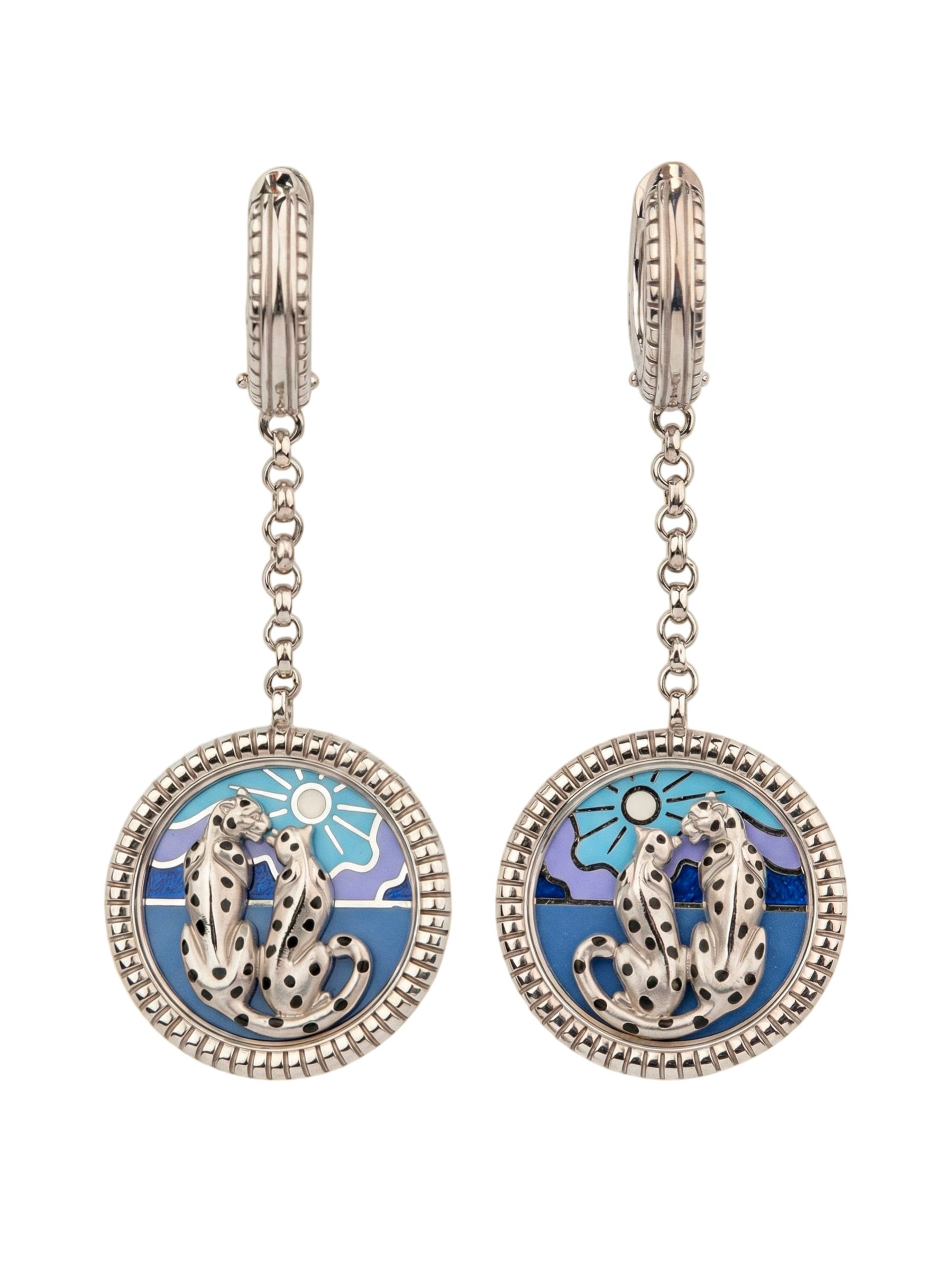 Эффектные серьги из белого золота 585 пробы — это воплощение ювелирного искусства, вдохновленное грацией дикой природы. Украшение входит в авторскую серию De luxe Premium — Леопарды — рассвет и закат и привлекает внимание своим уникальным дизайном: в центре круглых подвесок расположена выразительная фигура леопарда, выполненная с ювелирной точностью. Изящный хищник вписан в атмосферный пейзаж рассвета и заката, переданный с помощью техники эмали. Контрастные оттенки разноцветной эмали создают глубину и игру света, подчеркивая благородный холодный блеск белого золота.