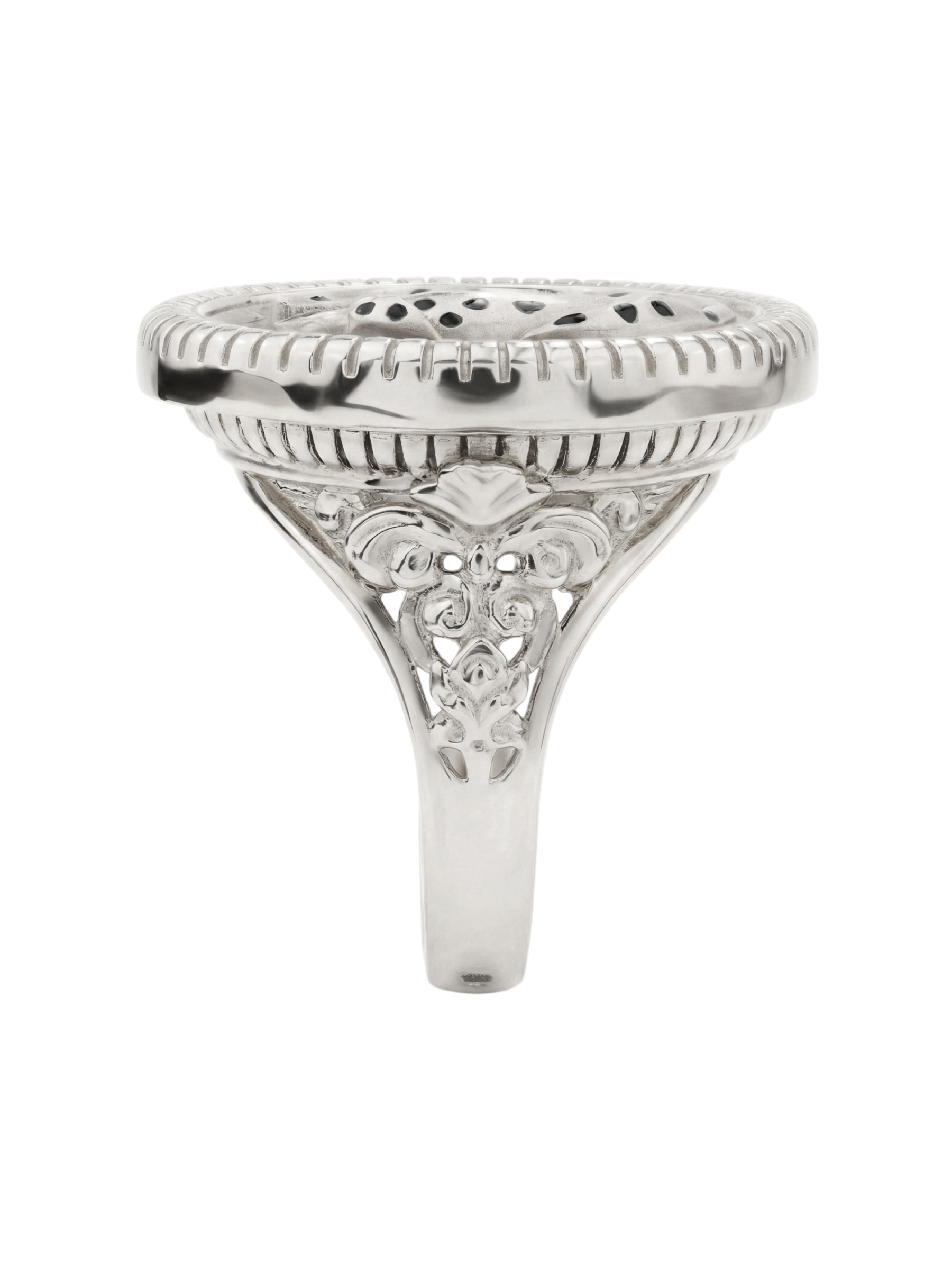 Белое золото холодного оттенка подчеркивает благородство композиции, создавая идеальный фон для эмалевой вставки. Массивная округлая форма кольца придает изделию солидный и статусный вид, делая его гармоничным дополнением как женского, так и мужского образа. Универсальность исполнения позволяет носить данную модель самостоятельно или дополнить ее другими украшениями из этой серии, создав законченный гарнитур.