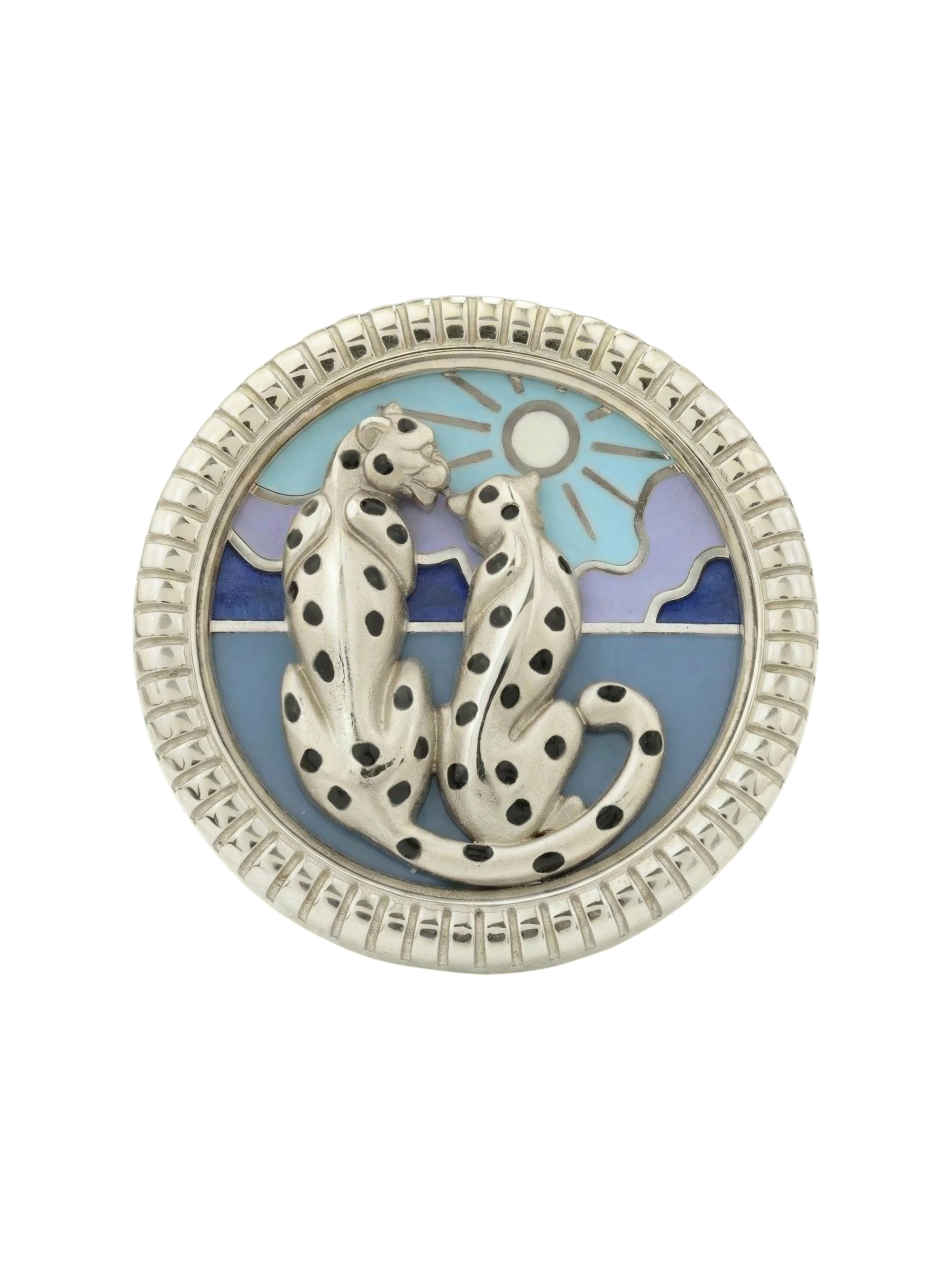 Кольцо из белого золота 585 пробы из коллекции De luxe Premium — Леопарды — рассвет и закат — это воплощение ювелирного искусства, созданное для тех, кто ценит эстетику и смелые художественные решения. Центральным элементом украшения выступает искусная миниатюра с изображением грациозных леопардов, выполненная с использованием яркой разноцветной эмали. Детализированный дизайн передает всю динамику и пластику этих диких кошек, превращая аксессуар в настоящий арт-объект на вашем пальце.