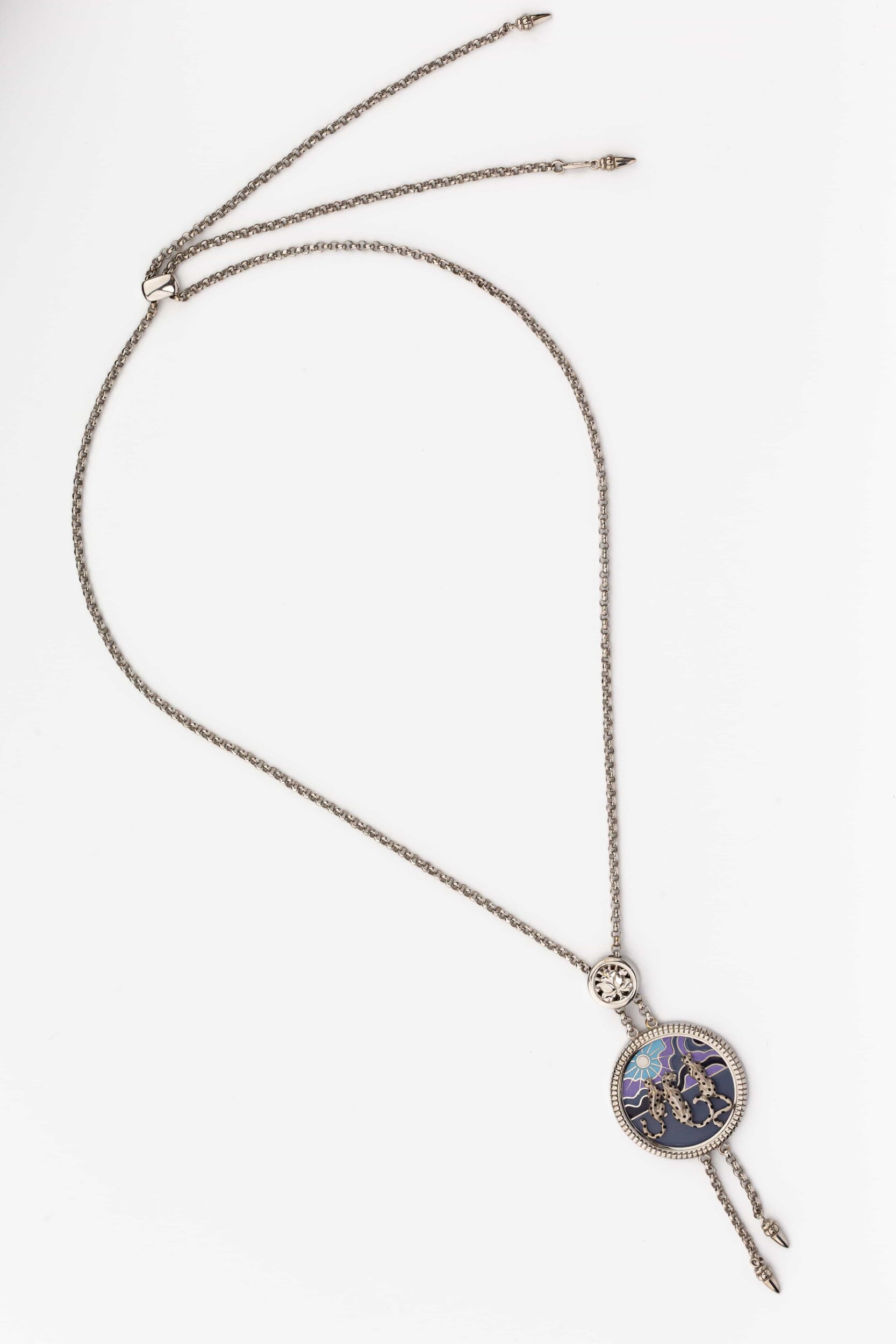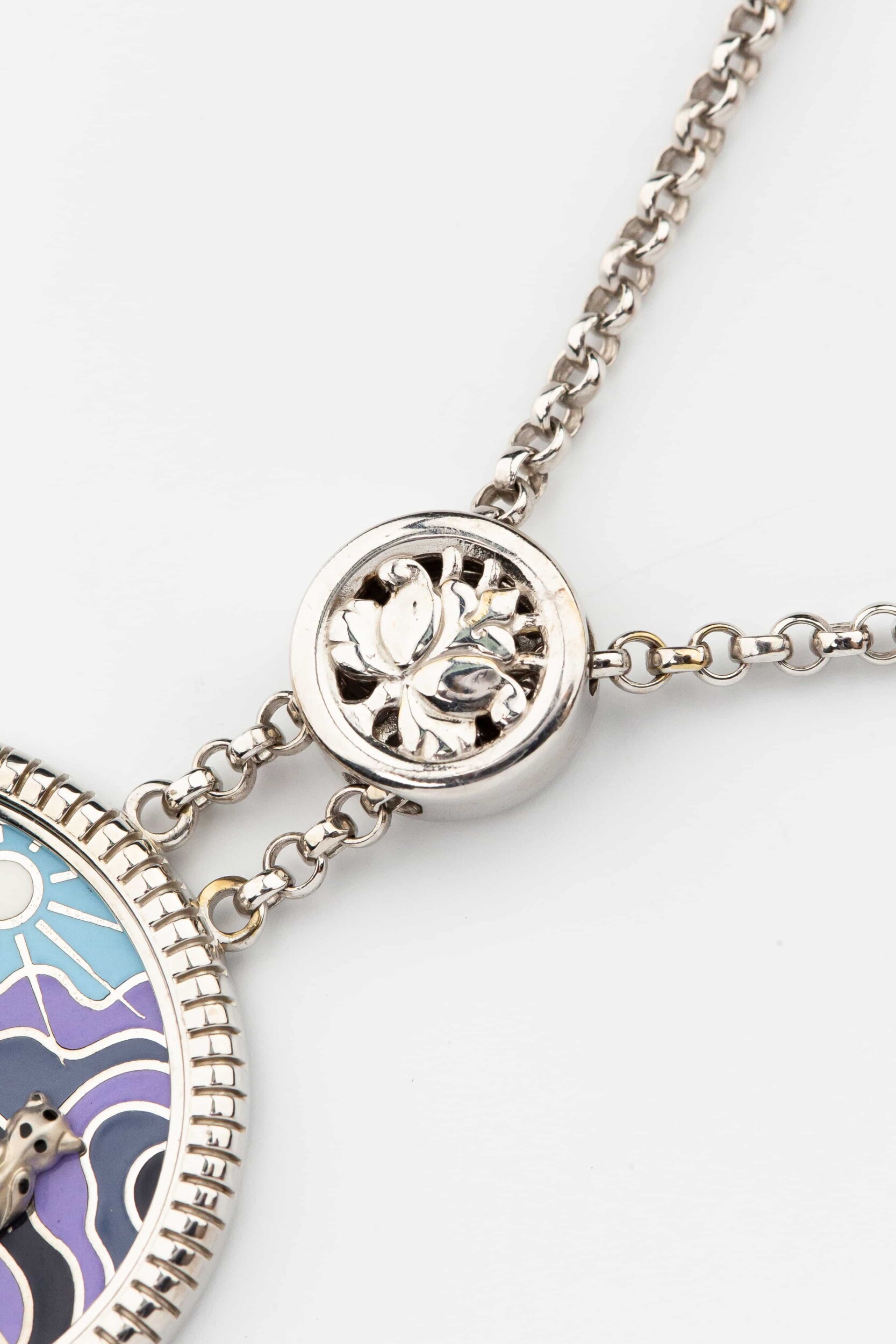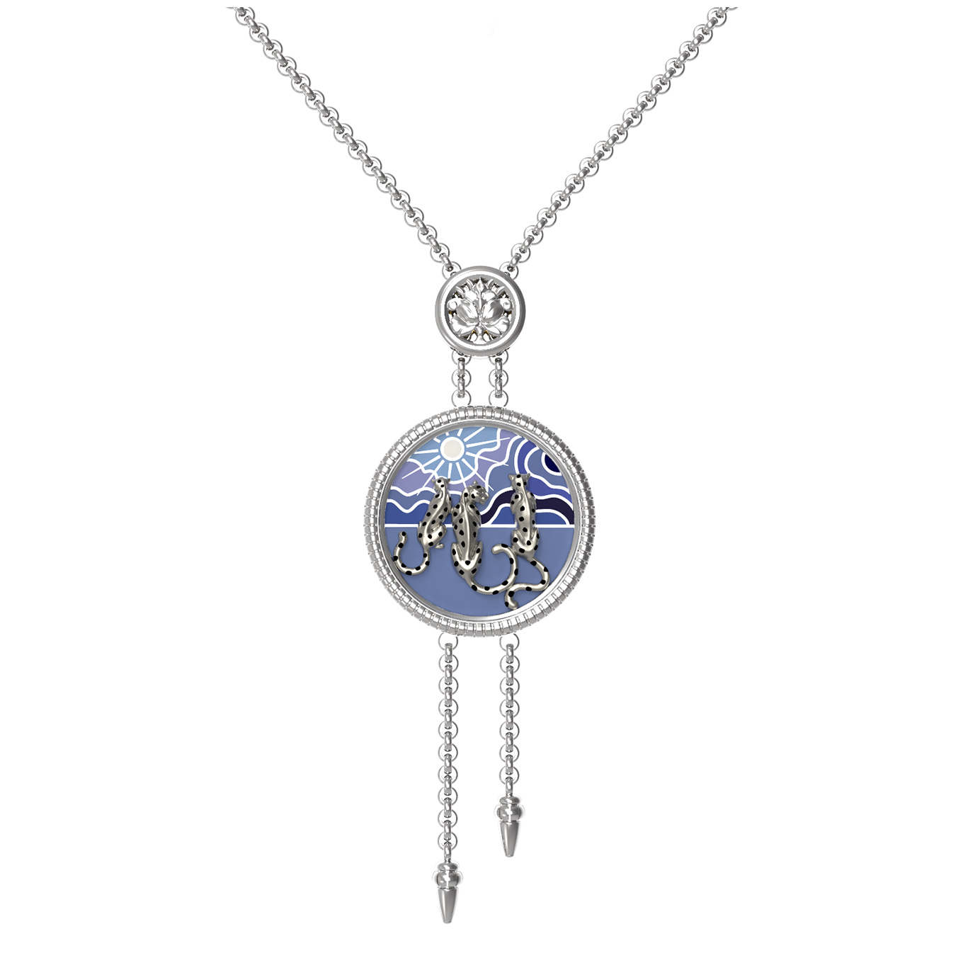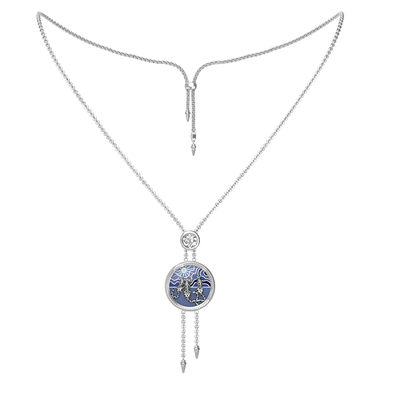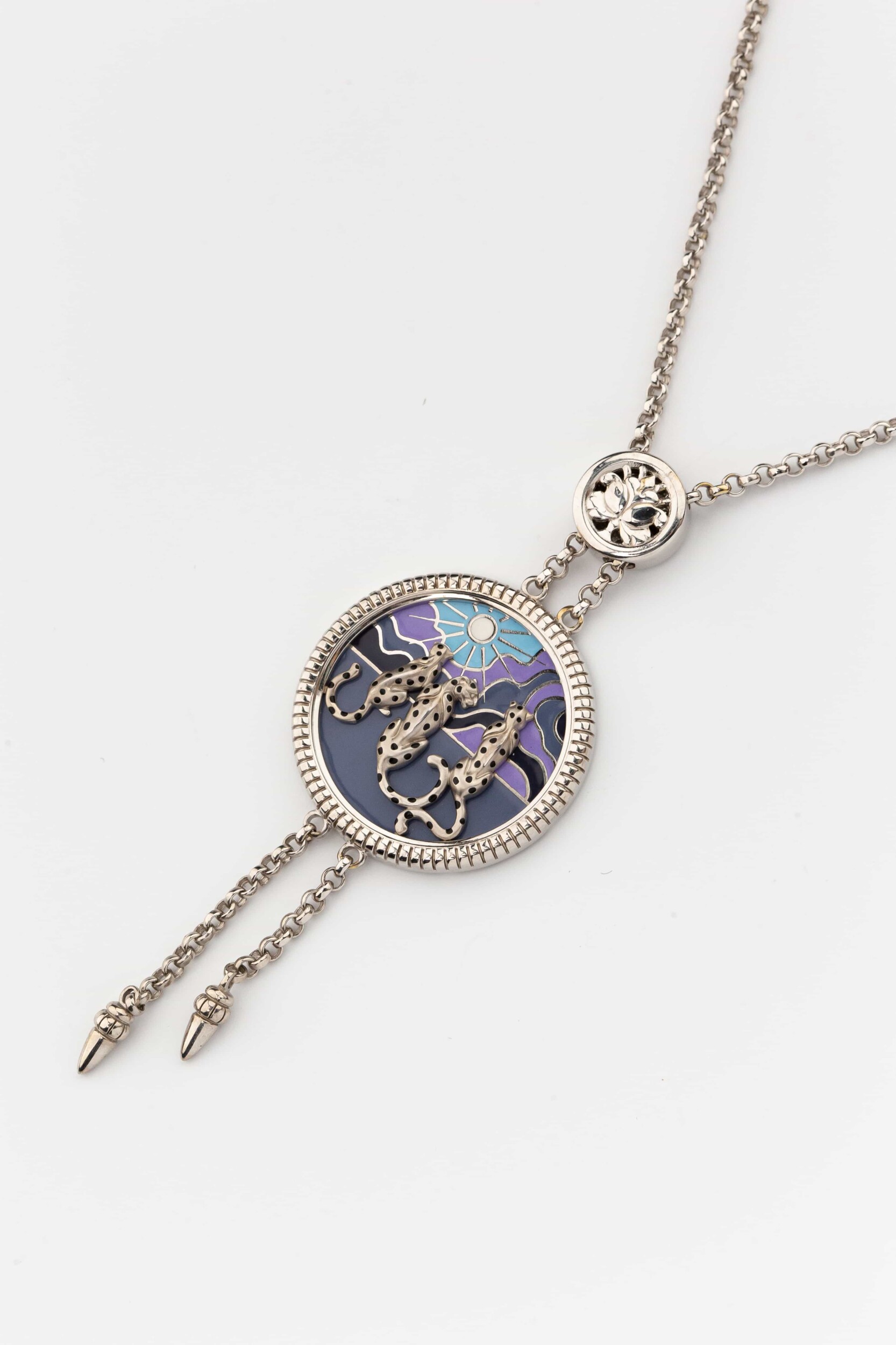 Откройте для себя истинное искусство ювелирного дела с уникальным колье из коллекции De luxe Premium — Леопарды — рассвет и закат. Это украшение, выполненное из качественного белого золота 585 пробы, станет выразительным акцентом вашего образа. Дизайн изделия вдохновлен грацией дикой природы: центральным элементом колье выступает изысканная вставка из разноцветной эмали, изображающая леопардов в гармонии с природными мотивами. Холодный блеск белого металла идеально сочетается с глубиной эмалевого покрытия, создавая притягательный визуальный контраст.