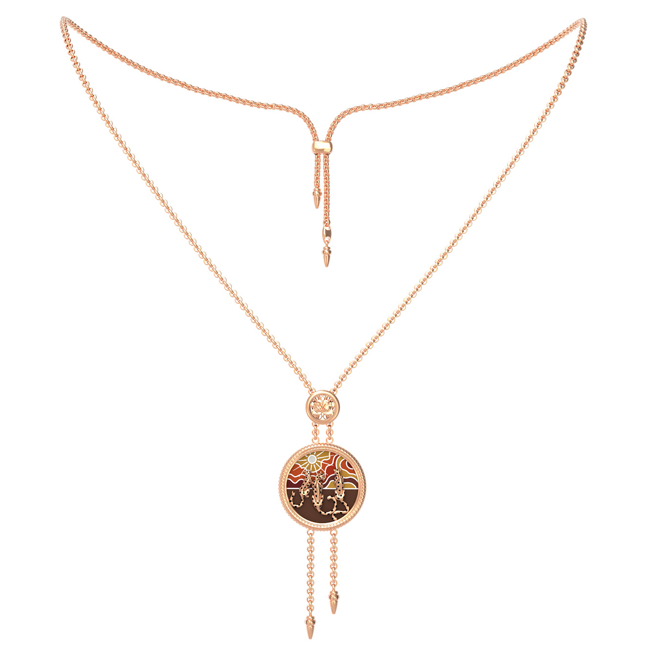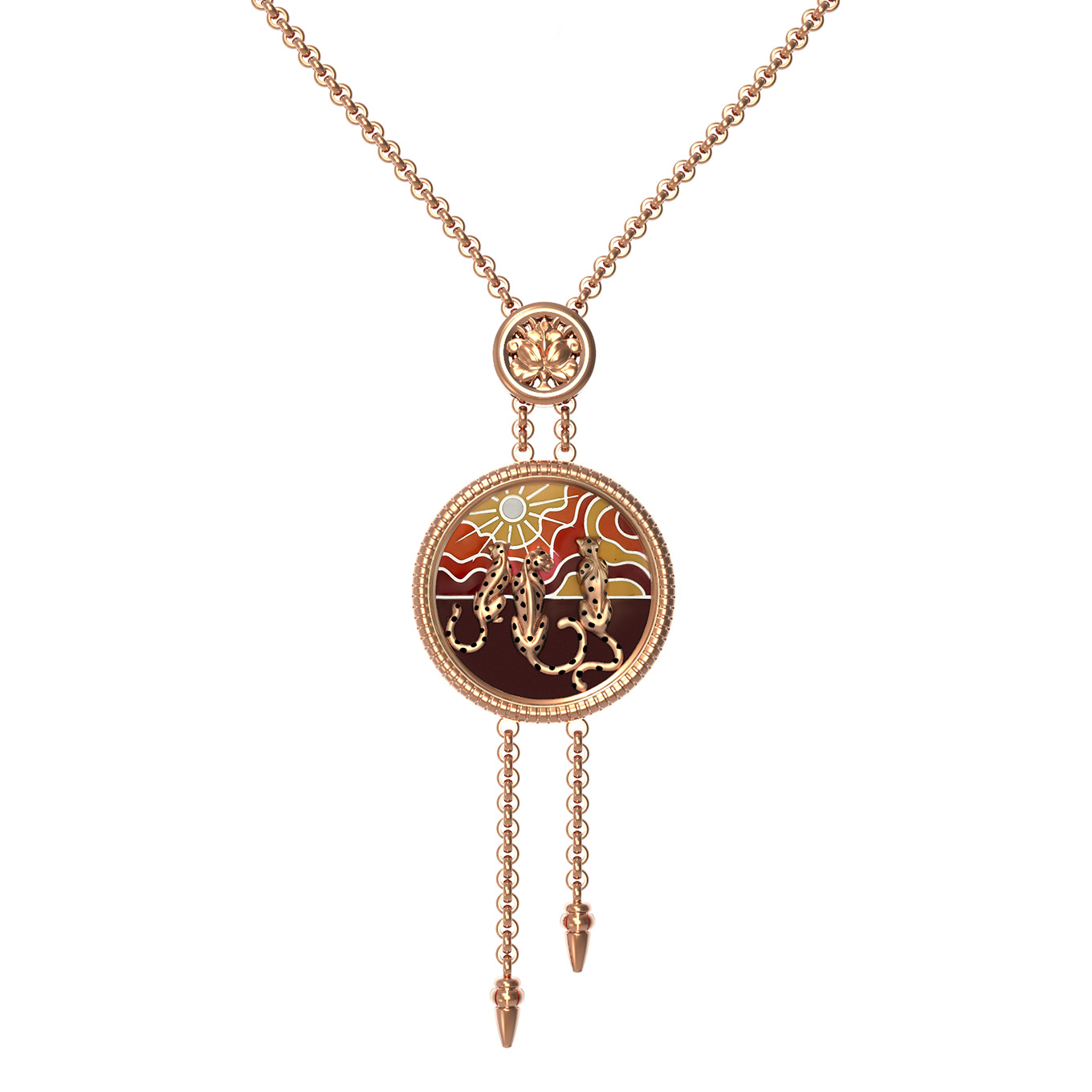 Элегантное колье из красного золота 585 пробы станет утонченным дополнением вашего образа. Это изделие, представленное в рамках коллекции De luxe Premium — Леопарды — рассвет и закат, воплощает в себе гармонию природной красоты и ювелирного мастерства. В центре композиции находится изящный кулон с искусным дизайном в виде грациозных леопардов, выполненный на фоне разноцветной эмали, передающей атмосферу рассвета и заката. Красный оттенок золота подчеркивает глубину и насыщенность красок эмалевой вставки, создавая эффектный контраст.