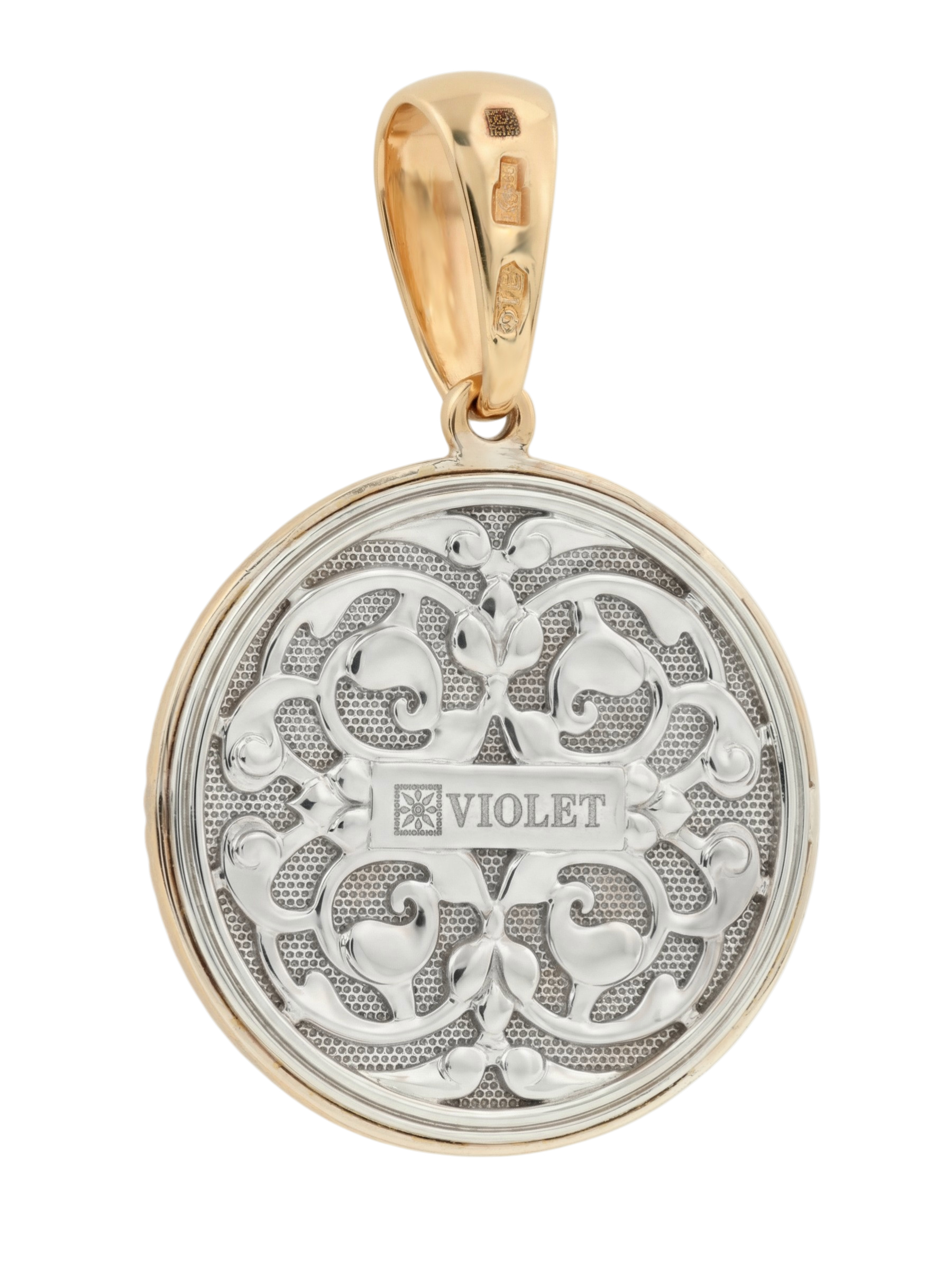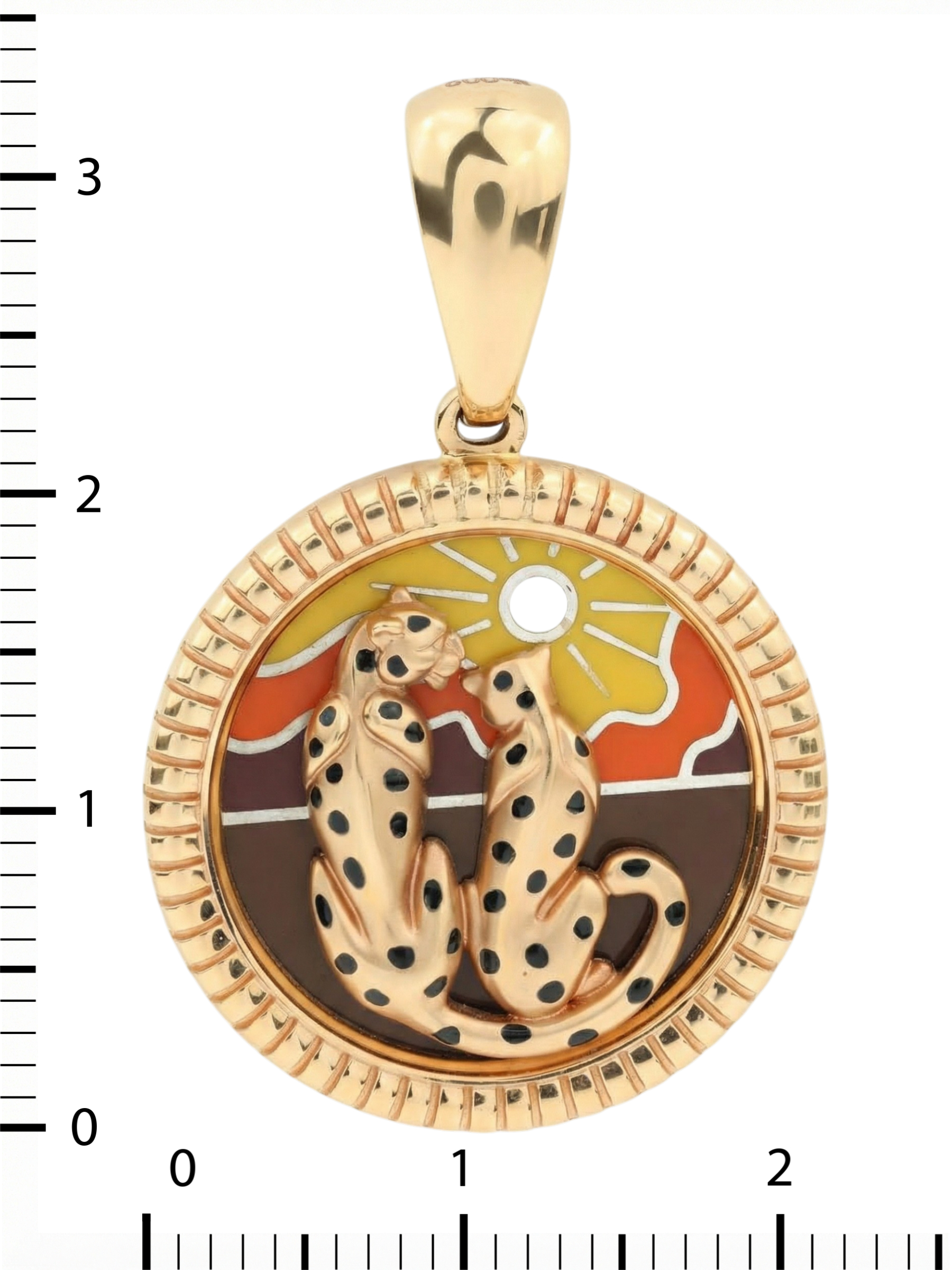 Особую художественную выразительность украшению придает разноцветная эмаль, создающая живописный фон в виде рассвета или заката. Сочетание теплых оттенков эмали и блеска драгоценного металла превращает подвеску в настоящий арт-объект. Круглая форма изделия с рифленым кантом делает его гармоничным дополнением как повседневного, так и вечернего гардероба.