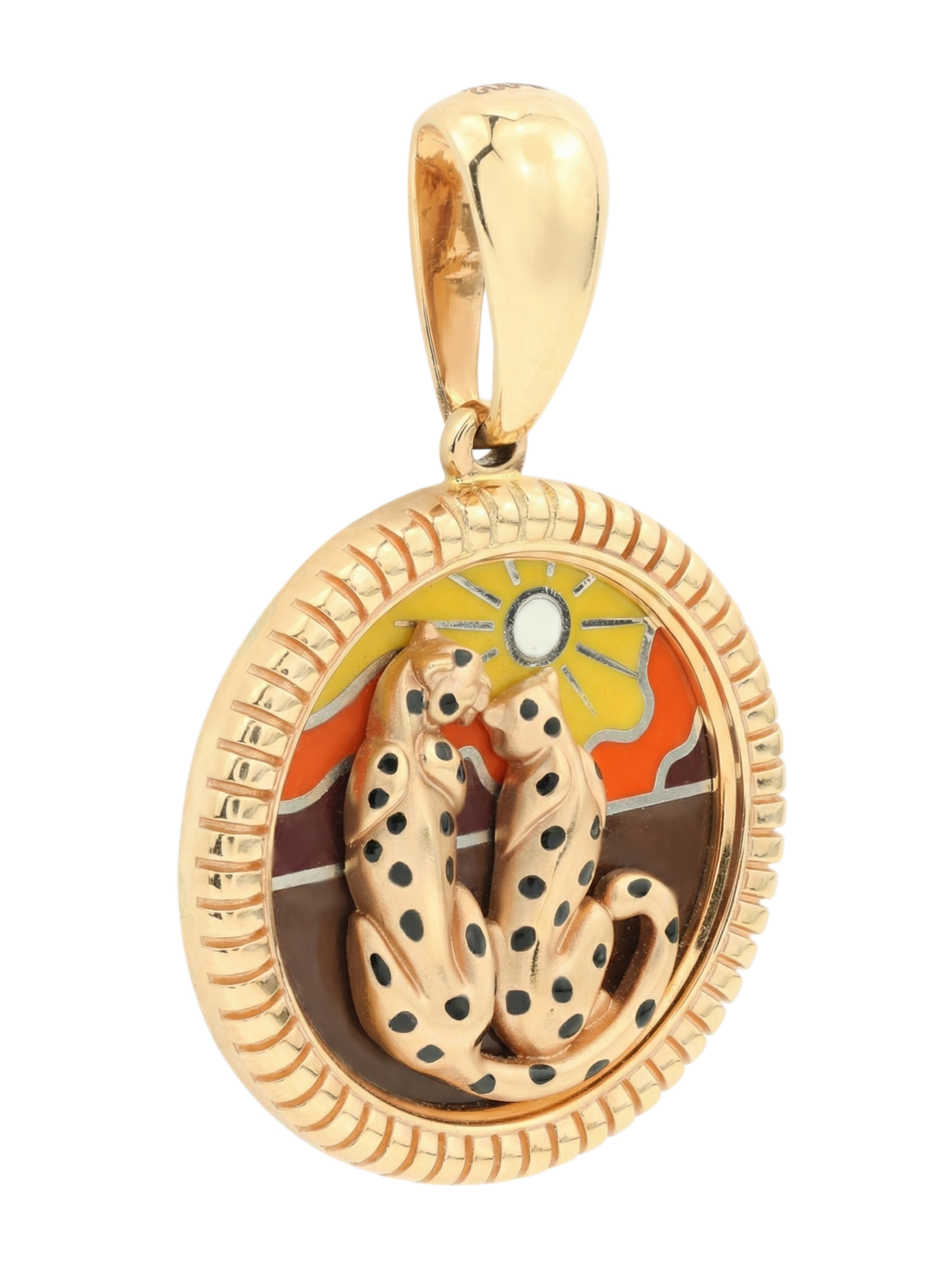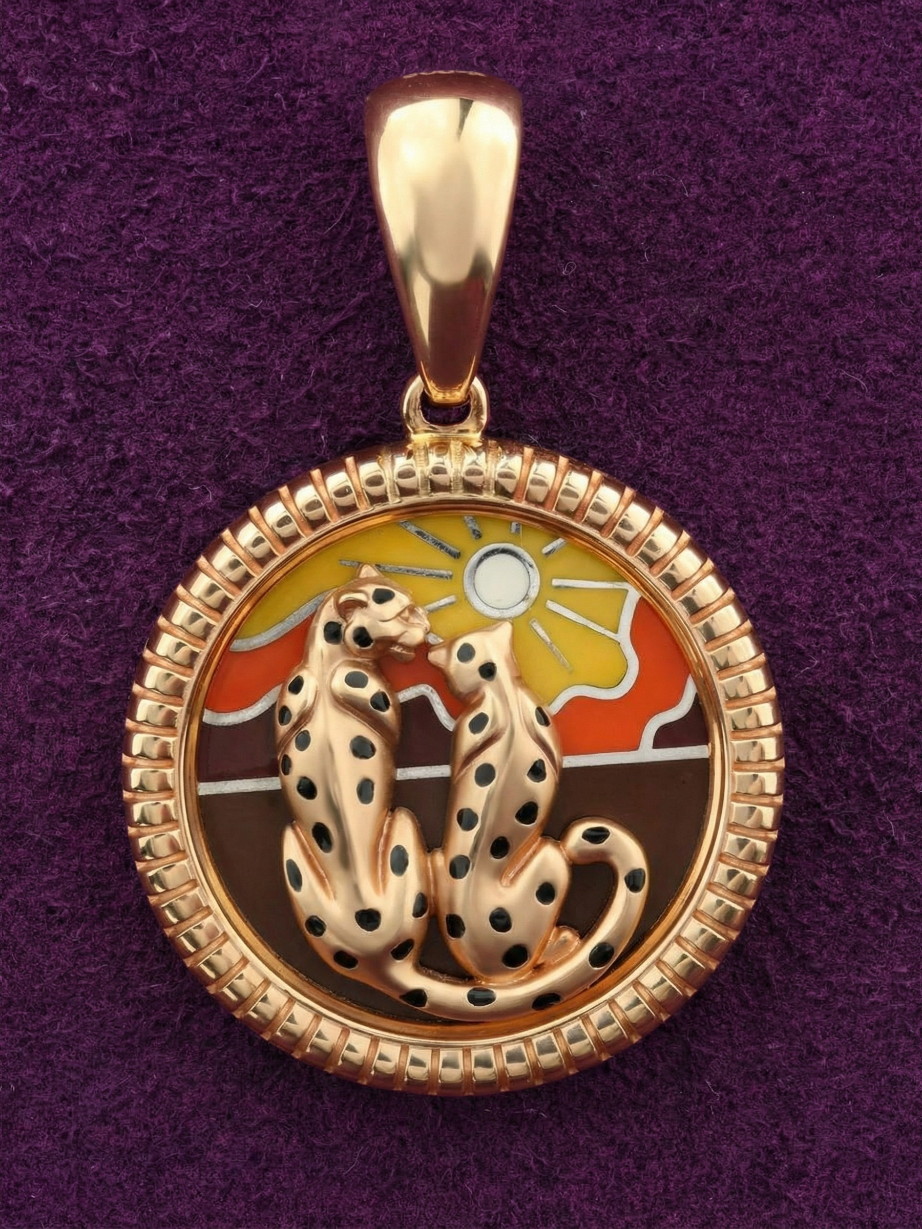 Эффектная подвеска из красного золота 585 пробы станет центральным акцентом вашего образа. Изделие входит в эксклюзивную коллекцию De luxe Premium — Леопарды — рассвет и закат, вдохновленную грацией и силой диких животных. Главным элементом дизайна выступают объемные фигуры двух леопардов, выполненные в золоте и дополненные детализированным рисунком. Контрастные пятна на их теле подчеркивают искусную проработку ювелиров.