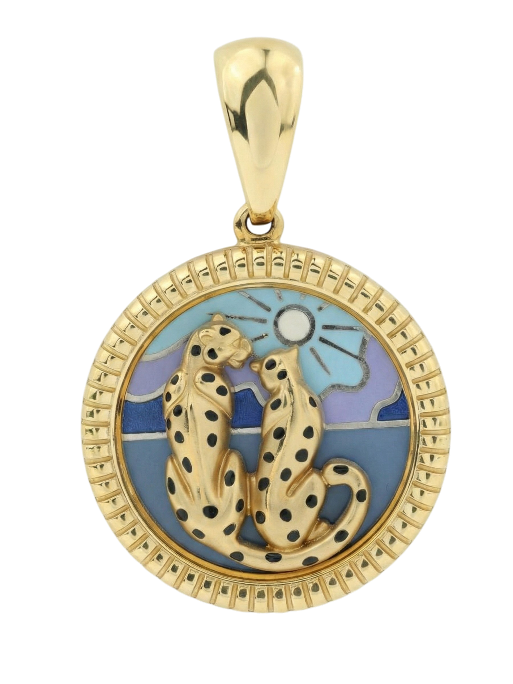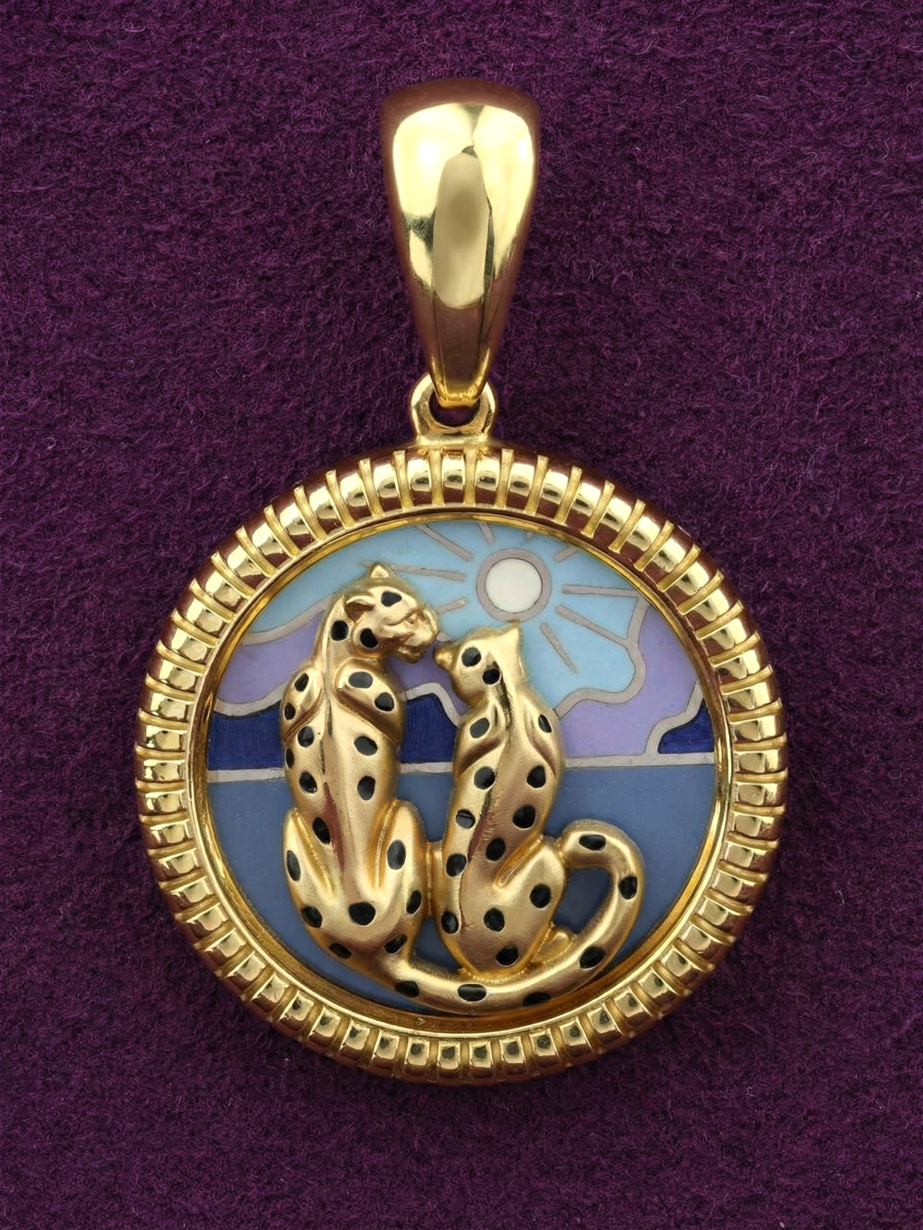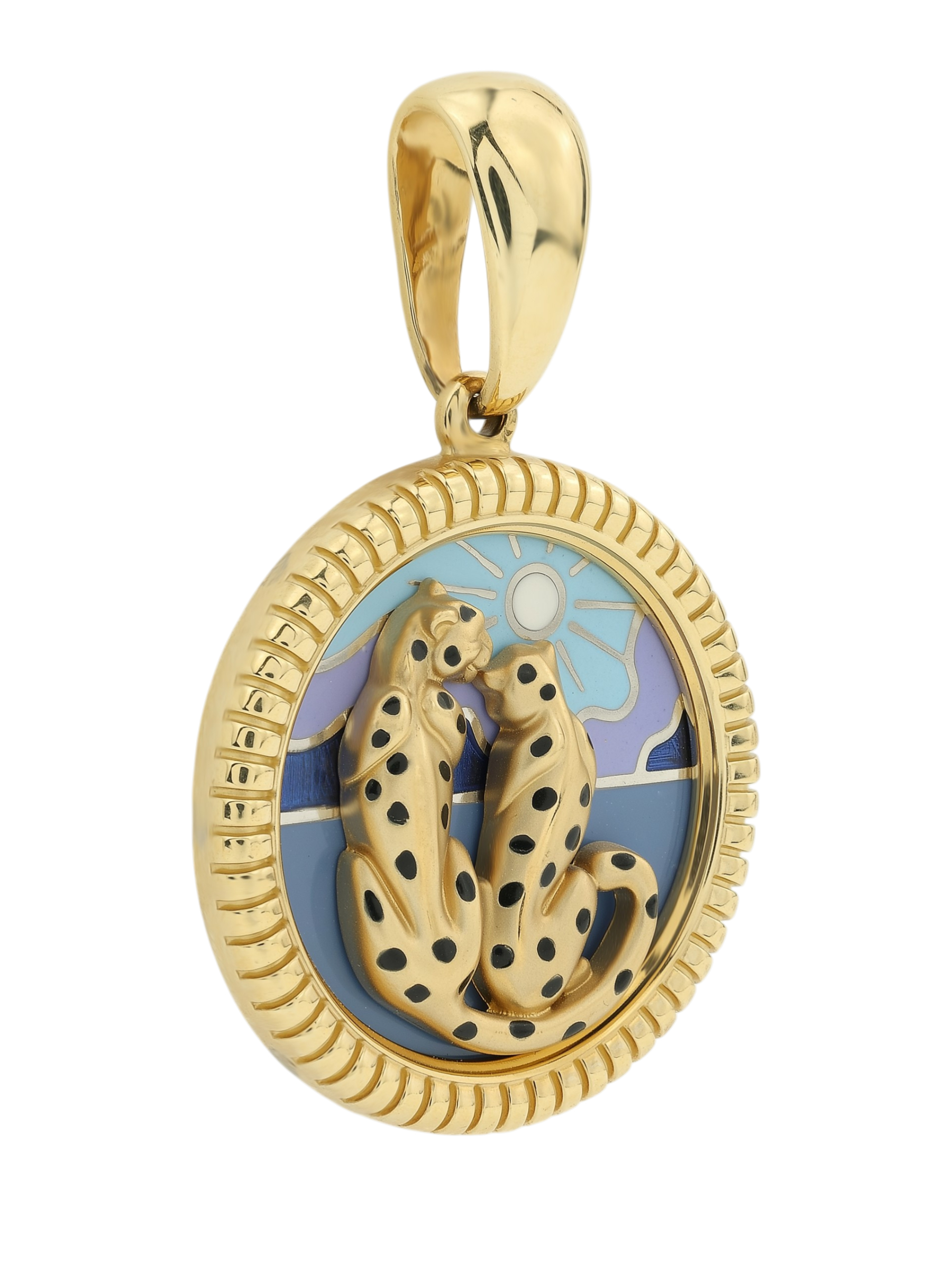 Элегантная подвеска из лимонного золота 585 пробы станет выразительным акцентом вашего образа. Изделие выполнено в рамках изысканной серии De luxe Premium — Леопарды — рассвет и закат, воплощающей грацию и природную красоту. Центром композиции является искусный дизайн с изображением двух леопардов — символа уверенности и силы. Фигуры хищников, выполненные из благородного лимонного золота, гармонично сочетаются с яркой художественной эмалью, создающей живописный фон в виде рассвета или заката.