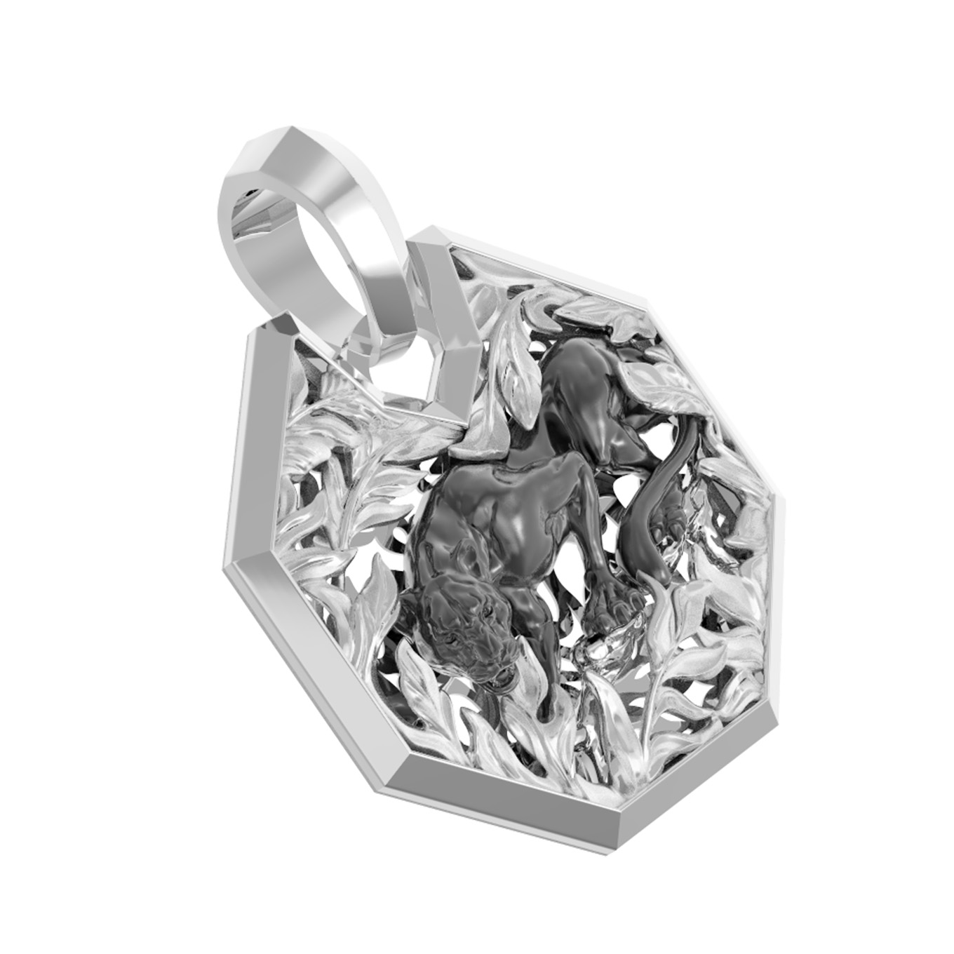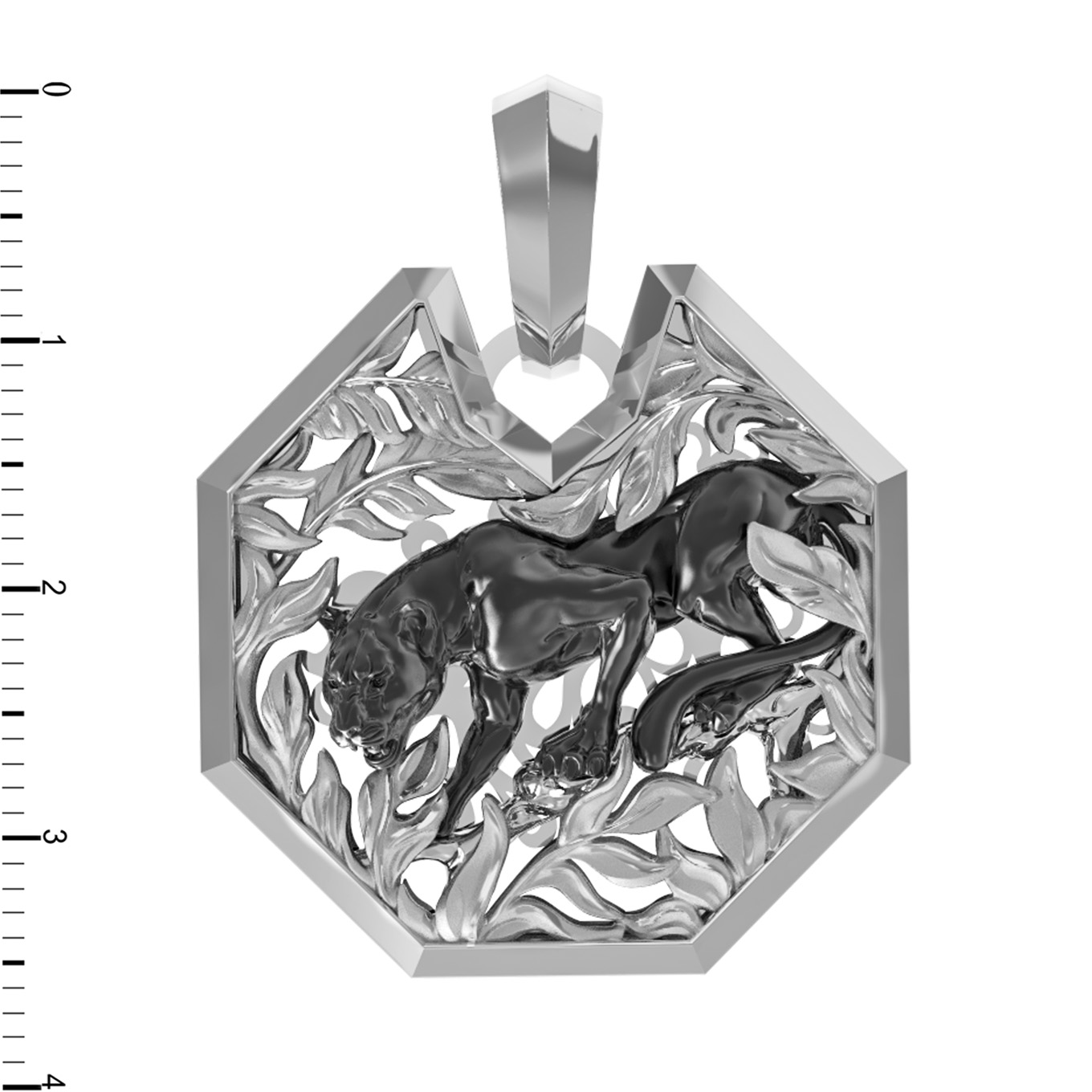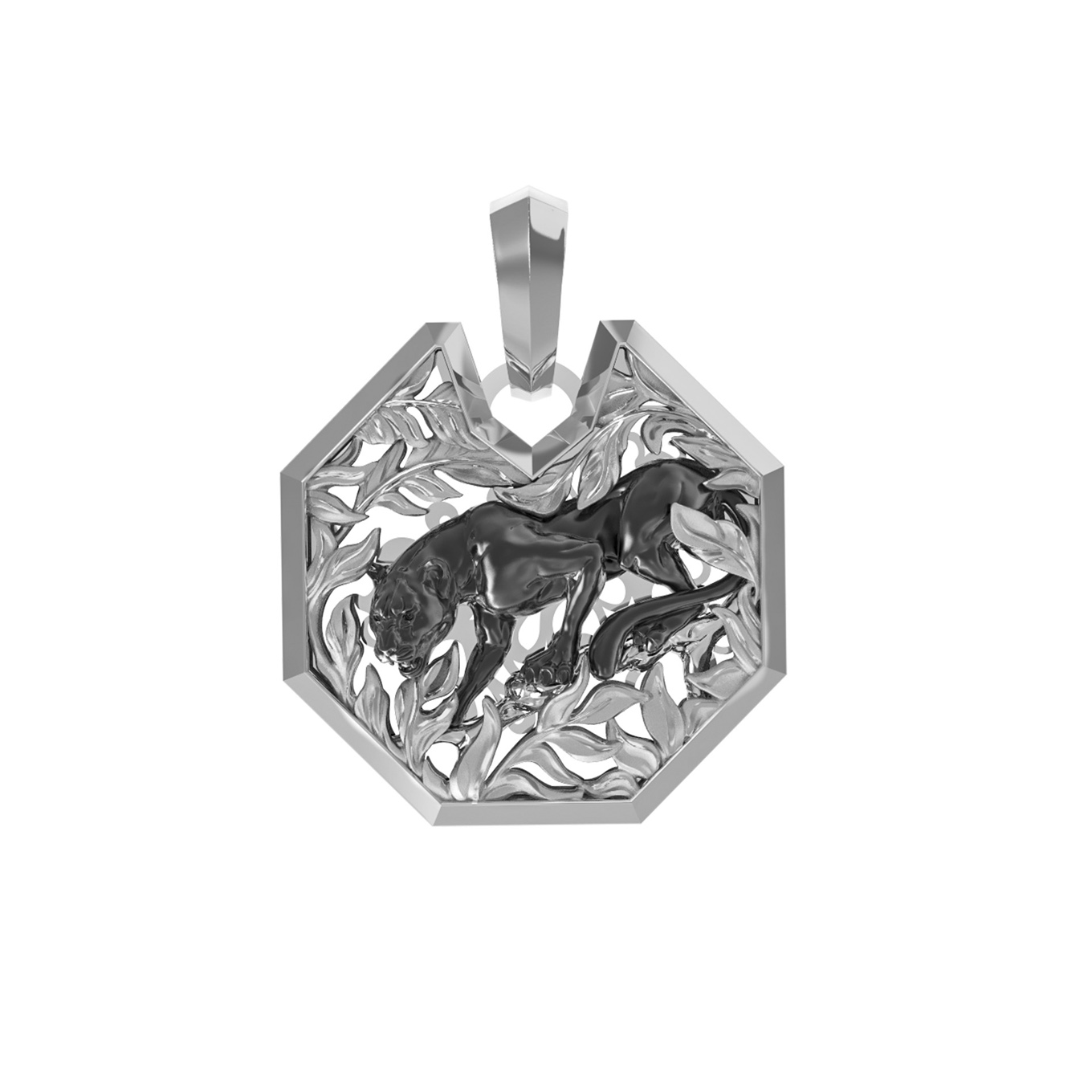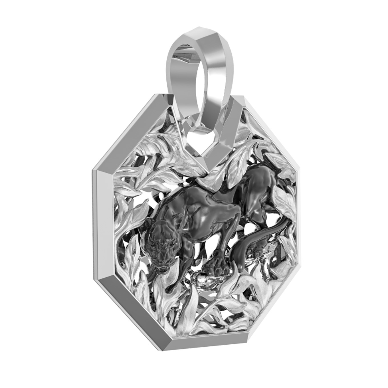 Мужская подвеска из белого золота 585 пробы из коллекции De Luxe — Пантера станет достойным дополнением вашего образа. Украшение выполнено с ювелирной точностью и отражает мощь и грацию хищника. Центральный элемент дизайна — пантеры — органично вписан в строгую геометрическую форму кулона, создавая эффект динамичного движения в густых зарослях джунглей. Контрастное исполнение деталей подчеркивает глубину рельефа и мастерство работы с благородным металлом.