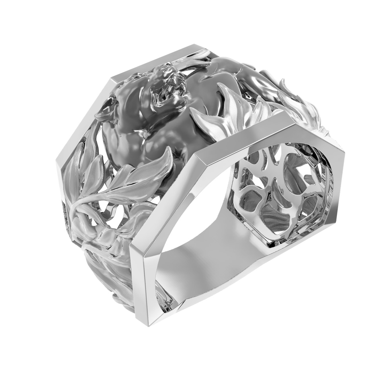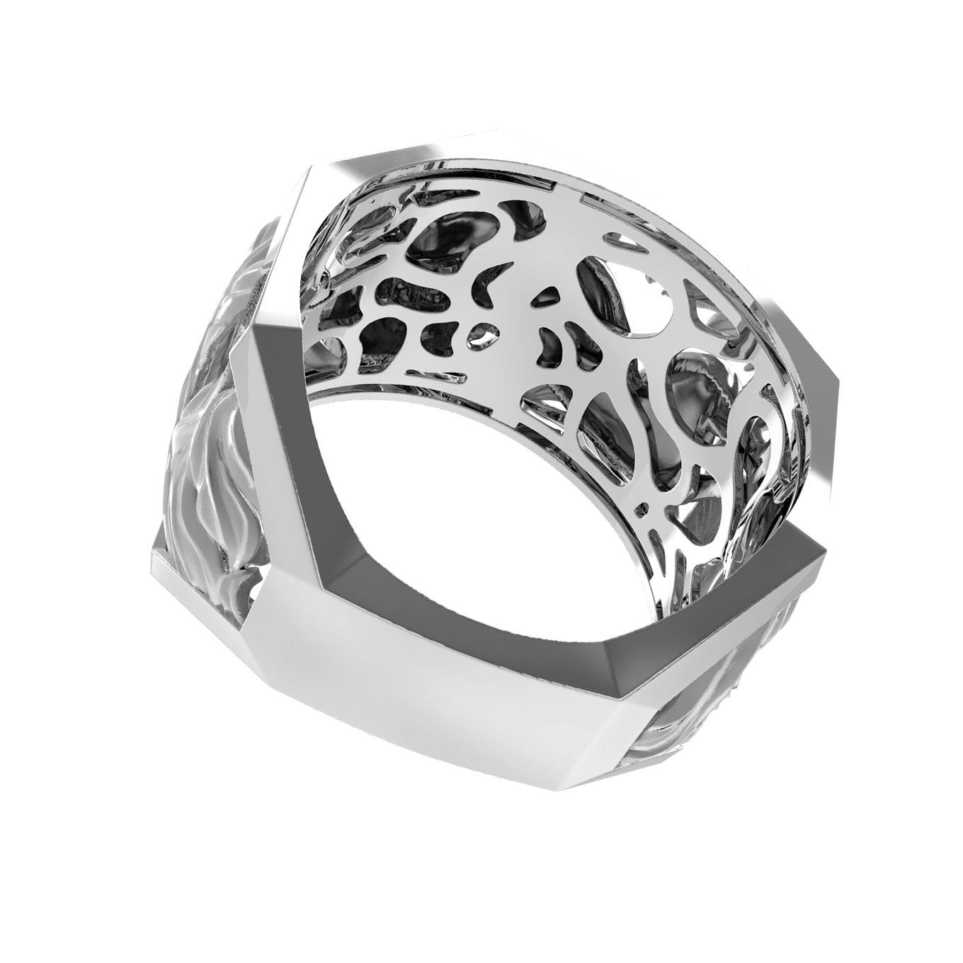 Благородный холодный блеск белого золота делает аксессуар универсальным: он гармонично смотрится как с деловым костюмом, так и с повседневным стилем одежды. Кольцо обладает широкой шинкой, обеспечивающей комфортную посадку на пальце, и отличается надежностью конструкции. Это достойный выбор для тех, кто ценит статусность и предпочитает аксессуары с характером.