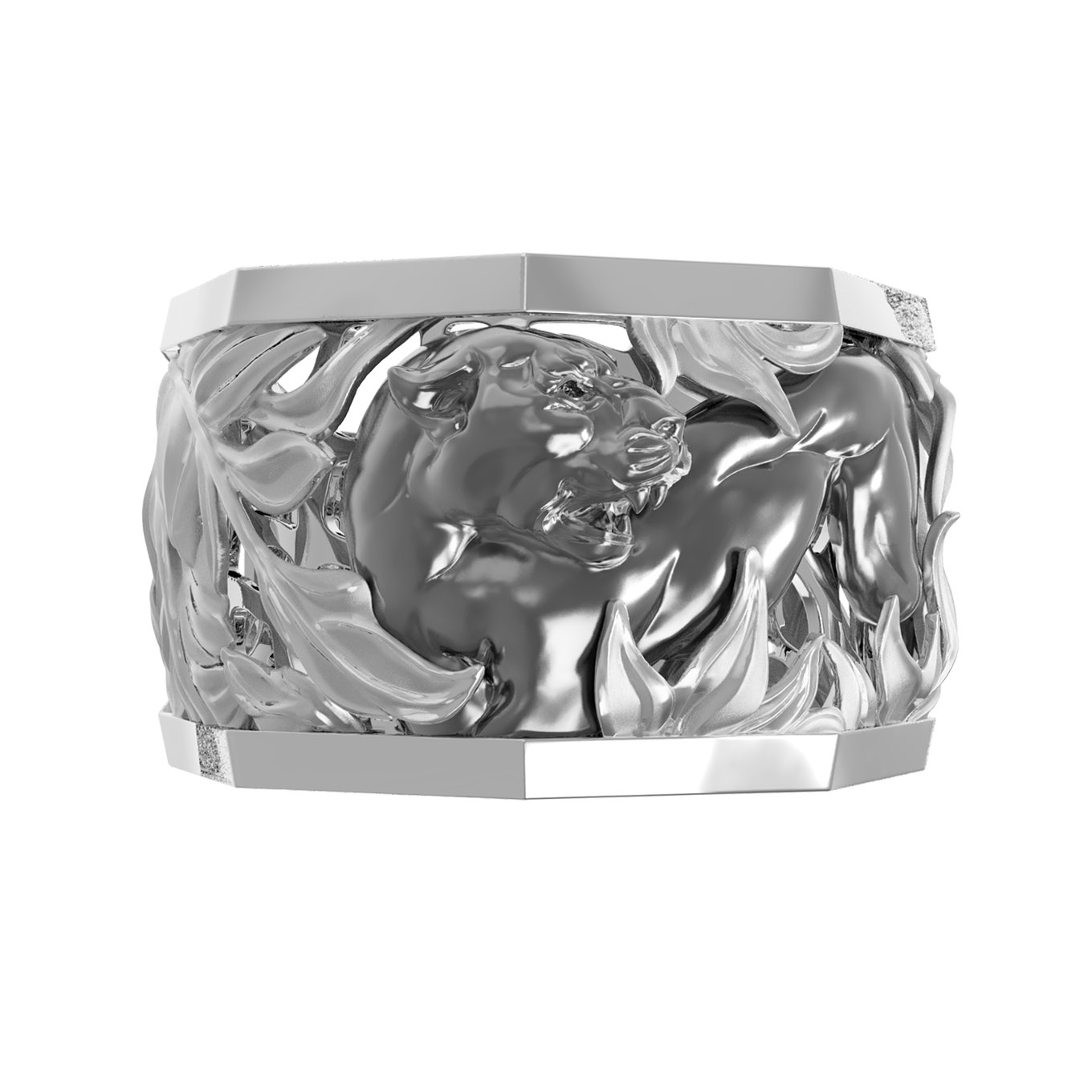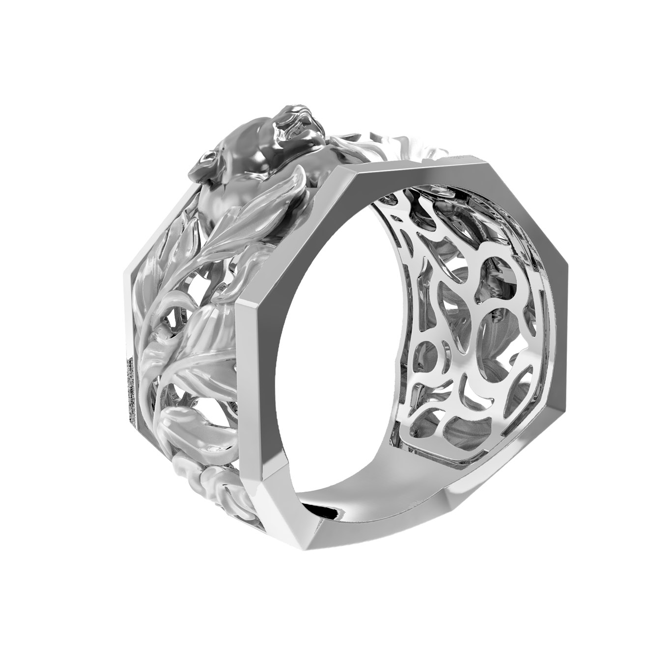 Эффектное мужское кольцо из белого золота 585 пробы станет ярким дополнением образа уверенного в себе человека. Это украшение из серии De Luxe — Пантера выполнено в выразительном анималистическом дизайне: центральным элементом декора выступает фигура хищной пантеры, органично вписанная в сложный растительный орнамент. Глубокая проработка деталей подчеркивает мастерство исполнения и придает изделию динамичный, агрессивный характер.