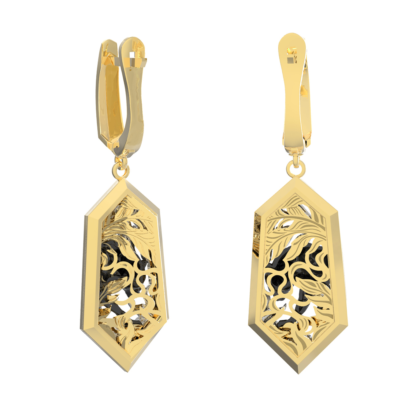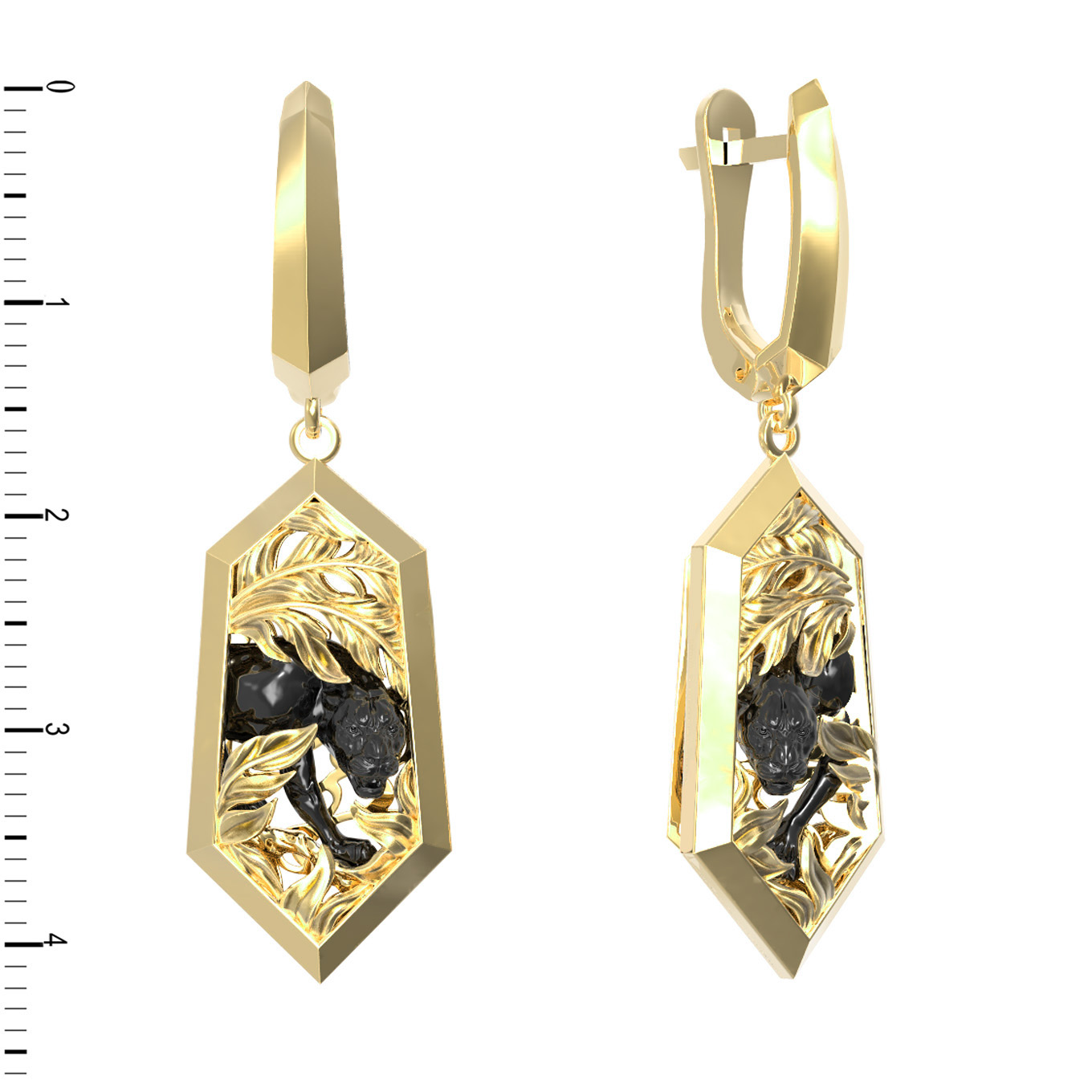 Центральным элементом композиции является искусная фигура пантеры, окруженная ажурным растительным орнаментом. Контрастное сочетание золота и темных элементов пантеры/пумы придает серьгам особую выразительность и глубину. Четкие грани подвесной части гармонично сочетаются с надежным английским замком, обеспечивая комфортную и безопасную посадку.