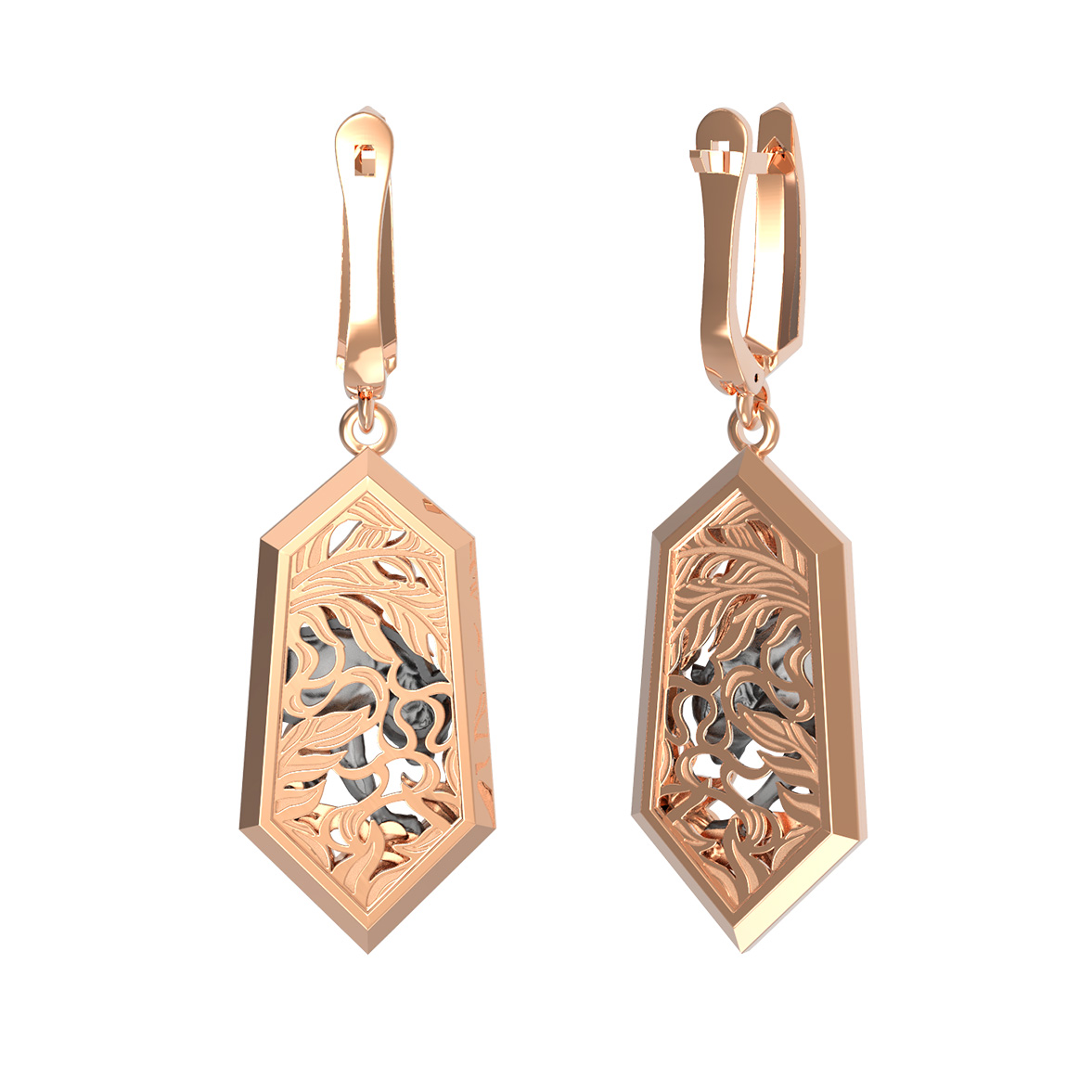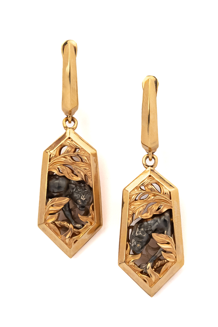 Центральным элементом композиции стал сложный и детально проработанный дизайн с изображением пантеры. Хищный силуэт пумы, скрытый в густых зарослях джунглей, придает изделию динамику и таинственность. Каждая линия в этих серьгах из красного золота продумана до мелочей, создавая эффект объема и глубины, который притягивает взгляды. Искусная работа ювелиров делает это украшение ярким акцентом любого образа.