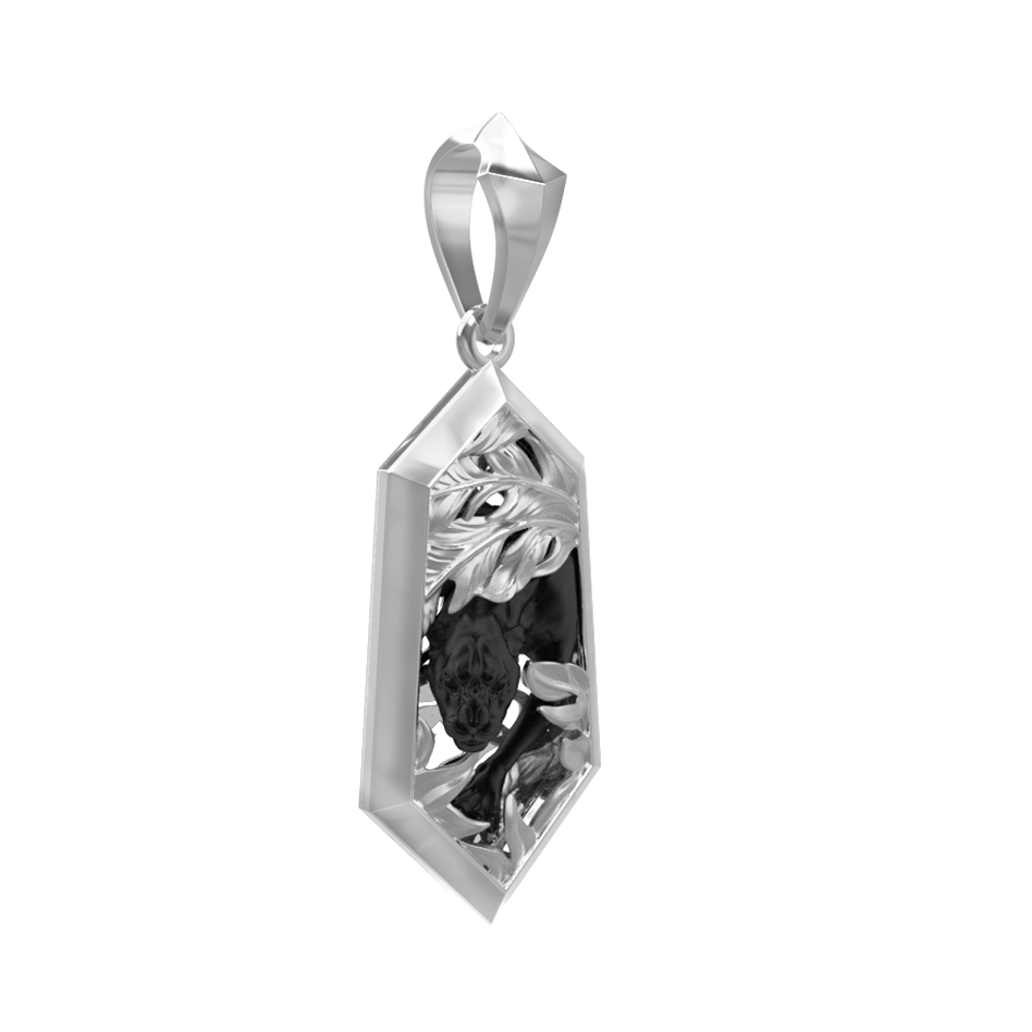 Мужская подвеска из белого золота 585 пробы из коллекции De Luxe — Пантера — это воплощение уверенности, грации и статуса. Центральный элемент дизайна — детально проработанное изображение пантеры, которое словно затаилось в гуще стилизованных тропических листьев. Этот хищник, выполненный с высокой точностью, символизирует скрытую силу, решительность и природную мощь, свойственную мужскому характеру.