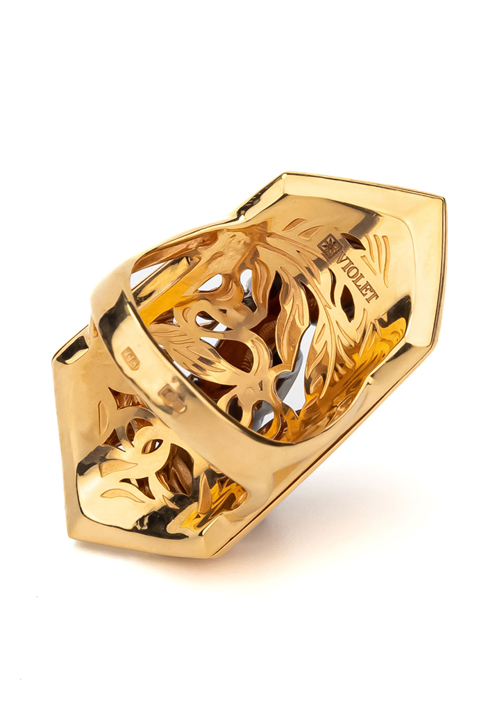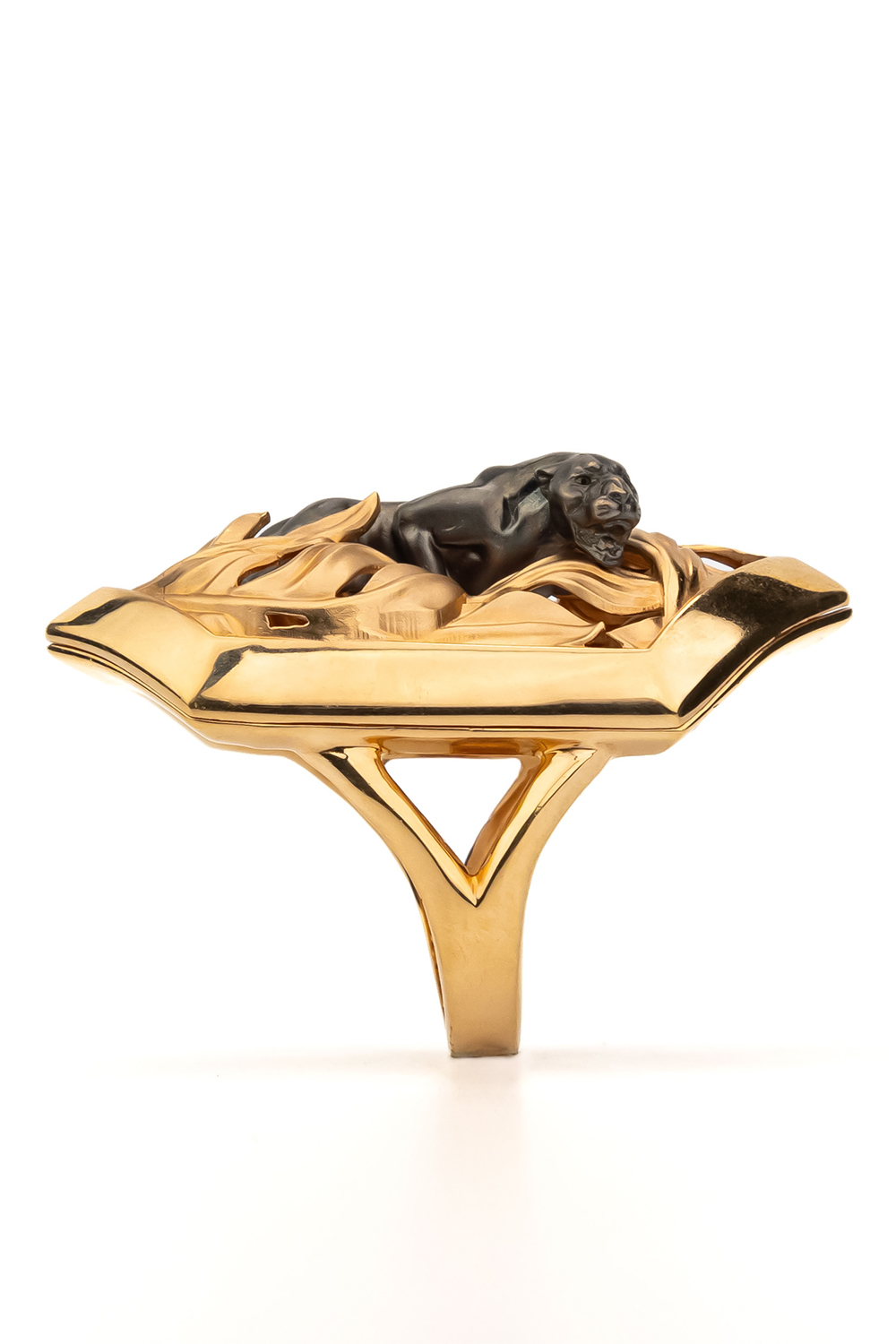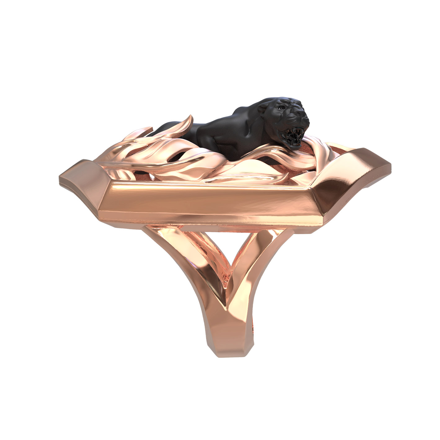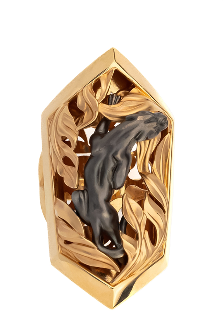 Основа кольца выполнена из красного золота 585 пробы, что обеспечивает изделию благородный теплый оттенок и долговечность. Контрастное исполнение — сочетание блеска красного золота и темного силуэта пантеры — придает аксессуару объем и особую выразительность. Дизайн с элементами растительного декора вокруг фигуры хищника создает гармоничную композицию, которая одинаково эффектно смотрится на руке.