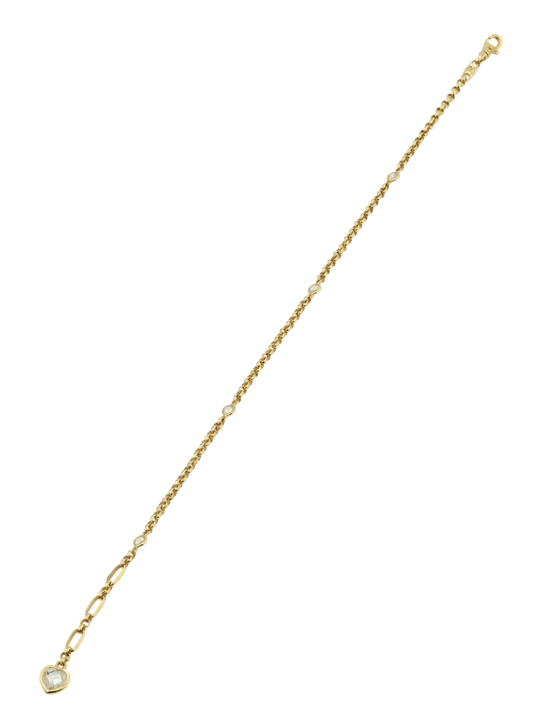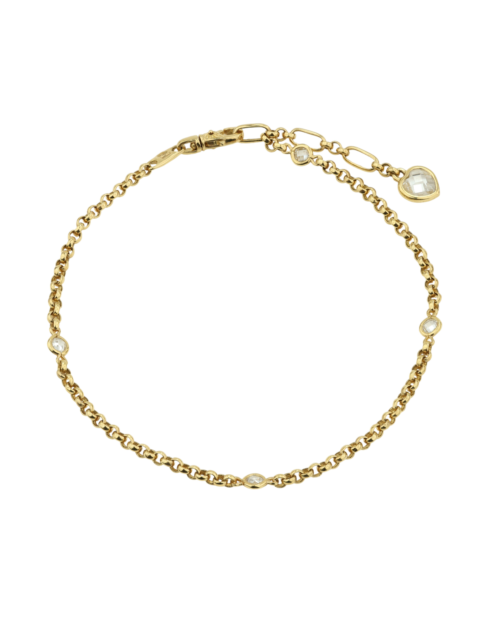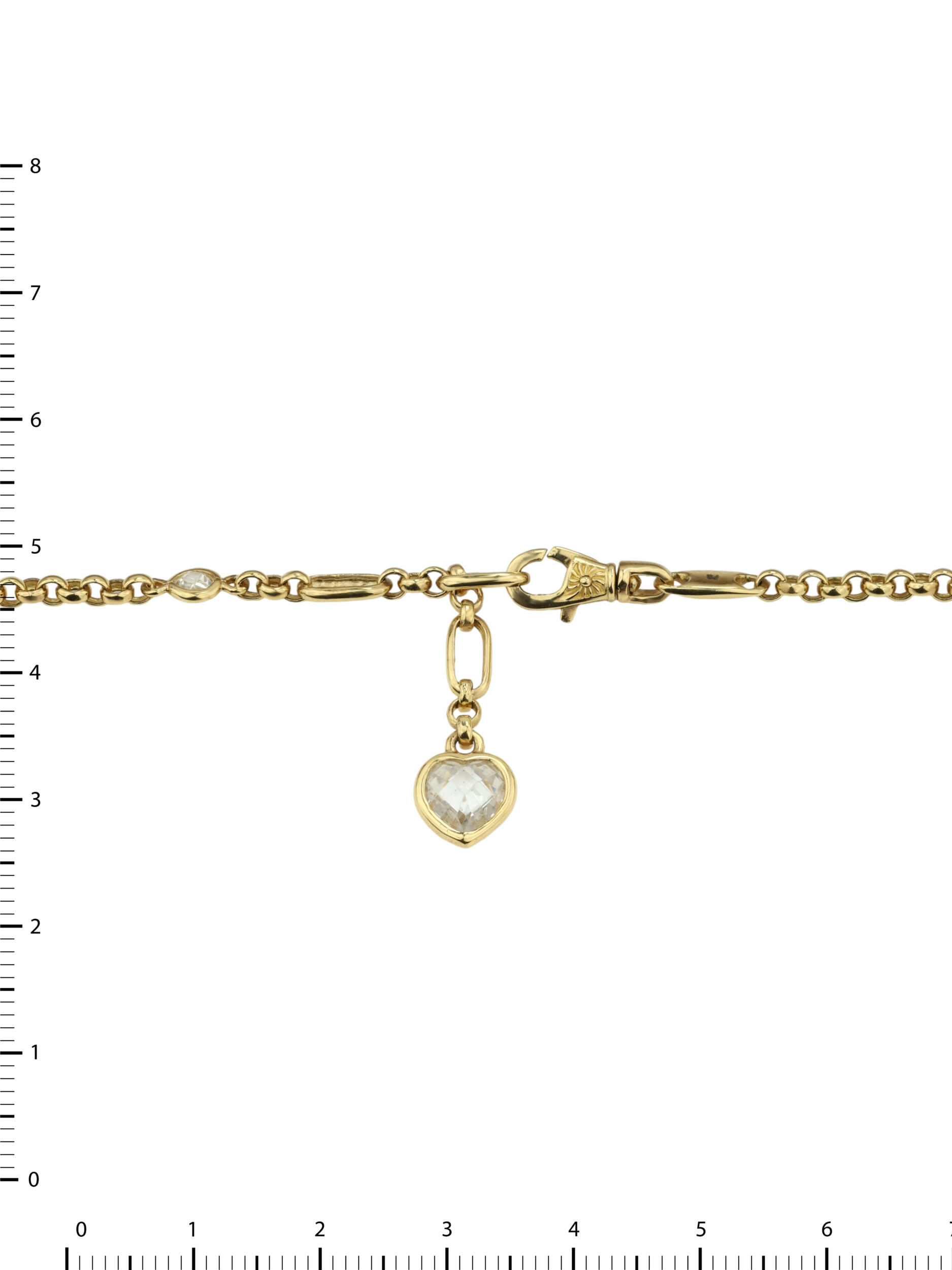 Центральным элементом композиции выступают 5 вставок из фианита, которые создают игру света при каждом движении. Вставки белого цвета имеют две формы — круг и сердце, что добавляет браслету утонченности и романтичного настроения. Гармоничное сочетание теплых тонов золота и чистоты камней делает этот аксессуар универсальным дополнением к любому гардеробу.