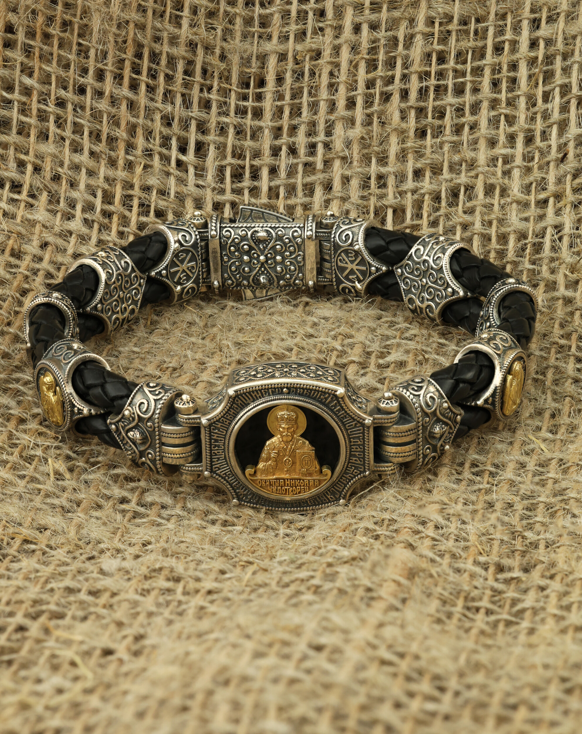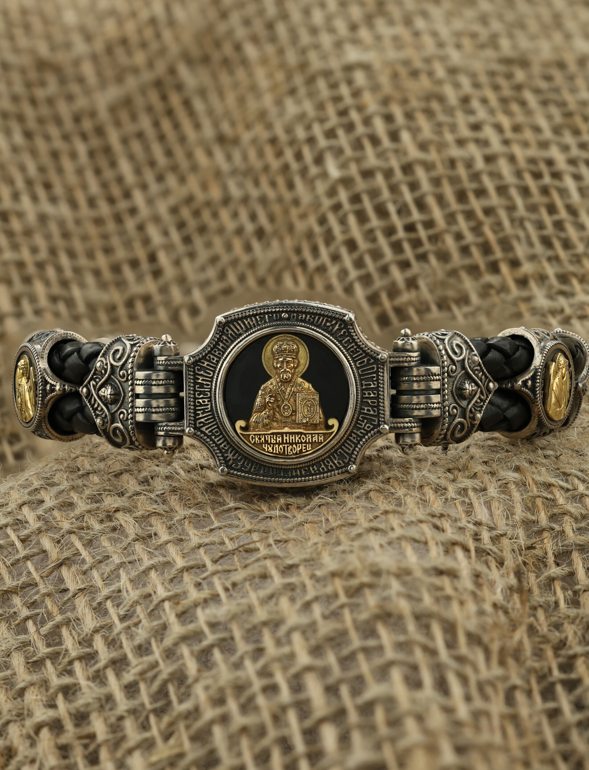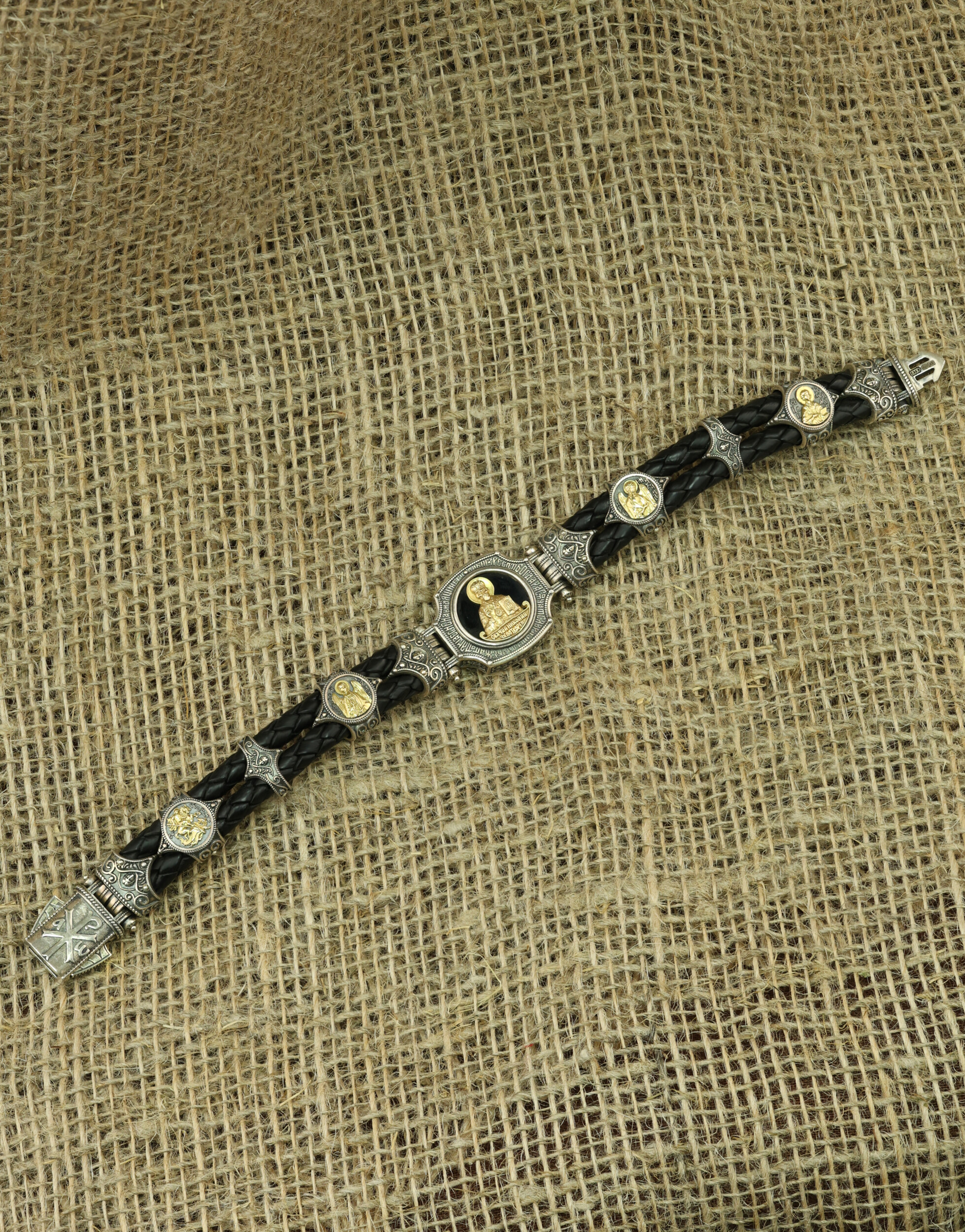 Браслет из серебра и золота c кожаным шнурком и ониксом