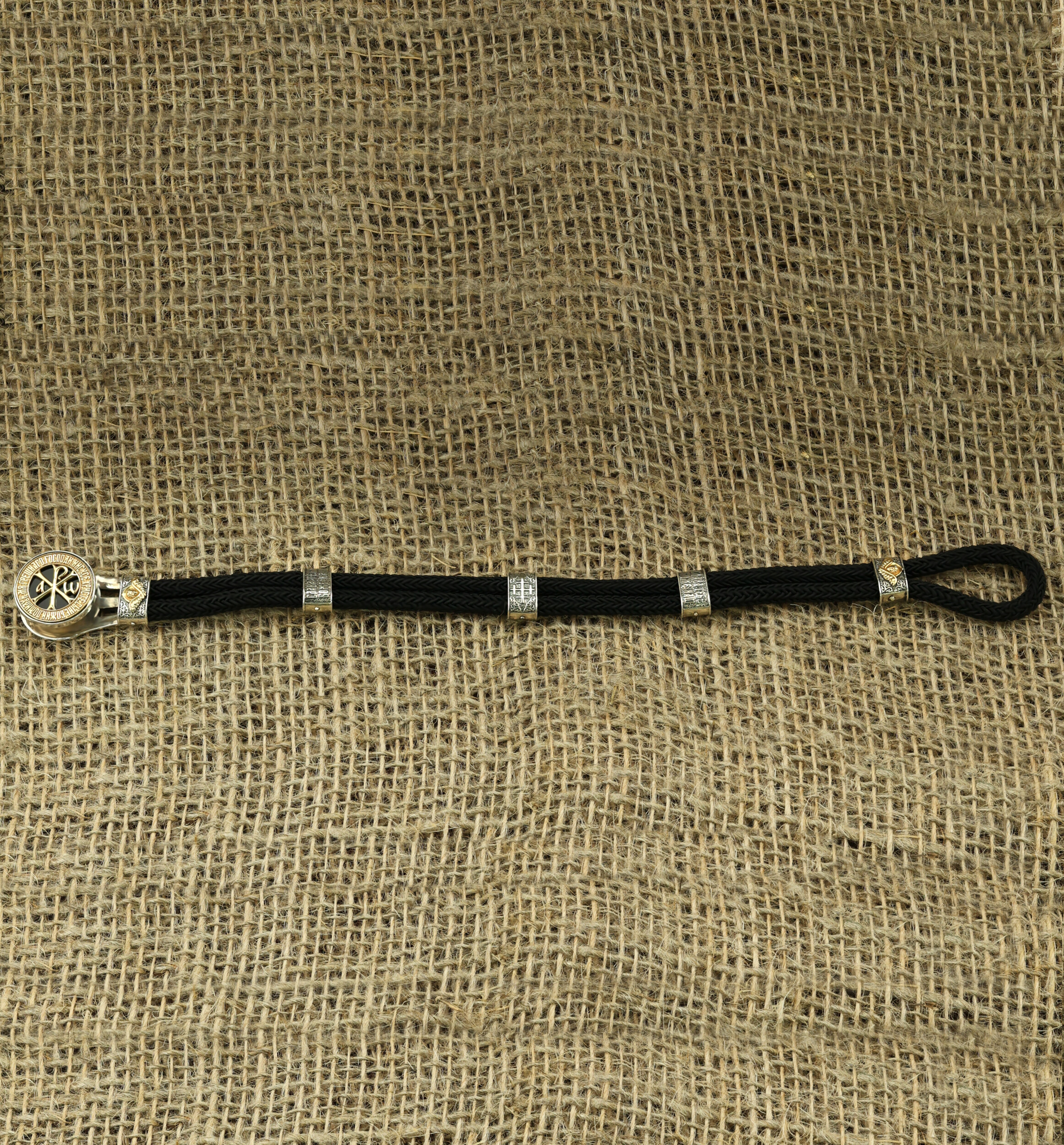 Именно монограмму Спасителя увидел Константин Великий перед битвой и был настолько воодушевлен, что отдал приказ поместить Хризму на все свои штандарты. После чего одержал победу. С тех самых пор каждый верующий чувствует на себе ее силу. Она состоит из двух букв —Х («хи») и Р («ро»). По краям монограммы мы видим буквы «альфа» и «омега». Они также символизируют Христа, отсылая нас к к тексту Откровения: «Аз есмь Альфа и Омега, начало и конец, говорит Господь, Который есть и был и грядет, Вседержитель» (Откр 1:8). По контуру размещены слова Иисусовой молитвы: «Господи, Иисусе Христе, Сыне Божий, помилуй мя, грешнаго». Также браслет украшен двумя вставками с изображением Херувимов, вставкой с изображением Креста и двумя вставками с молитвой: «Слава тебе, Боже наш».