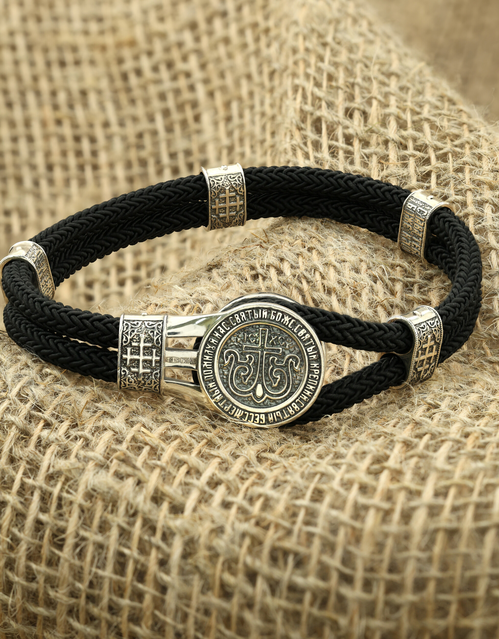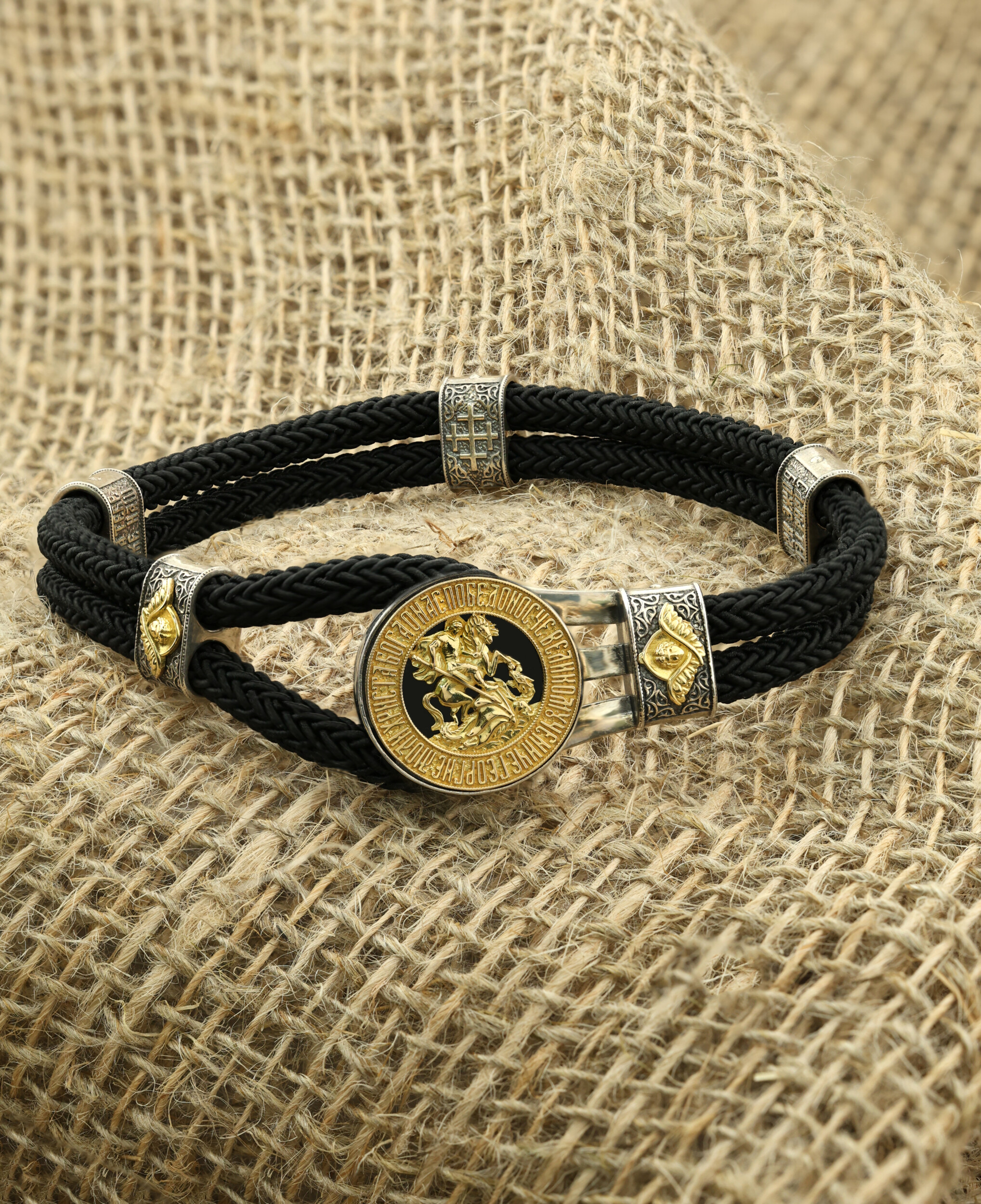 Основой композиции браслета является изображение Святого Великомученика Георгия Победоносца — одного из самых почитаемых и удивительных святых. Георгий родился в Каппадокии (Малая Азия) в семье богатых и знатных горожан. Юношей поступил на службу к римскому императору Диоклетиану, за отличное знание военного дела и проявленную в боях и походах храбрость был приближен к императору и удостоен высокого воинского звания. Во время начавшихся гонений на христиан, перешел на сторону гонимых и, отвергнув человеческий страх, стал ярым проповедником учения Христа. Мучители подвергли опального воеводу жесточайшим восьмидневным пыткам и казнили его (обезглавили) в возрасте около тридцати лет в 303 году. На образке Георгий изображен как воитель, сидящий на вздыбленном коне и поражающий копьем огнедышащего змея. Змей символизирует собою сатанинские силы. Молитвами вознесенными к Всевышнему и своей непреклонной верой, он смог одолеть чудовище. Согласно преданию, святой убил змея, спас царскую дочь, принесенную в жертву, и жителей города, их души от влияния дьявола, породив в них надежду и веру в Господа, призывая людей принять христианскую веру. По контуру образа, имеющего круглую форму, размещены слова молитвы: «Победоносче великомучениче Георгие, моли Христа Бога о нас». Также браслет украшен двумя вставками с изображением Херувимов, вставкой с изображением Креста и двумя вставками с молитвой: «Слава тебе, Боже наш».